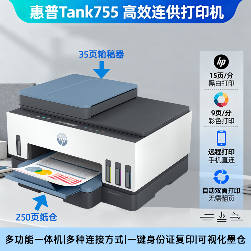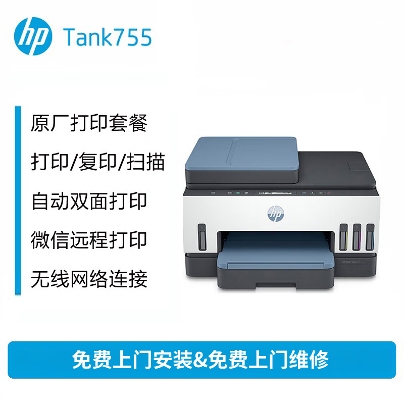 惠普(HP)755打印机家用无线双面打印 喷墨连供彩色打印复印扫描 墨仓办公远程打印单页成本1分钱8000印