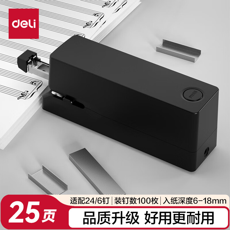 得力(deli)双电源电动自动订书机/订书器电子装订订书机大号平钉省力 适配24/6钉 办公用品 黑色0489