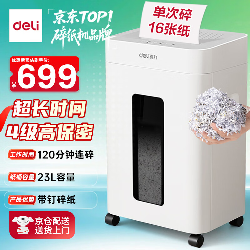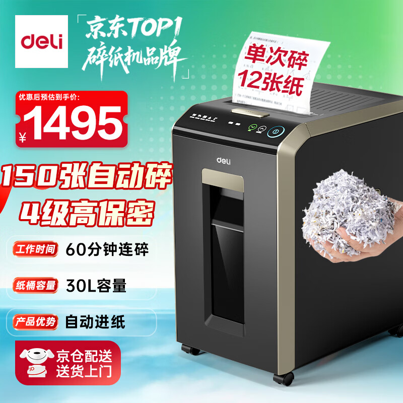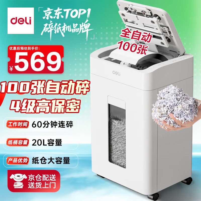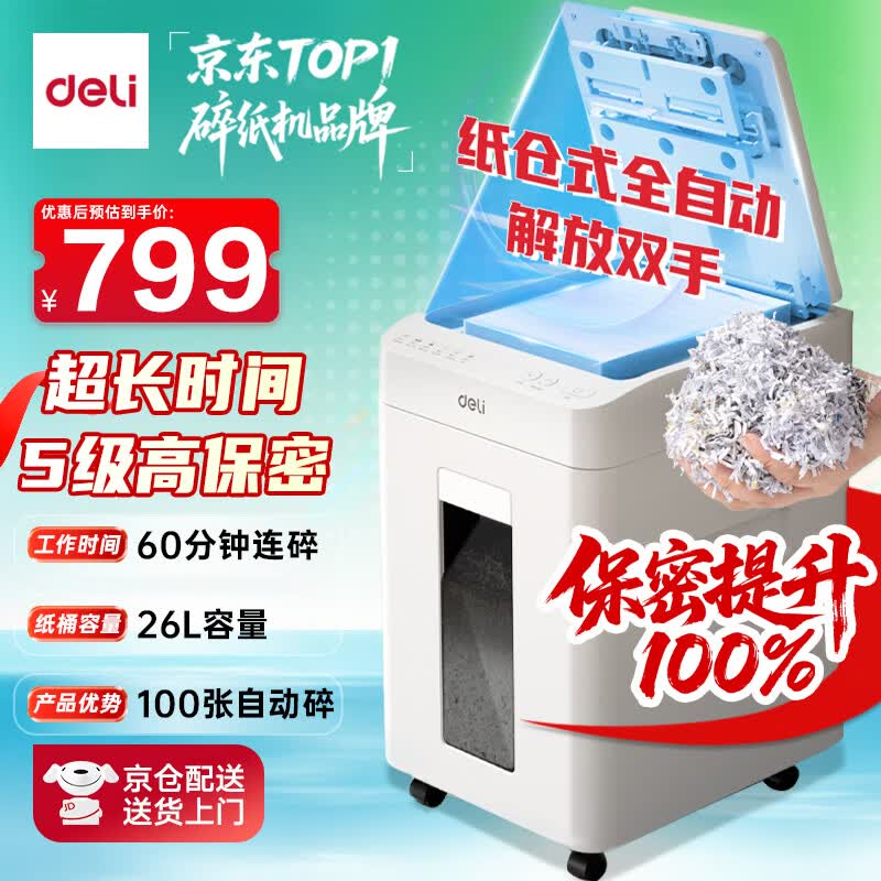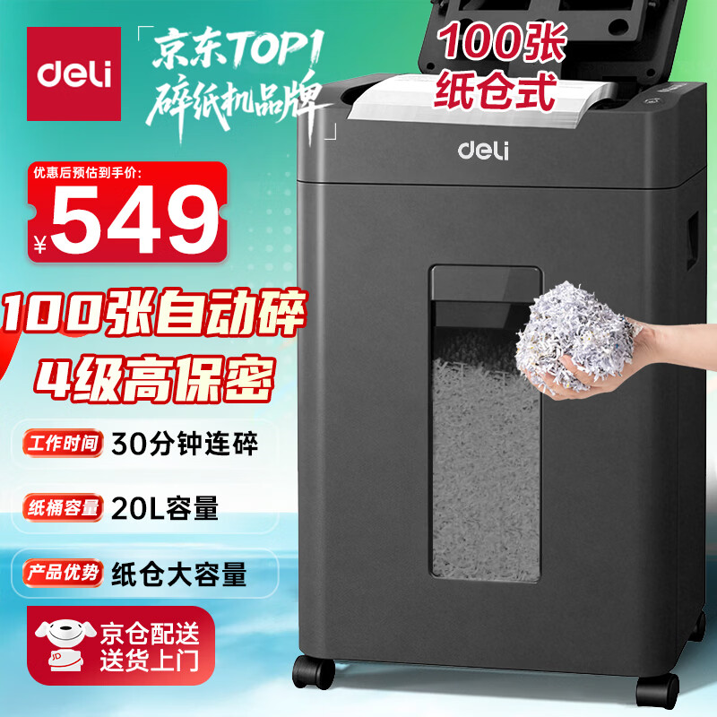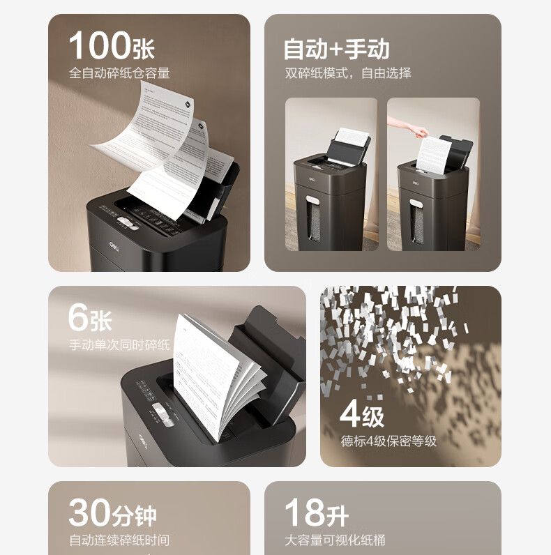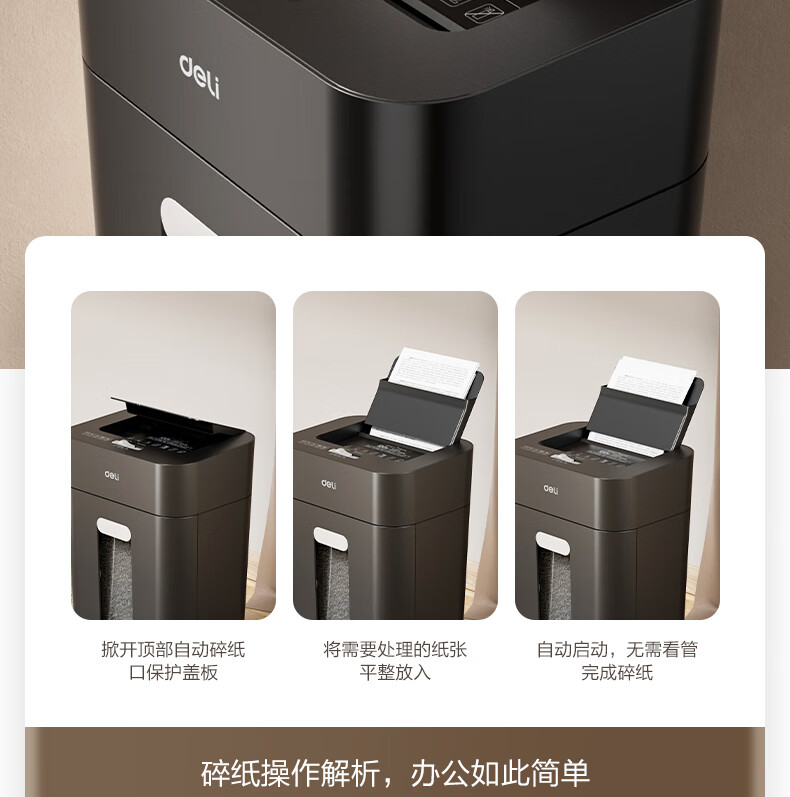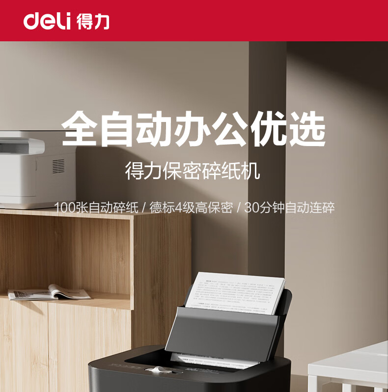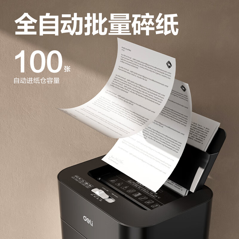得力自动碎纸机100张30分钟连碎4级保密大型强力办公室专用文件粉碎机 18L托盘式14501