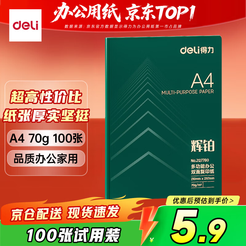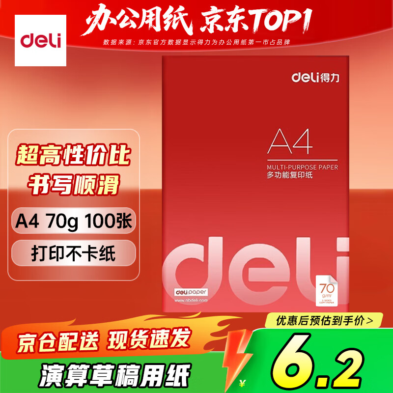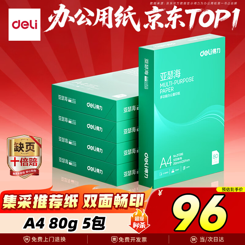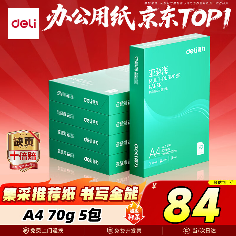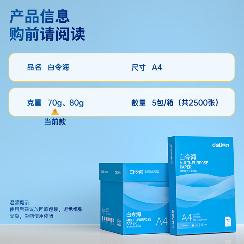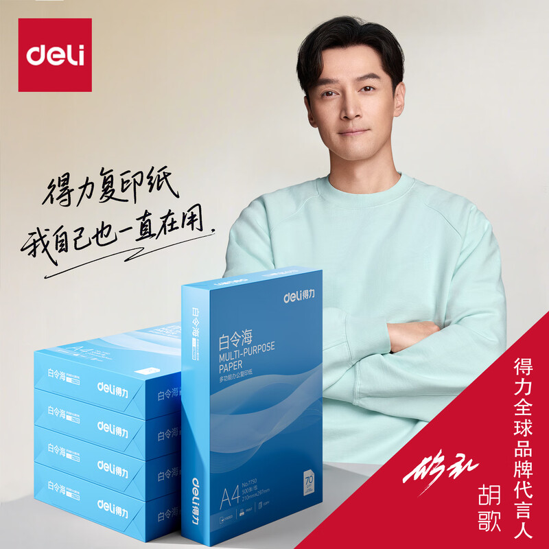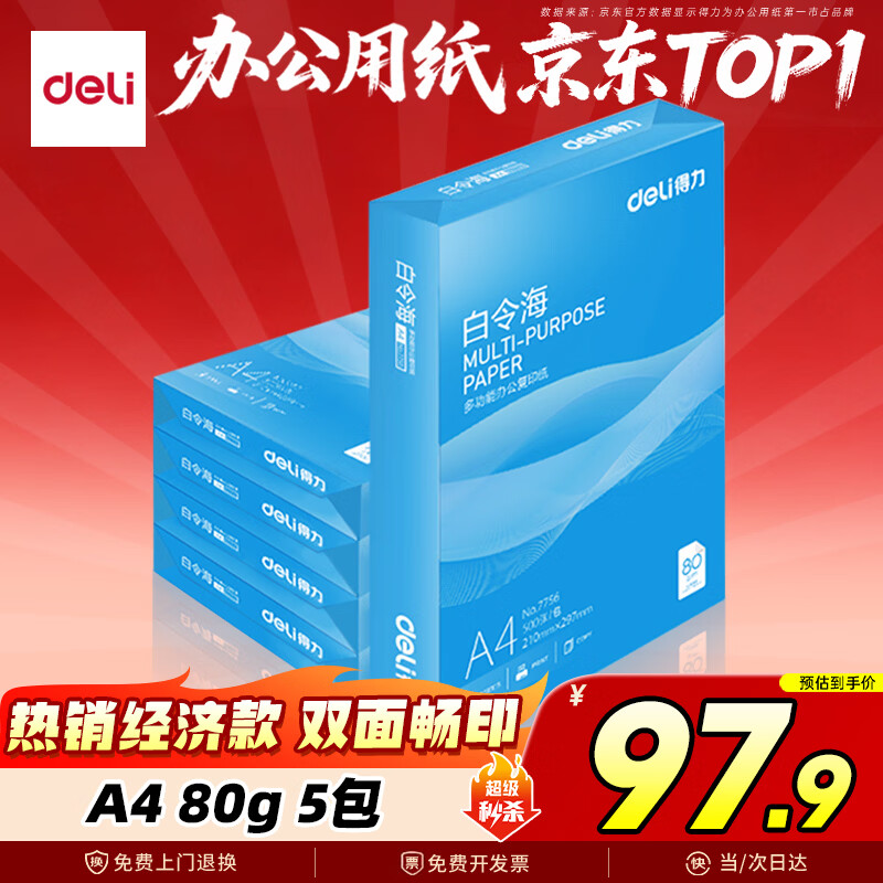 得力(deli)白令海A4打印纸 70g500张*5包一箱 双面复印纸 入选纸类金榜 整箱2500张 7753【经济热销】