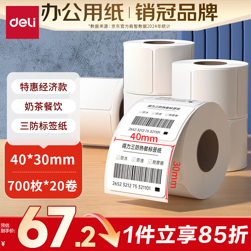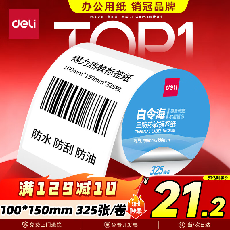 得力(deli)100*150mm 325张*12卷 白令海三防热敏标签纸 快递面单不干胶条码纸12208【适配4寸标签机888B等】