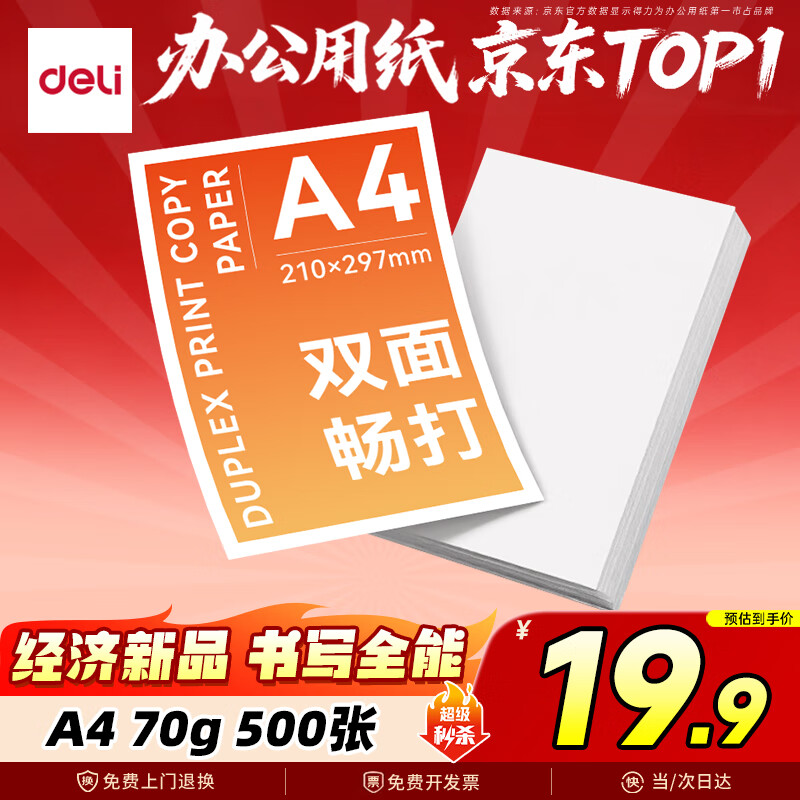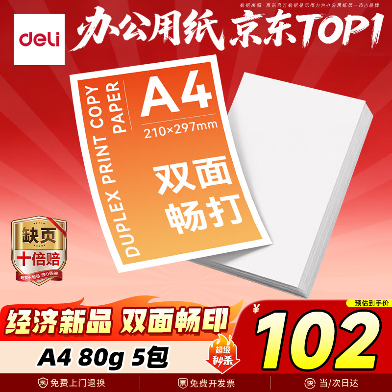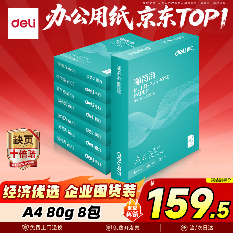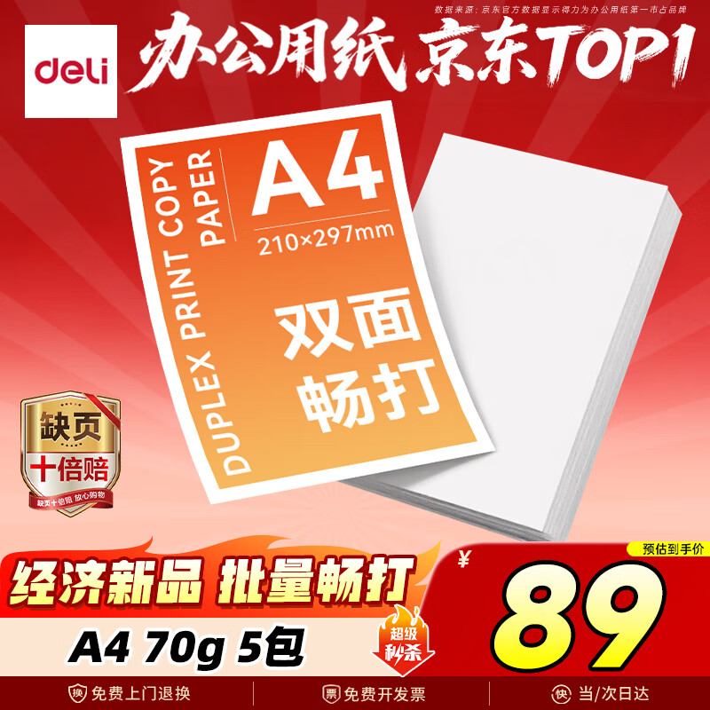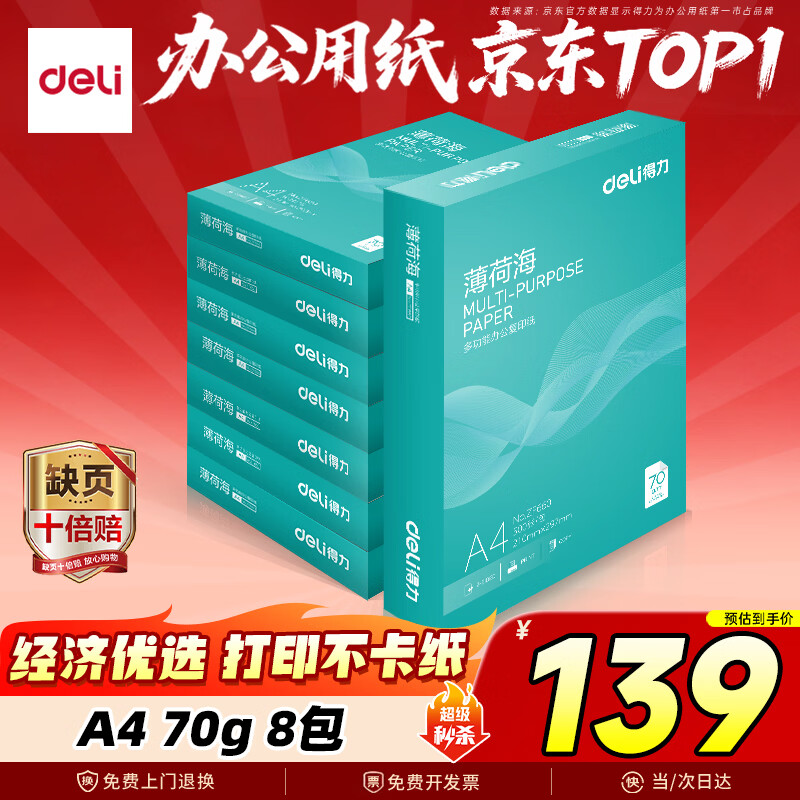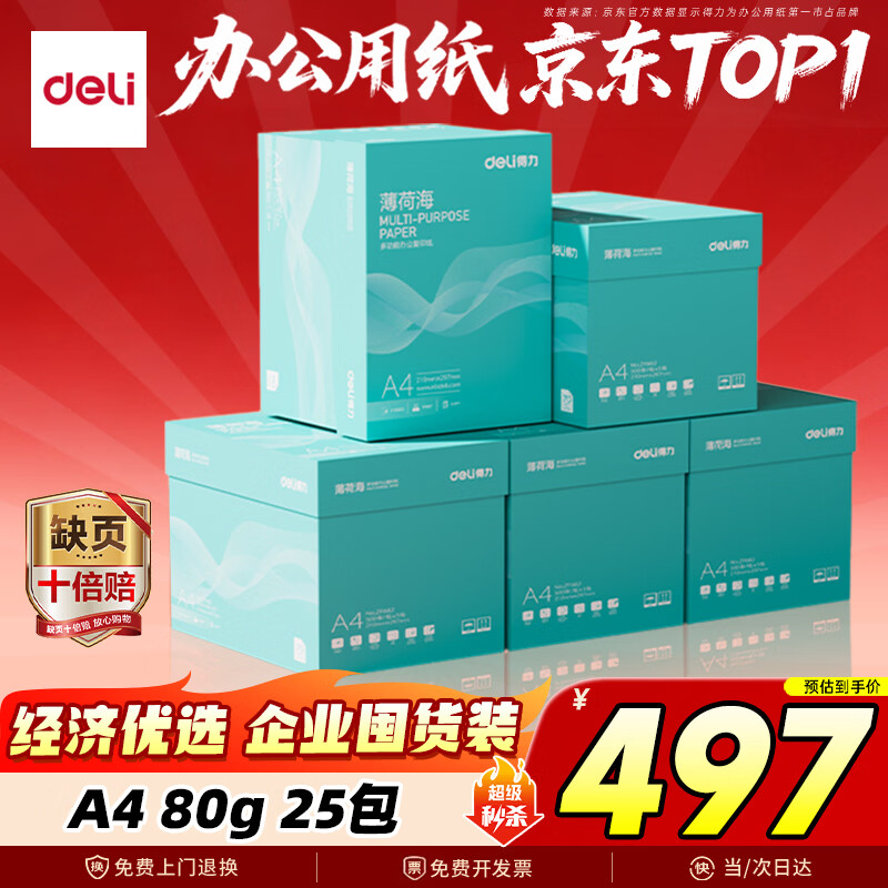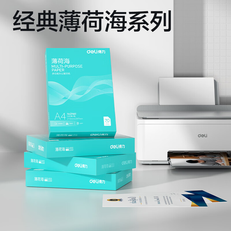 得力(deli)薄荷海A4打印纸 70g500张*5包一箱 双面复印纸 高性价比草稿纸 整箱2500张ZF662【人气新品】