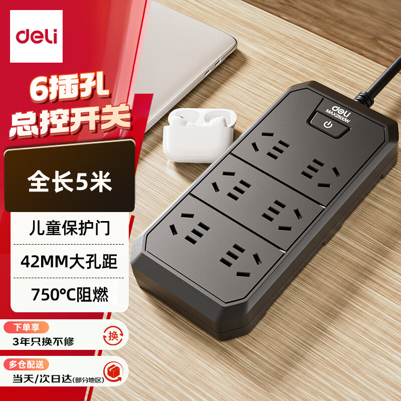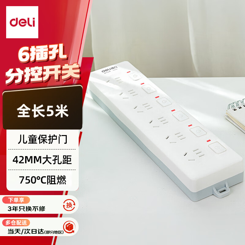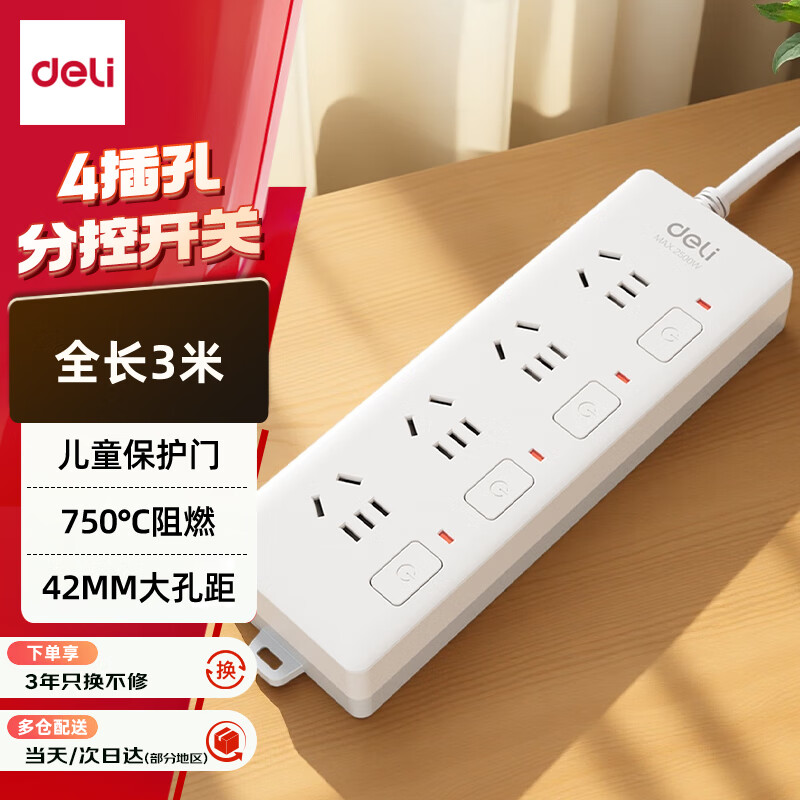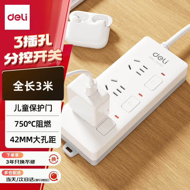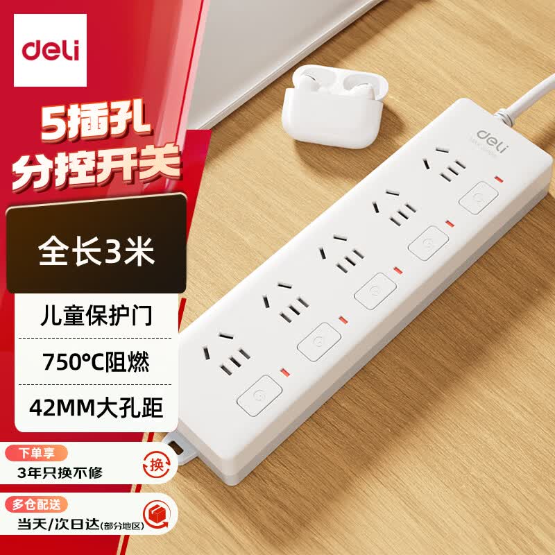 得力(deli)3C认证国标安全插座 插线板/插排/排插/插板/接线板/拖线板延长线 独立开关 分控3位1米 LU5055