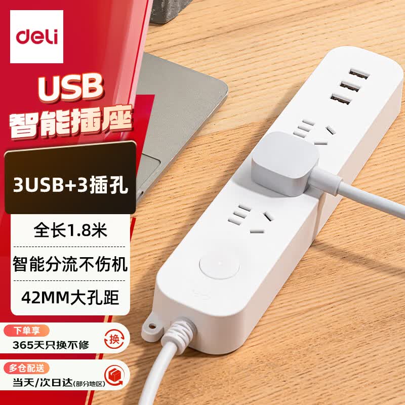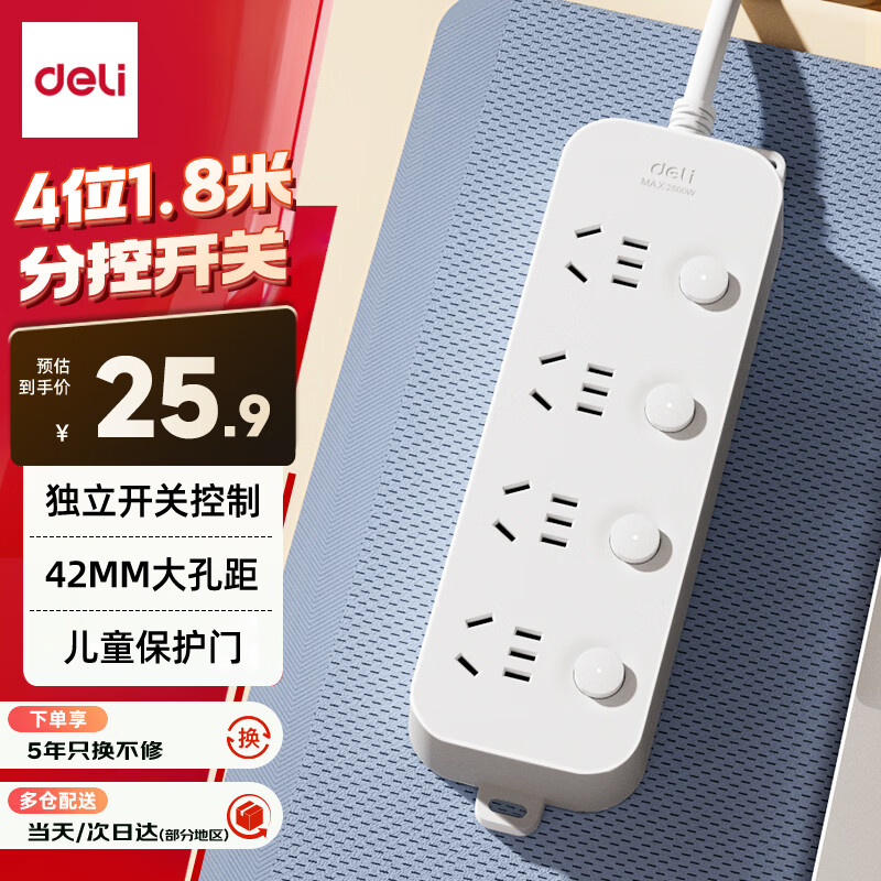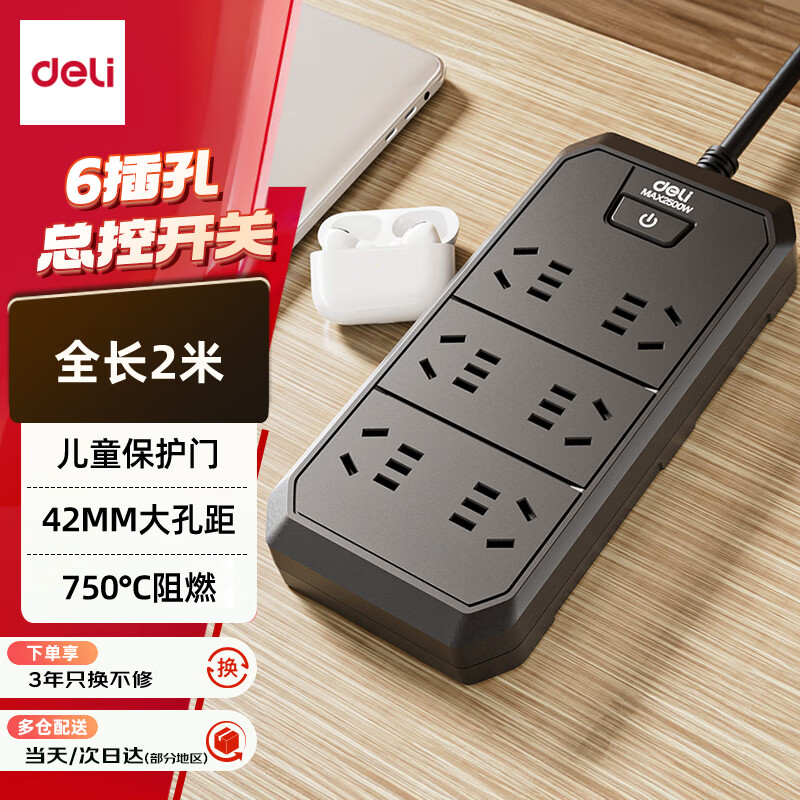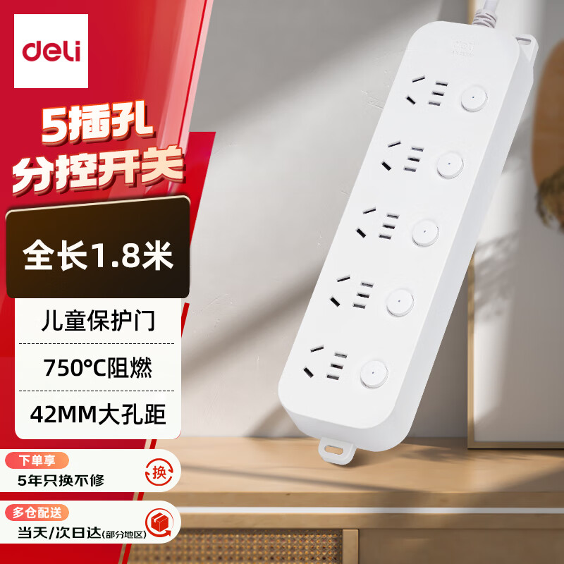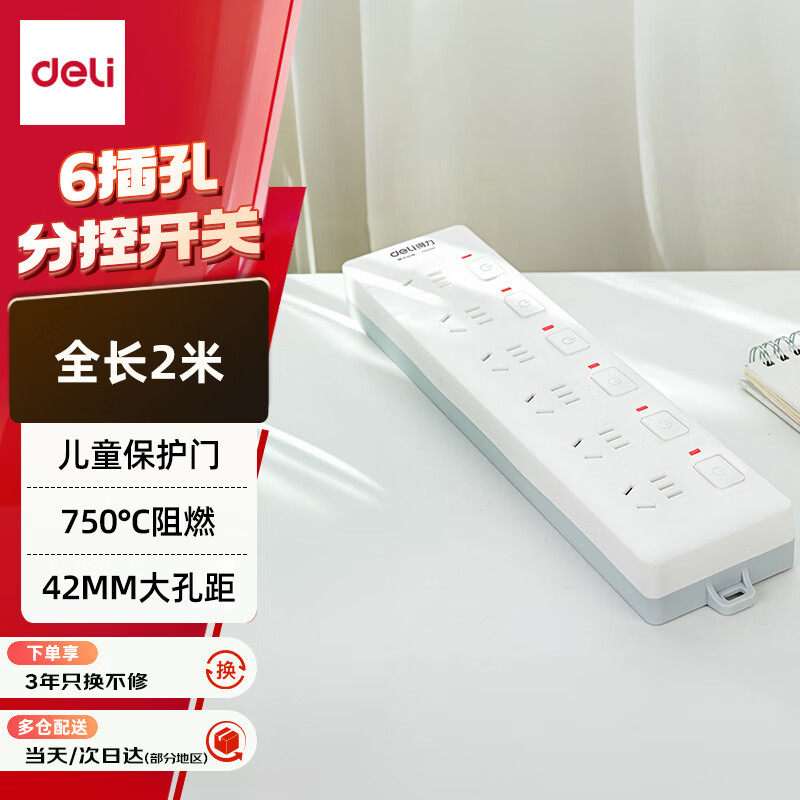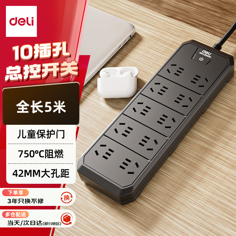 得力(deli)3C认证国标安全插座 插线板/插排/排插/插板/接线板/拖线板延长线 独立开关 分控3位1米 LU5055