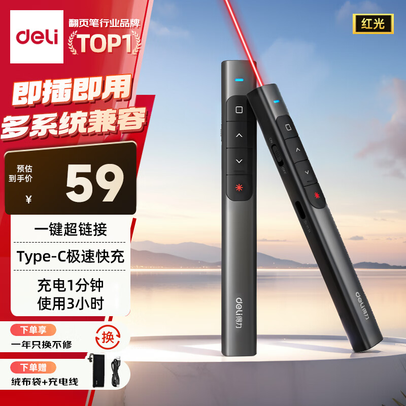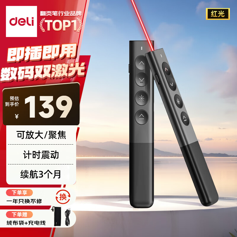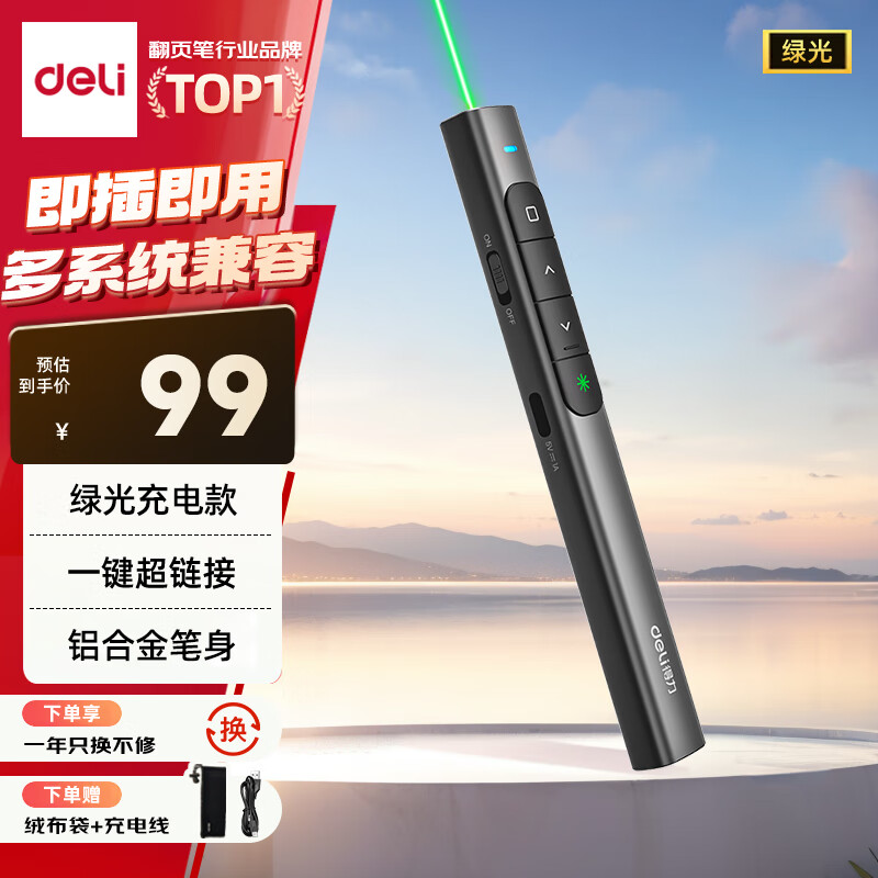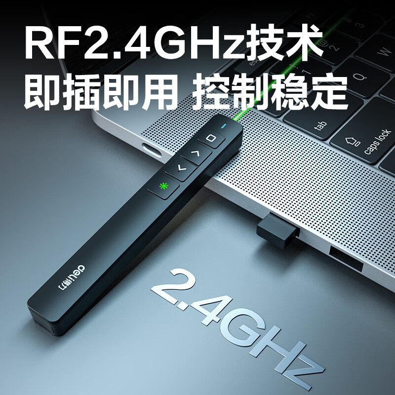 得力(deli)翻页笔教师用ppt投影笔激光翻页笔激光笔演讲笔 无线演示翻页器课件笔 逗猫笔绿光 黑色MA58-G