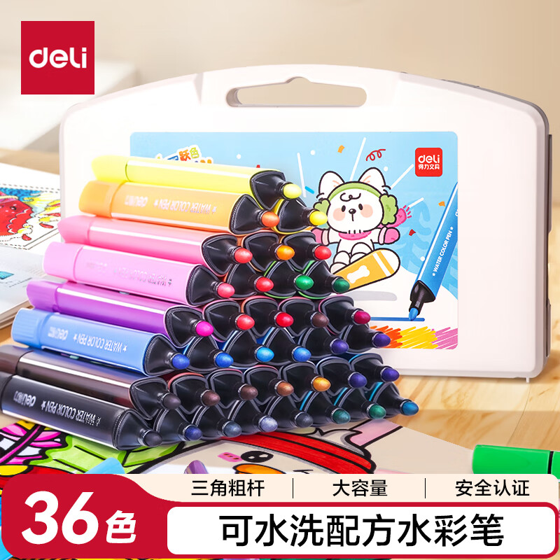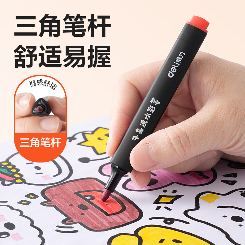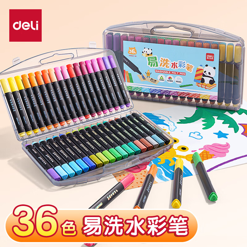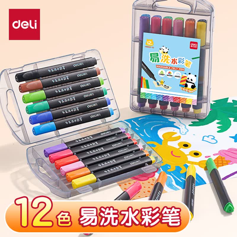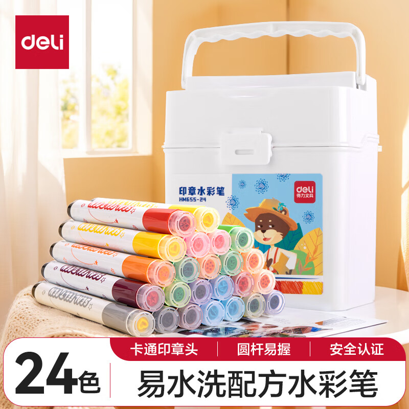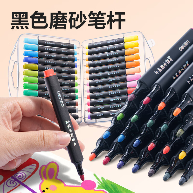 得力(deli)24色小黑盒易洗易清洗水彩笔熊猫粗三角杆学生儿童画画涂色美术绘画礼物HM662-24
