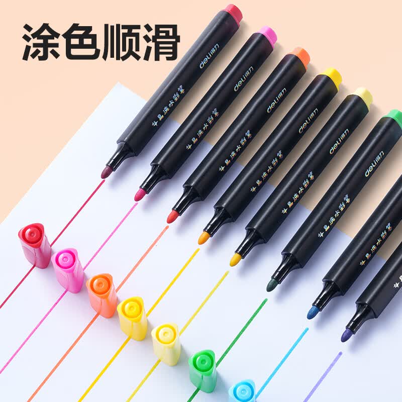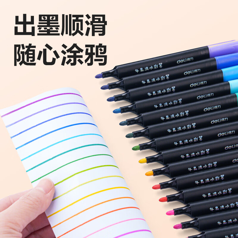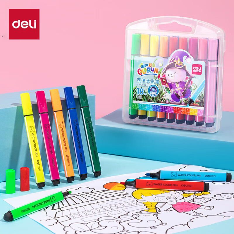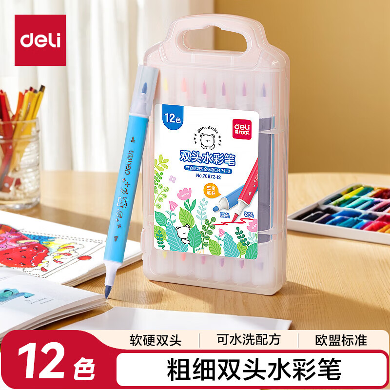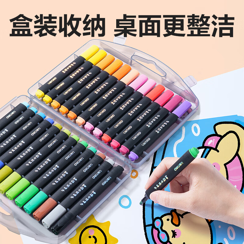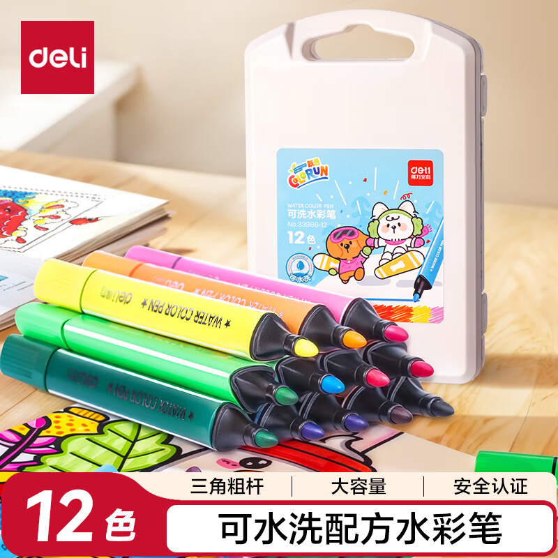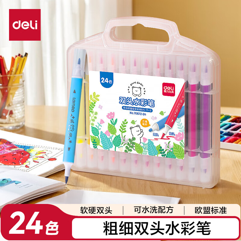 得力(deli)24色小黑盒易洗易清洗水彩笔熊猫粗三角杆学生儿童画画涂色美术绘画礼物HM662-24