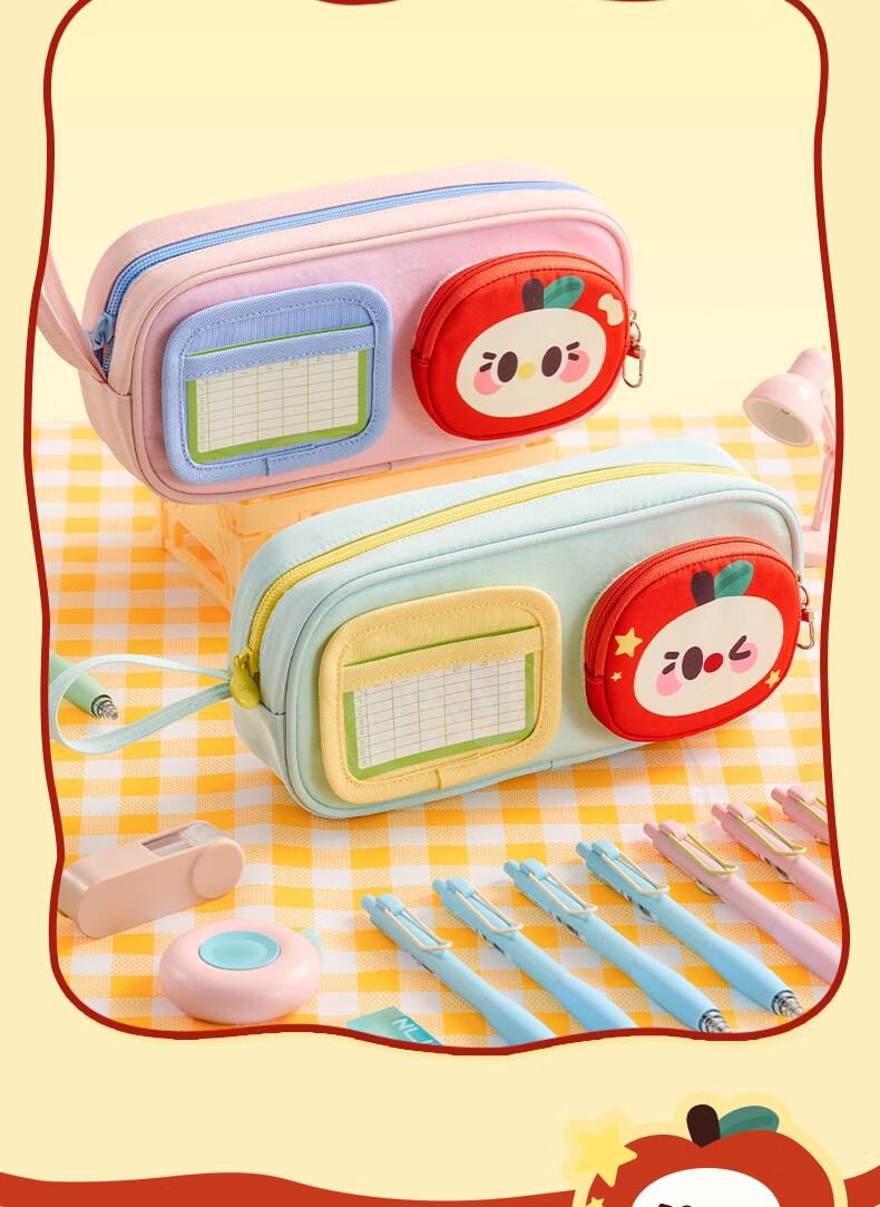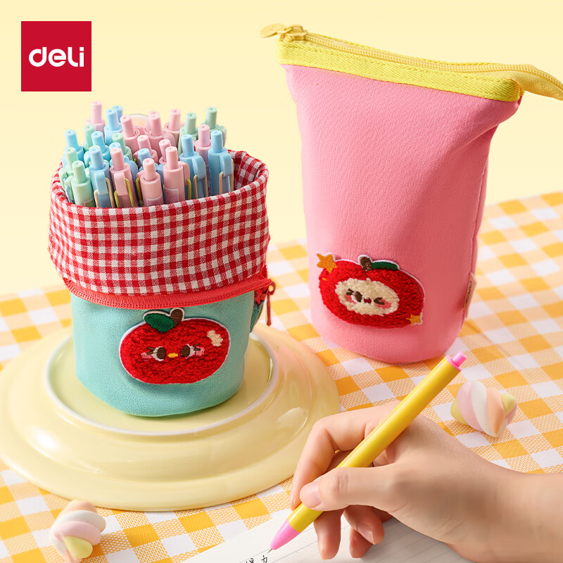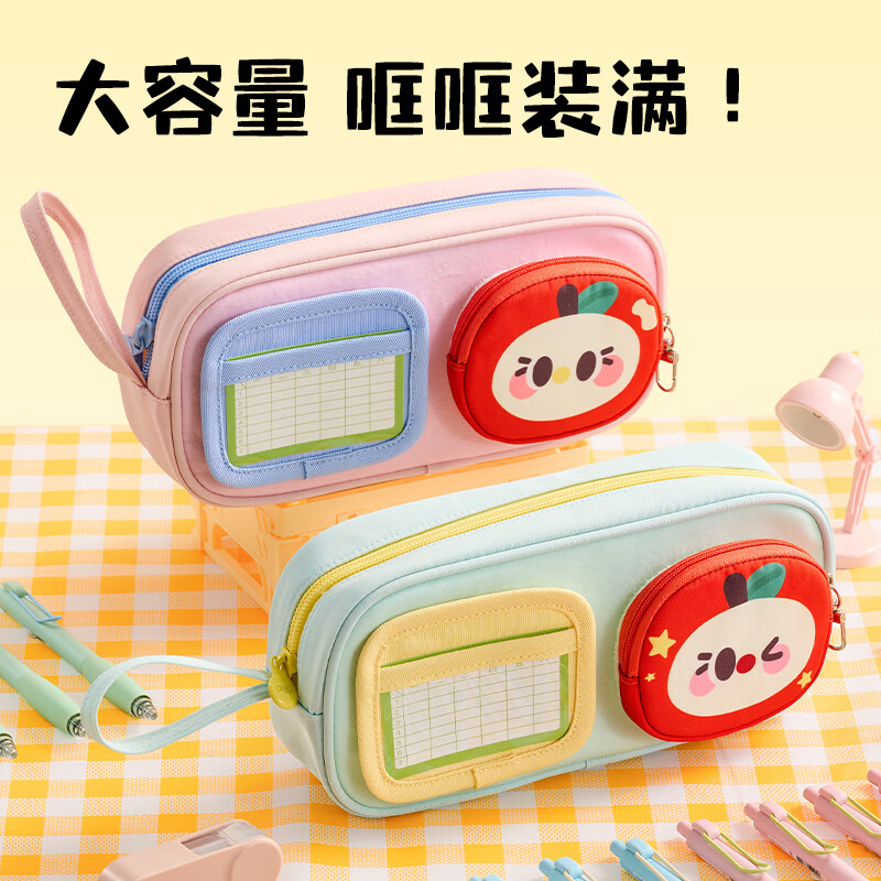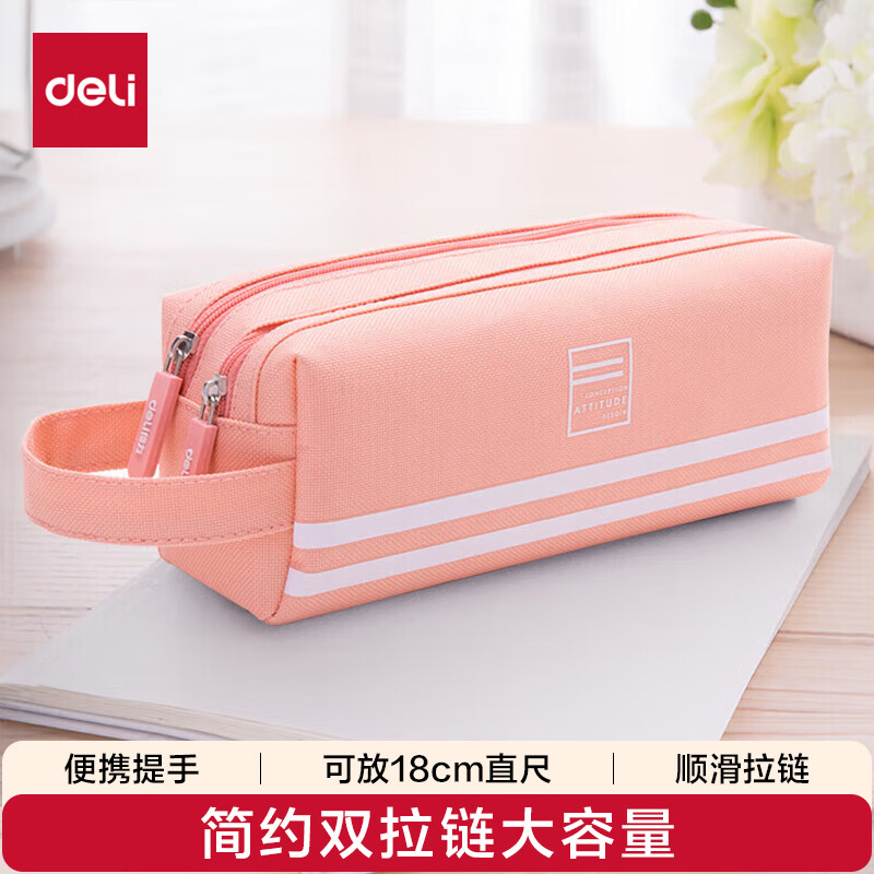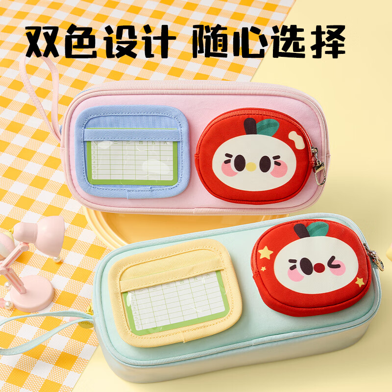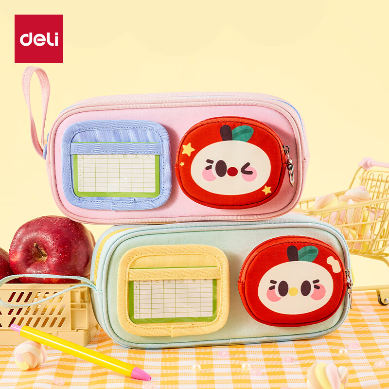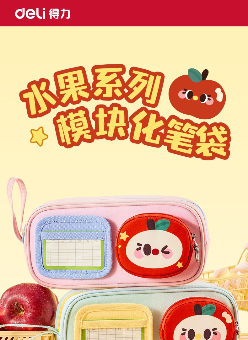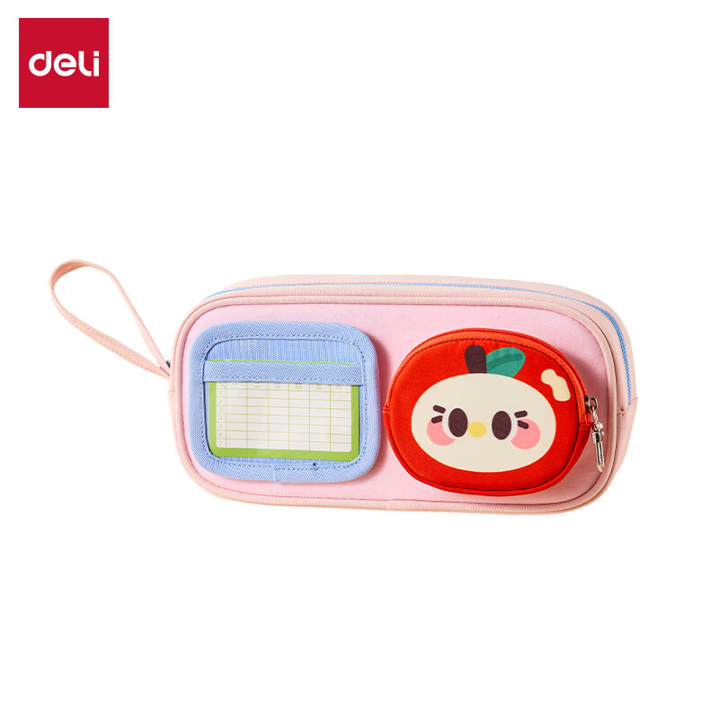 得力高颜值可爱水果笔袋 便携手提大容量文具收纳袋多功能笔盒 附赠百粘布零钱包 粉BC427