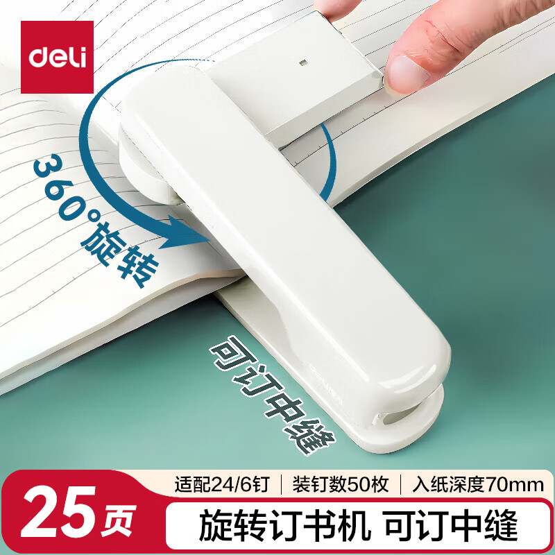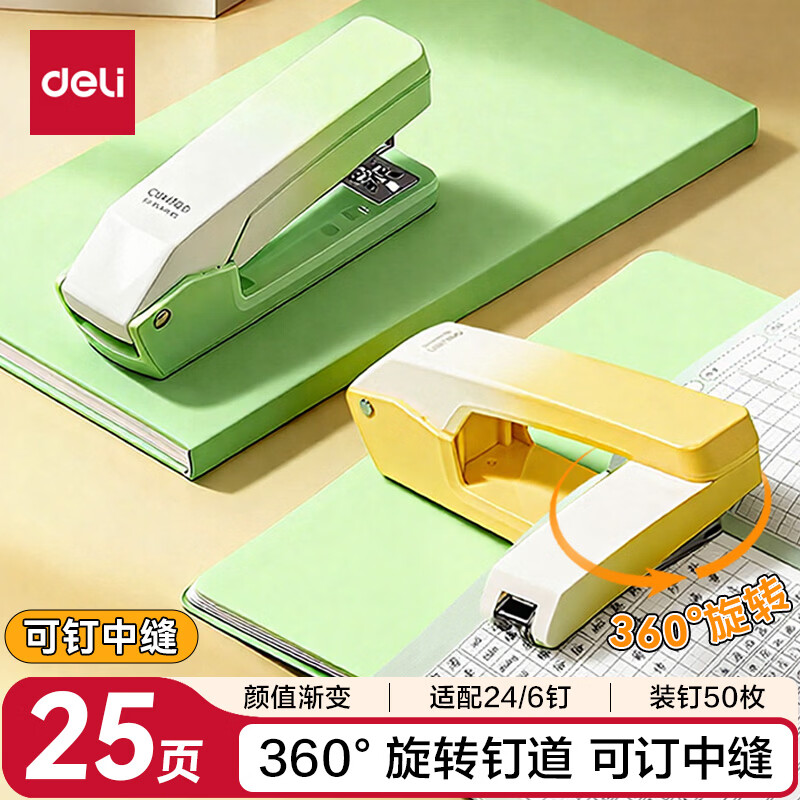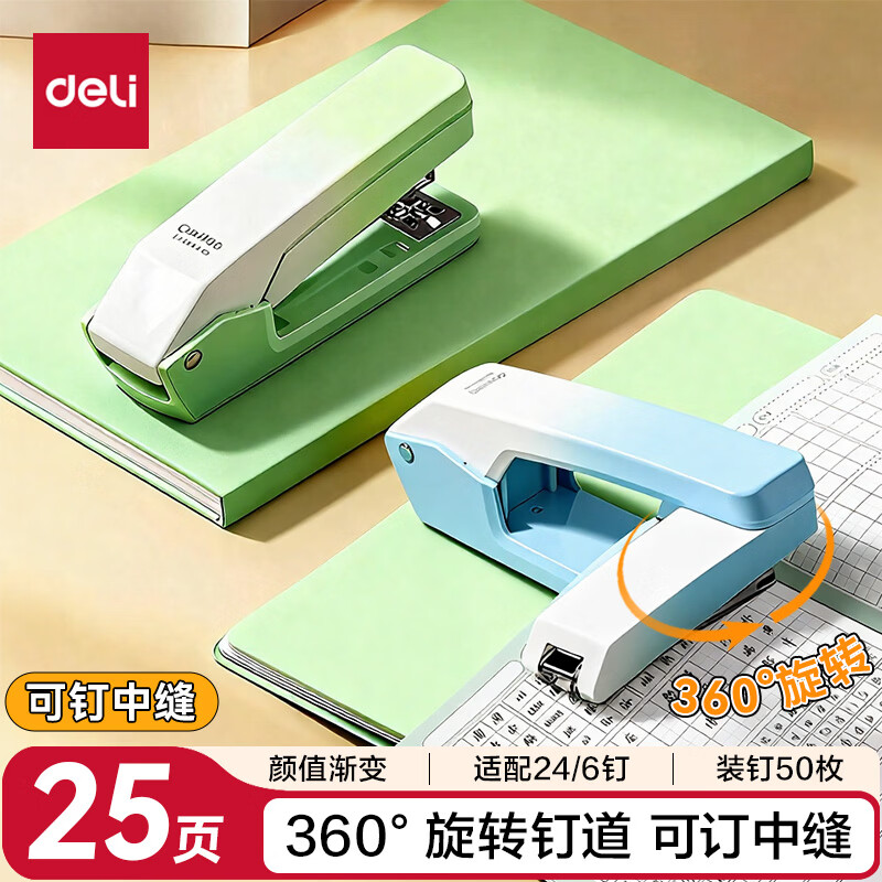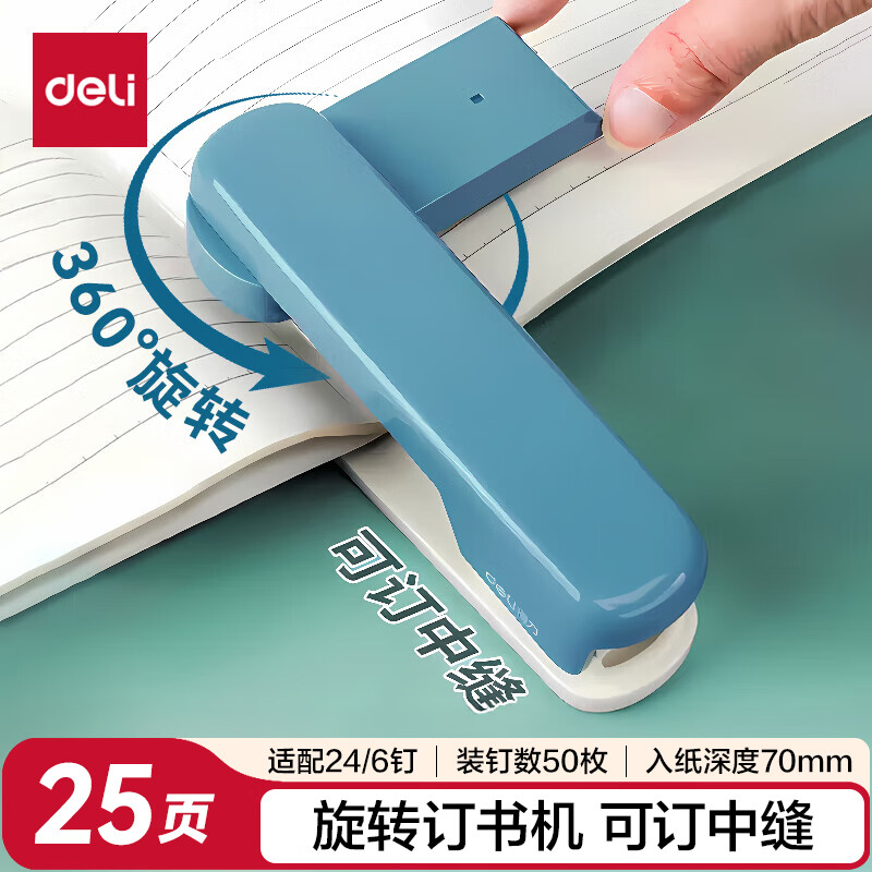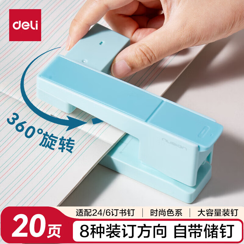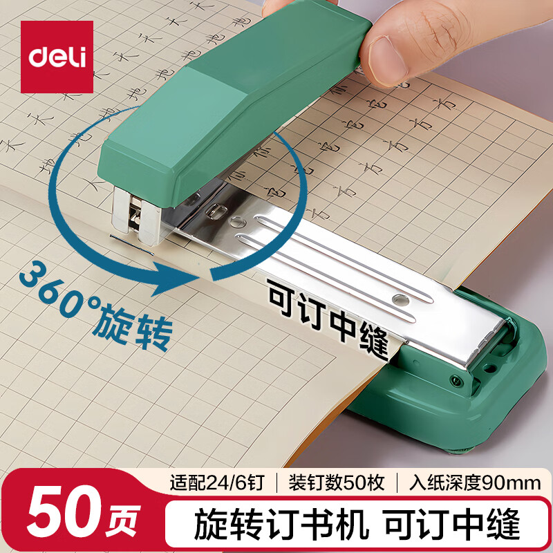 得力(deli)【热门商品】旋转订书机/订书器 学生作业本办公可钉中缝可储订书钉 办公用品文具 NS089-2沙普绿