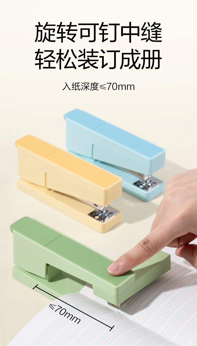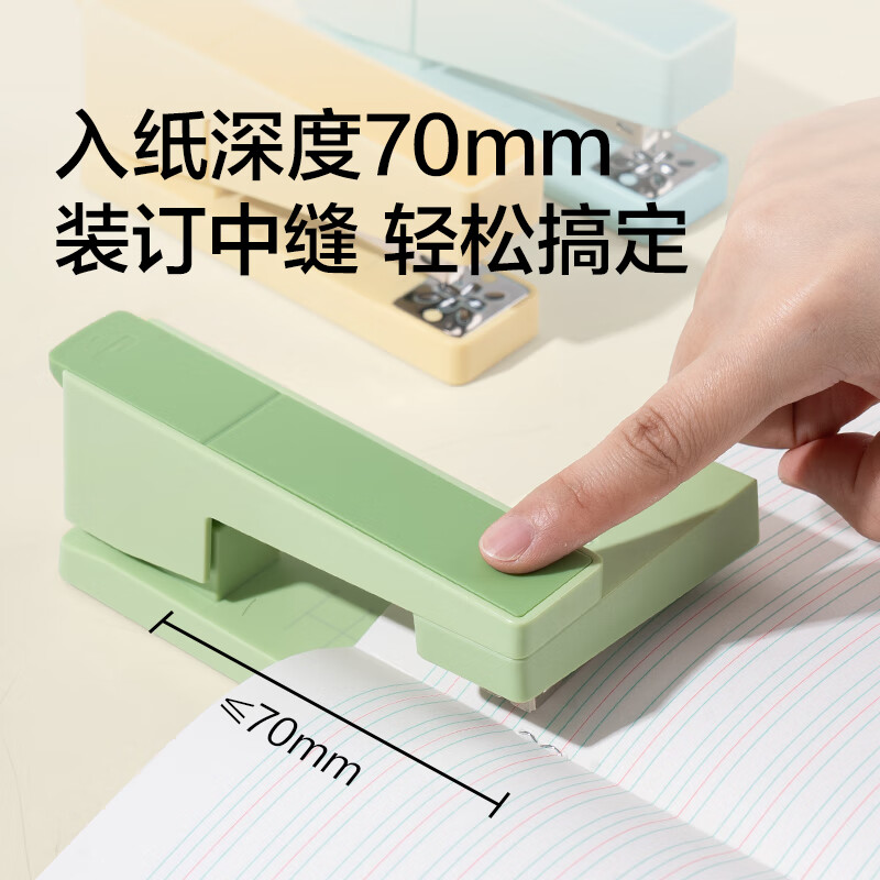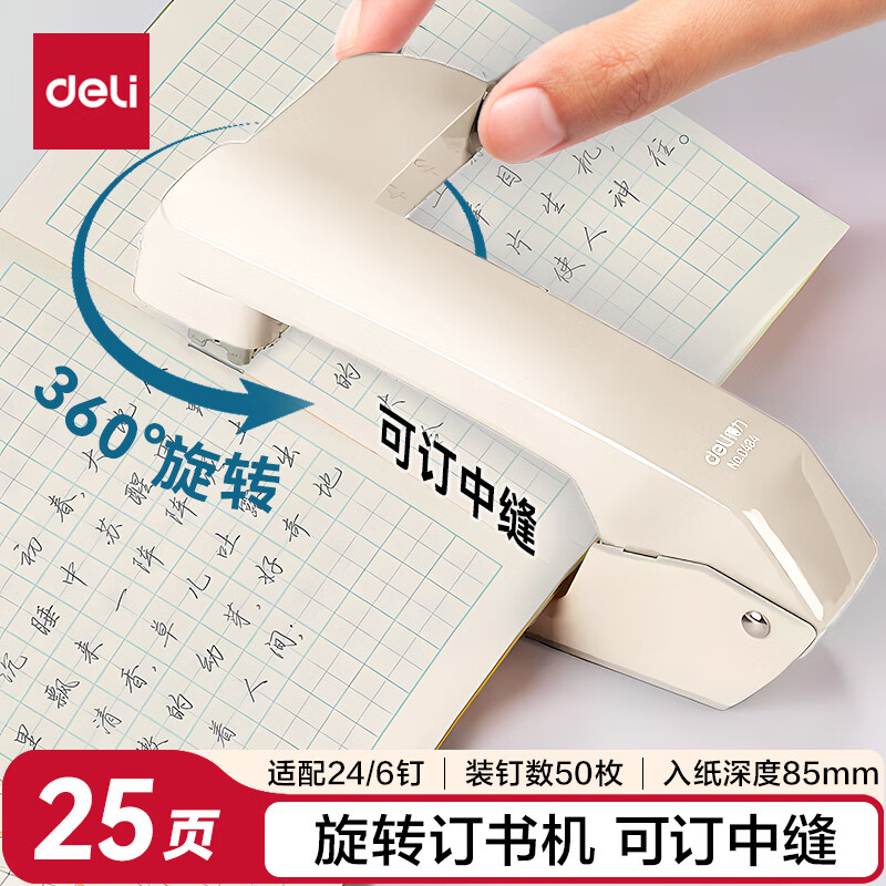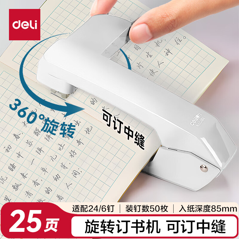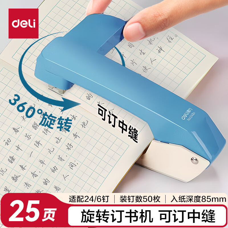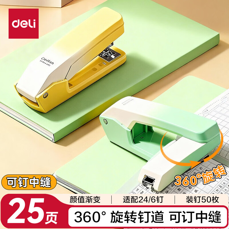得力(deli)【热门商品】旋转订书机/订书器 学生作业本办公可钉中缝可储订书钉 办公用品文具 NS089-2沙普绿