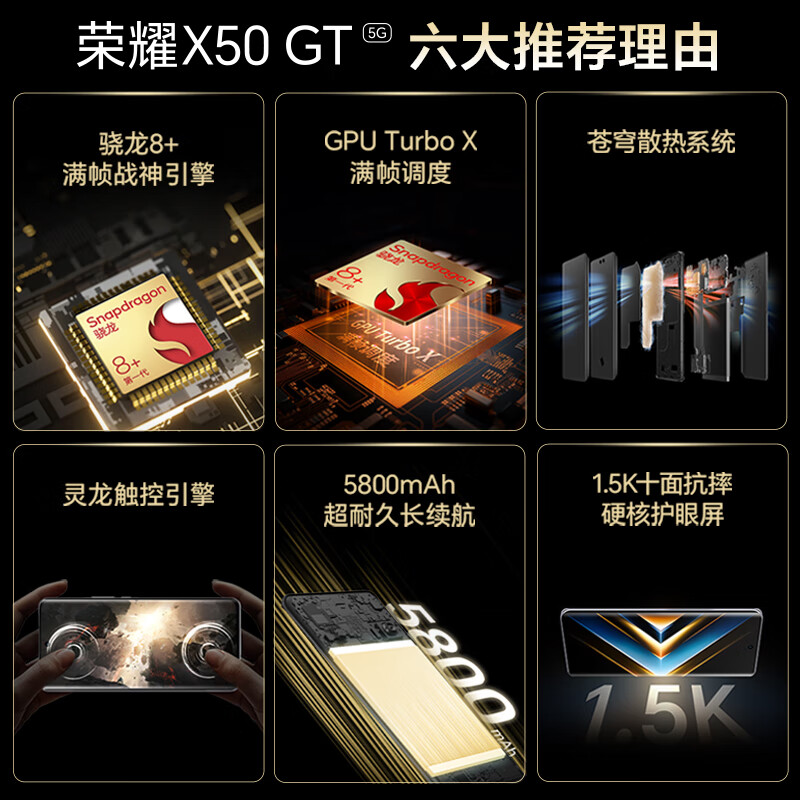 荣耀X50 GT 骁龙8+芯片 苍穹散热系统 5800mAh电池 抗摔护眼屏 12+256 幻夜黑 5G 游戏手机 国家补贴
