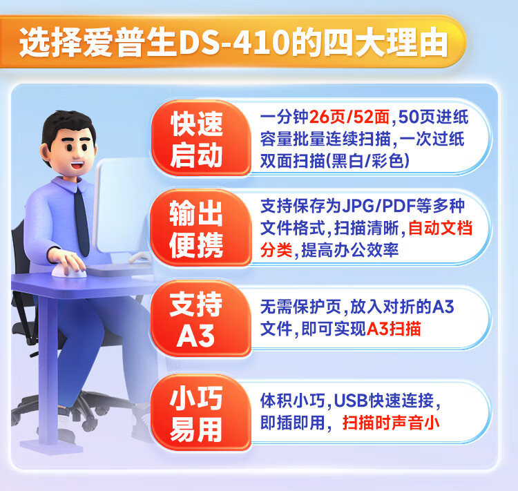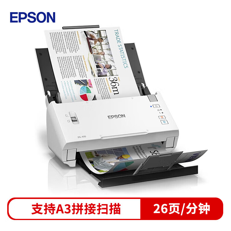 爱普生(EPSON)DS-410 A4馈纸式扫描仪自动连续扫描 高速办公用 双面彩色扫描
