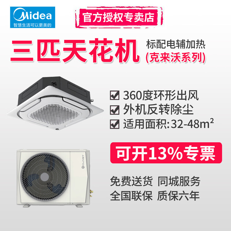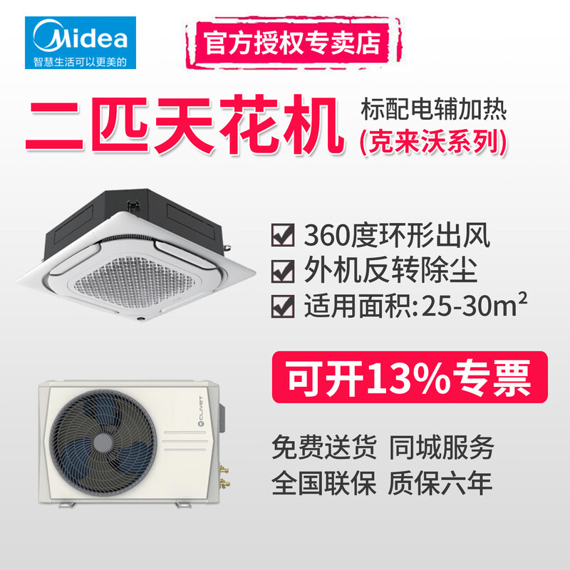 美的(Midea)五匹天花机高静压高能效中央空调2匹3匹克来沃系列吸顶空调变频冷暖嵌入式办公室吊顶220V天井机