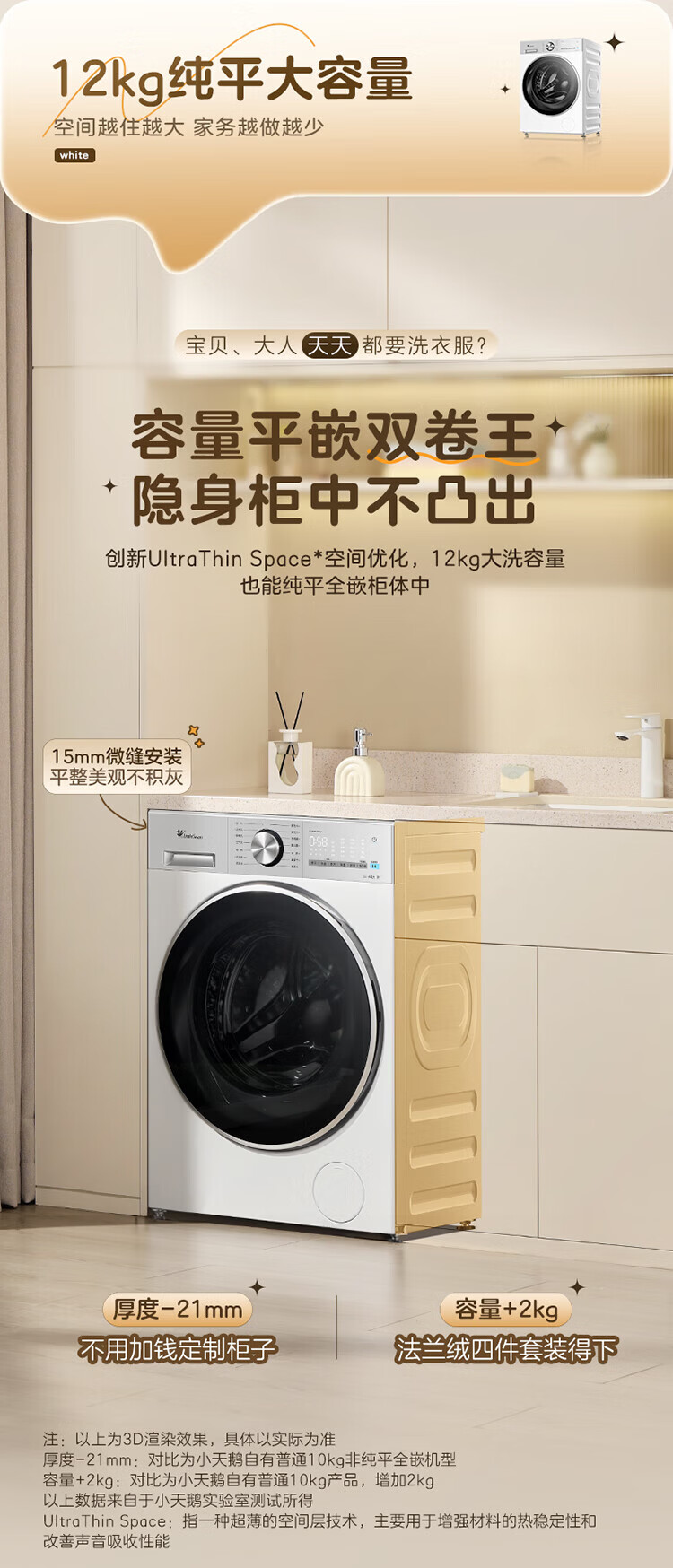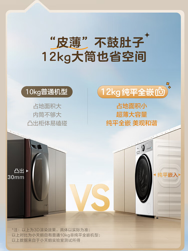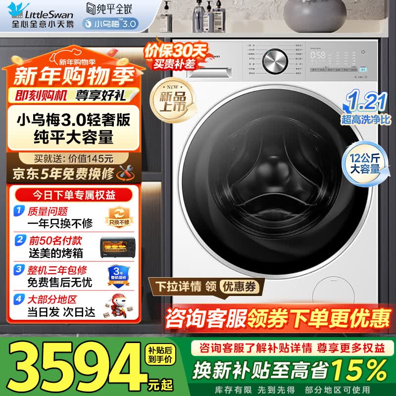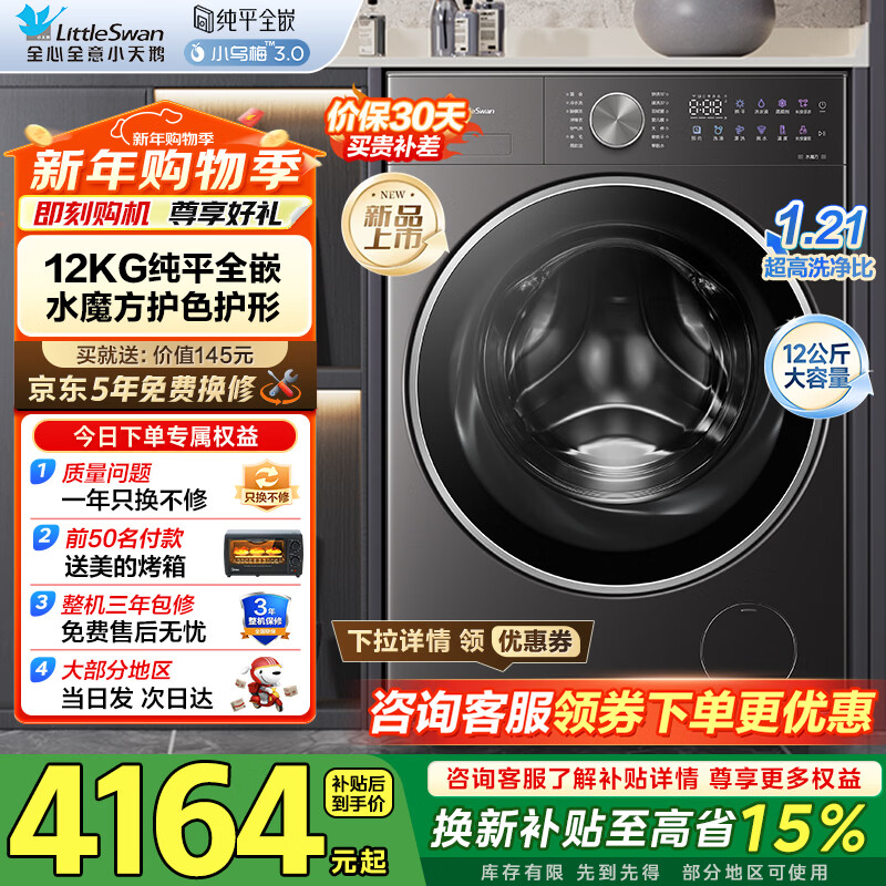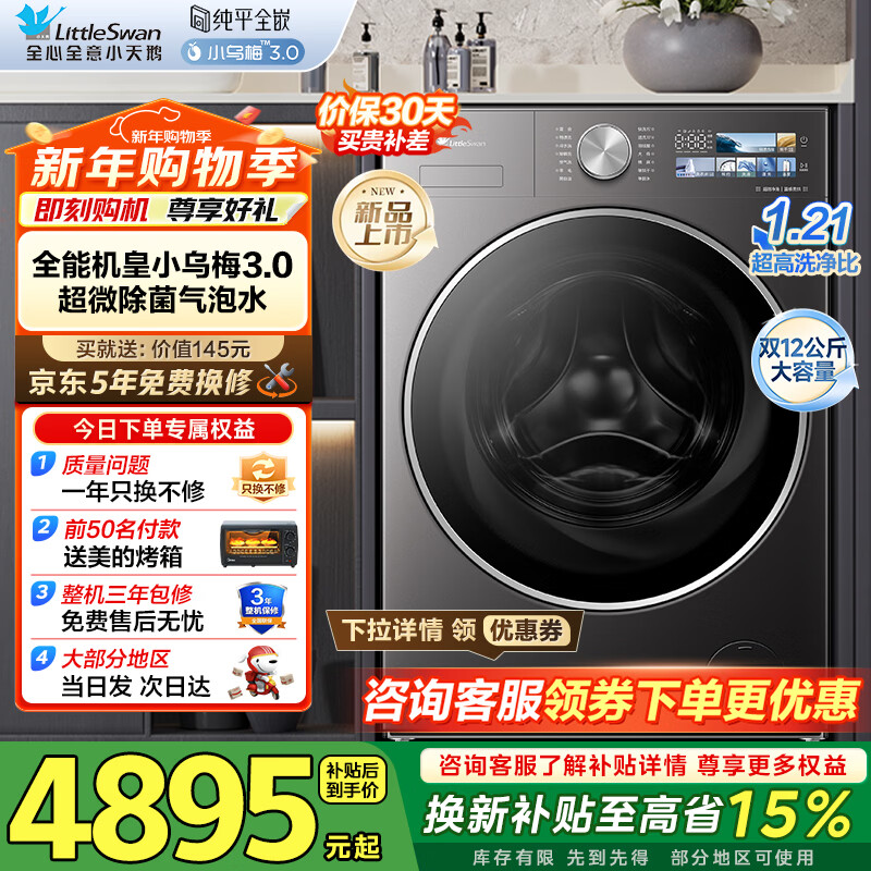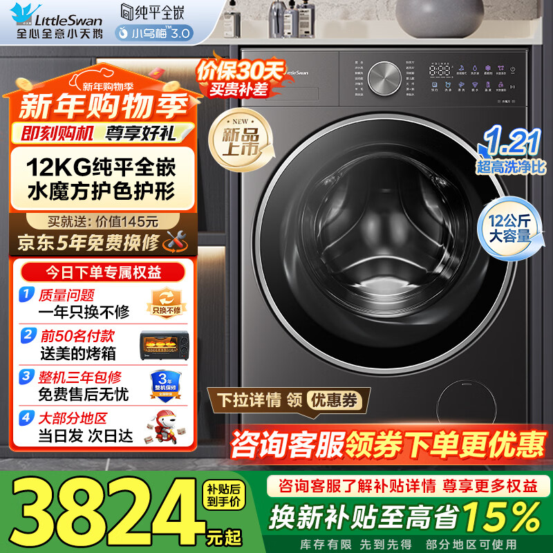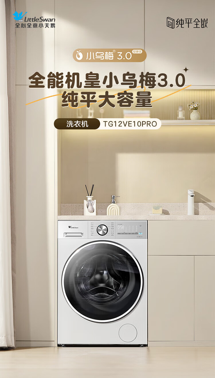 小天鹅(LittleSwan)小乌梅3.0滚筒洗衣机全自动家用12公斤大容量 纯平全嵌净屑除毛 一级能效补贴