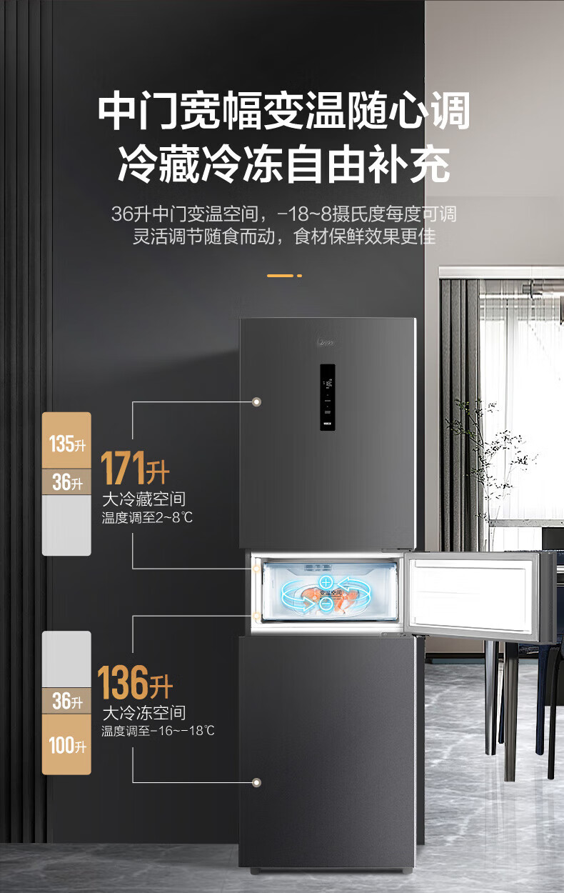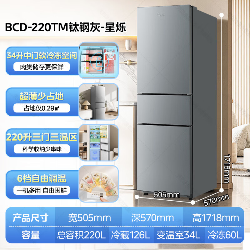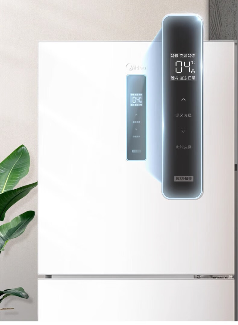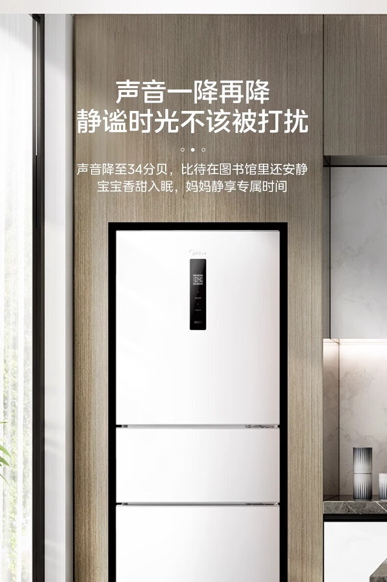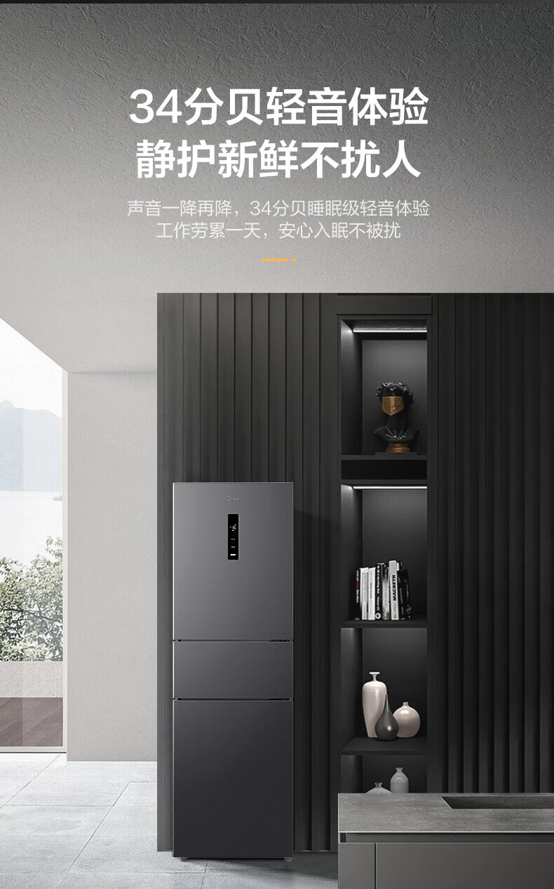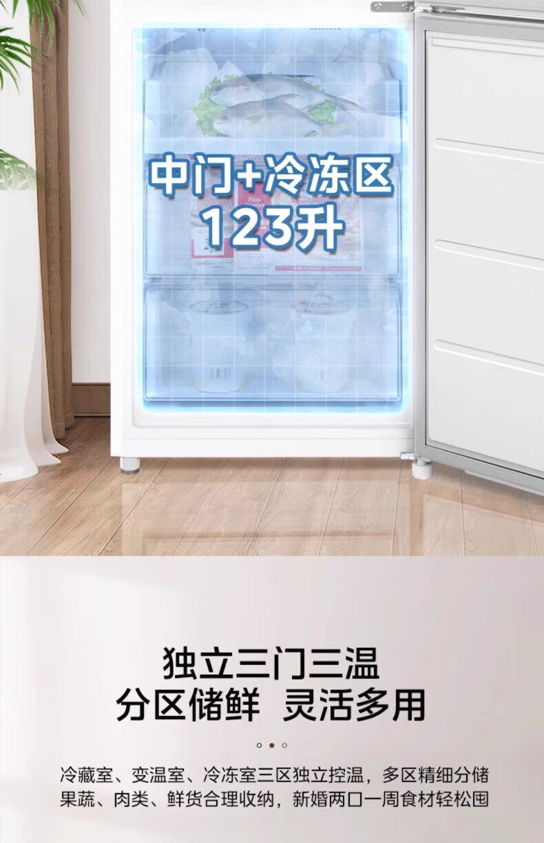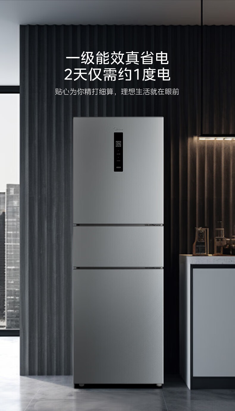 美的冰箱220三门三温家用客厅宿舍小型冰箱中门软冷冻节能省电低音低噪出租房电冰箱BCD-220TM