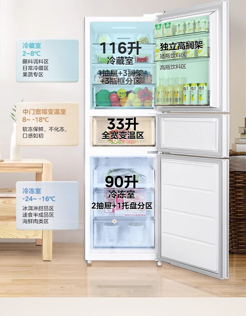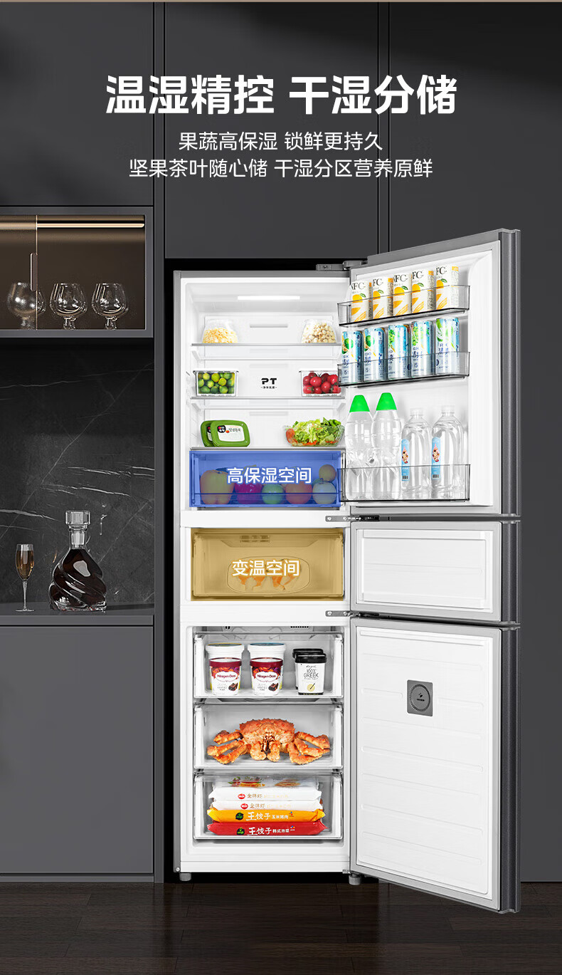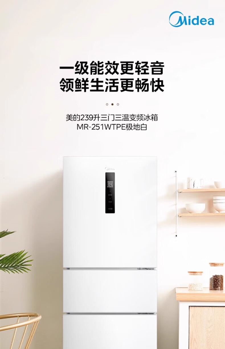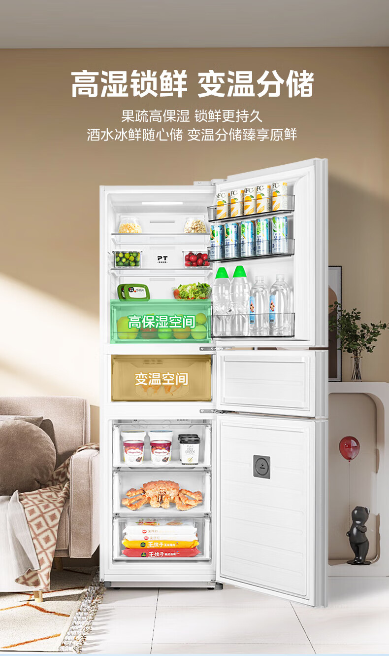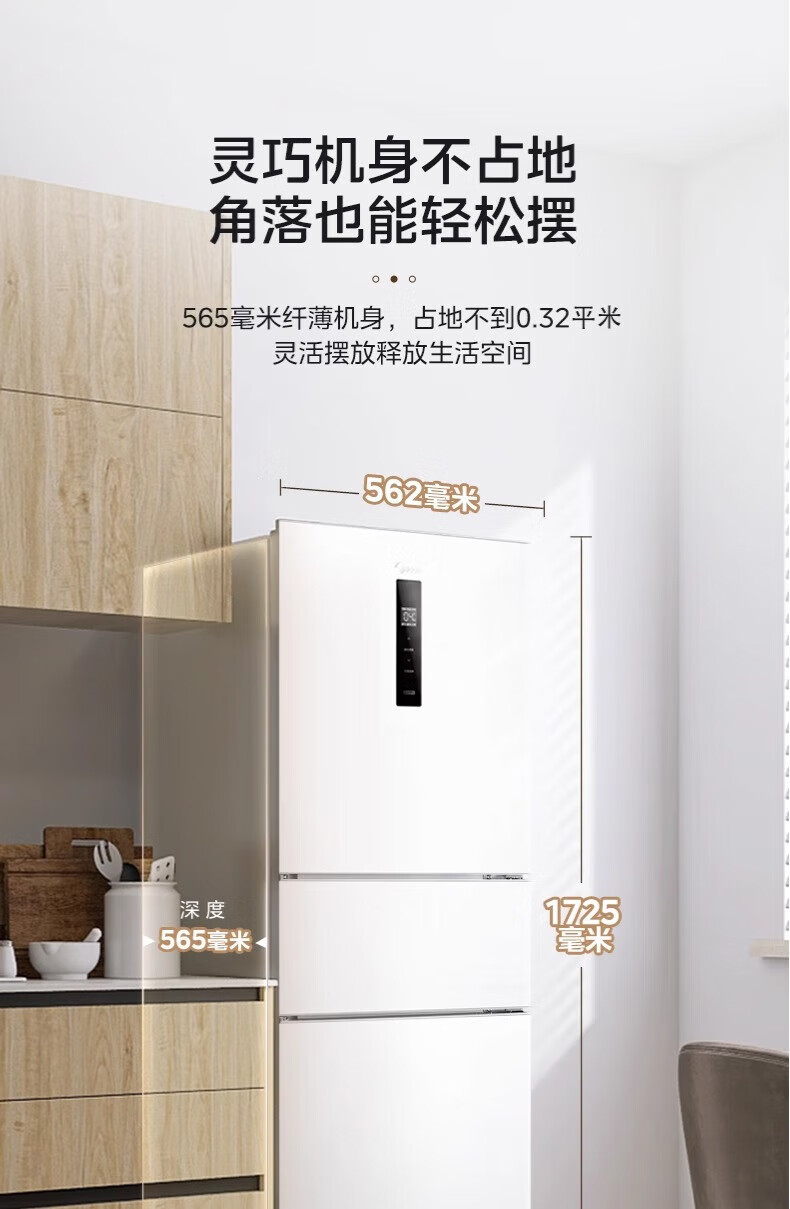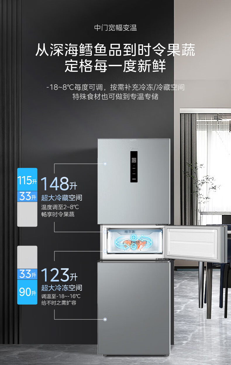 美的冰箱220三门三温家用客厅宿舍小型冰箱中门软冷冻节能省电低音低噪出租房电冰箱BCD-220TM
