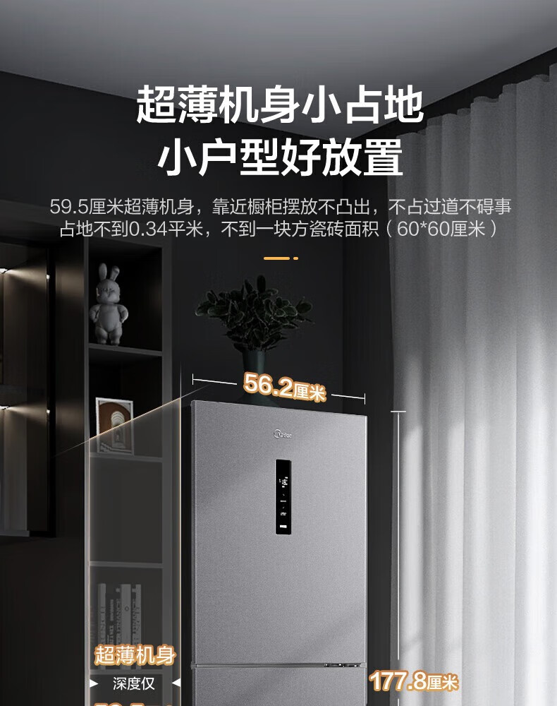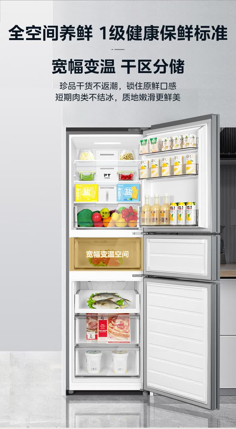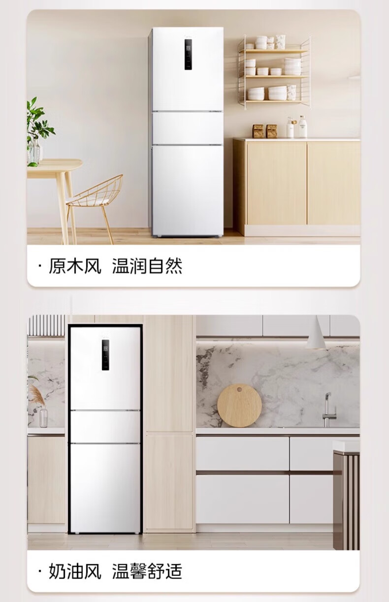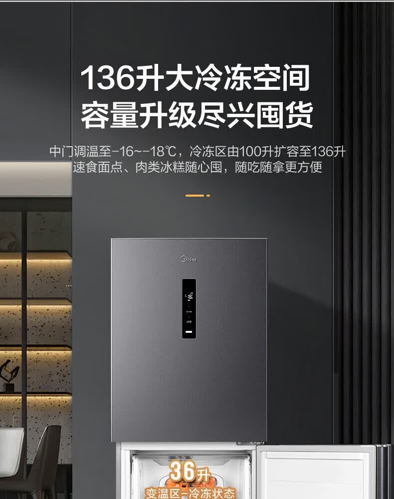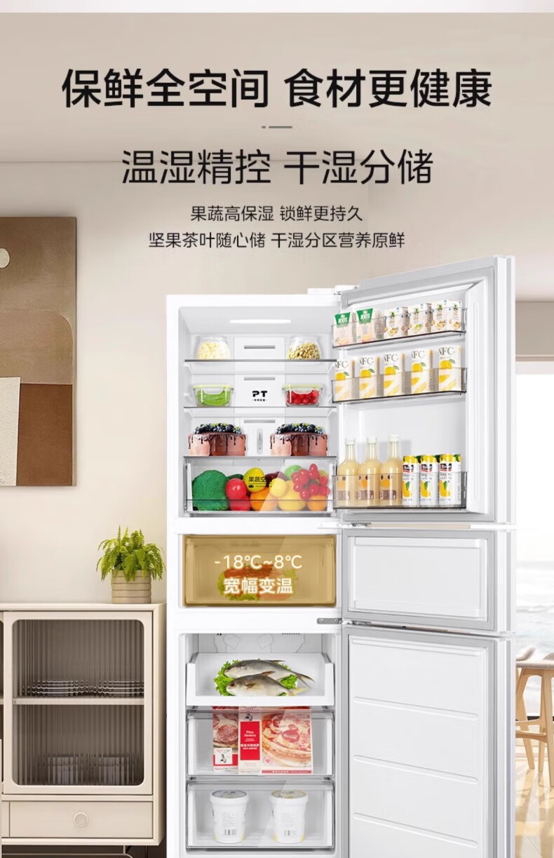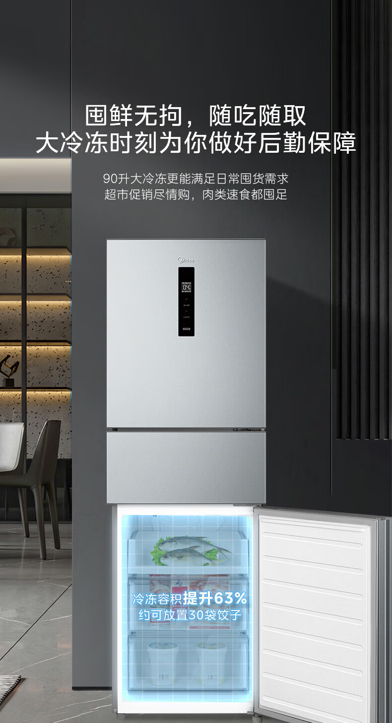 美的冰箱220三门三温家用客厅宿舍小型冰箱中门软冷冻节能省电低音低噪出租房电冰箱BCD-220TM