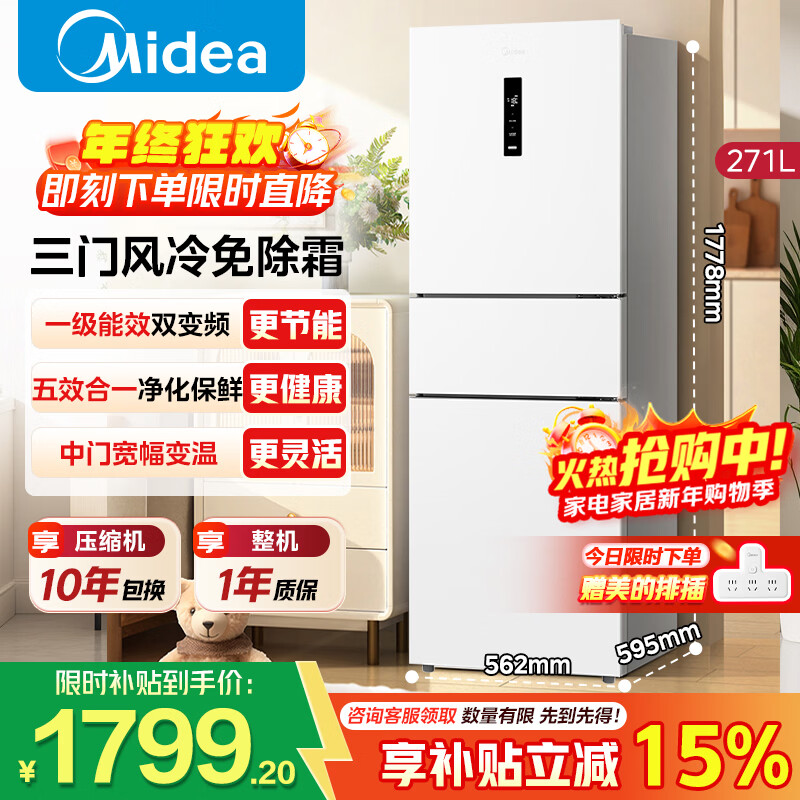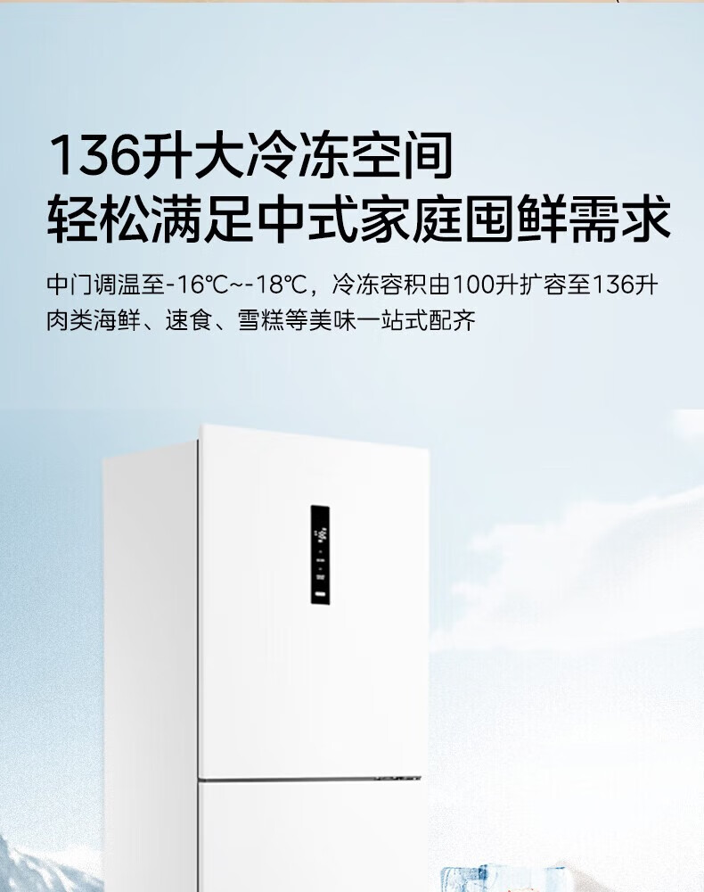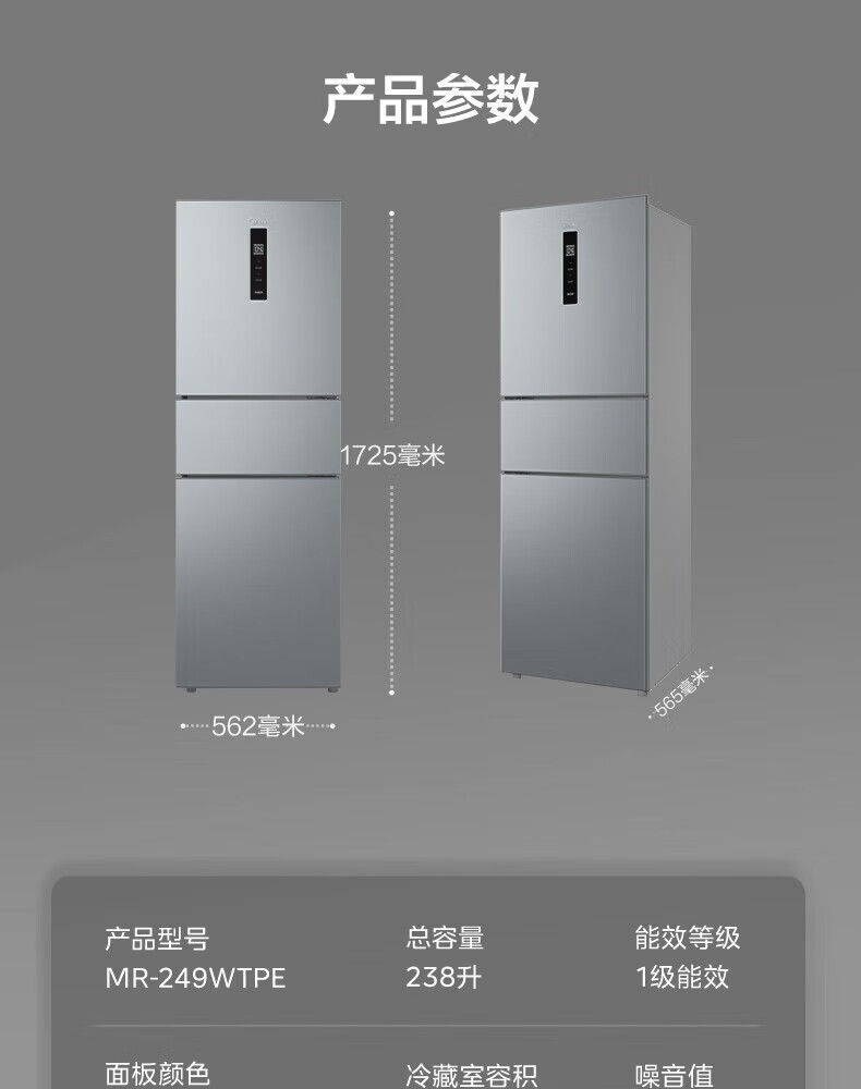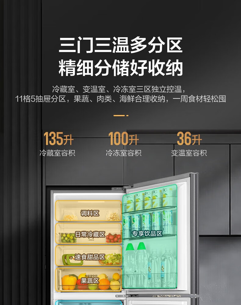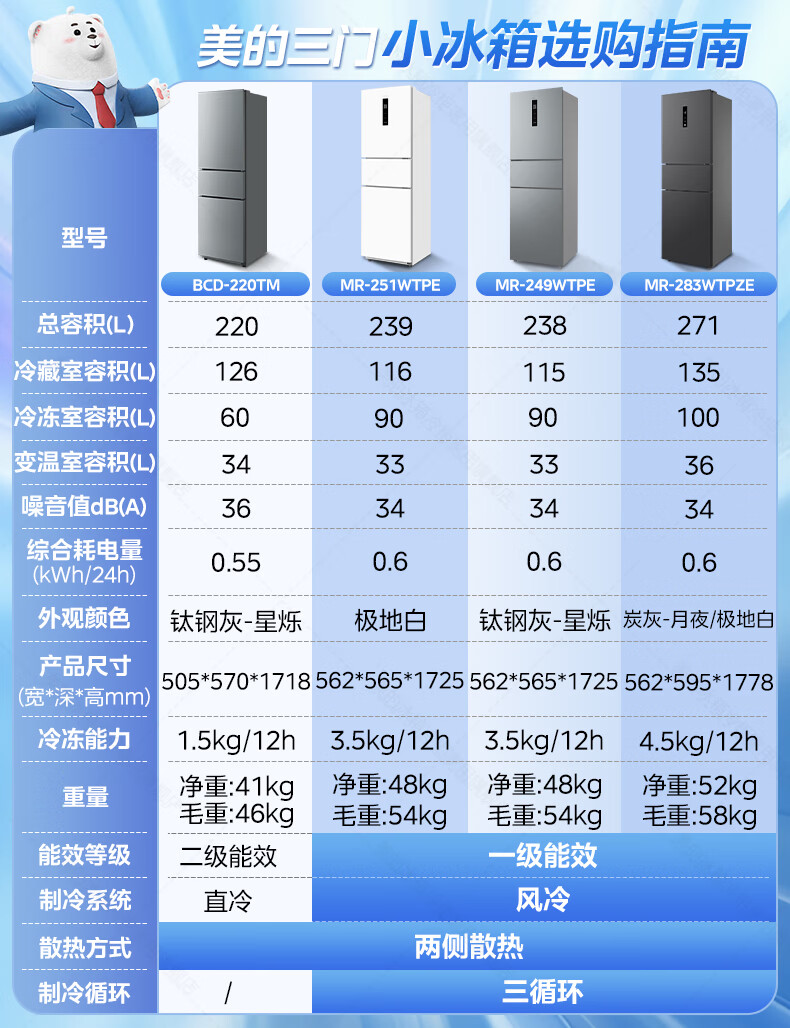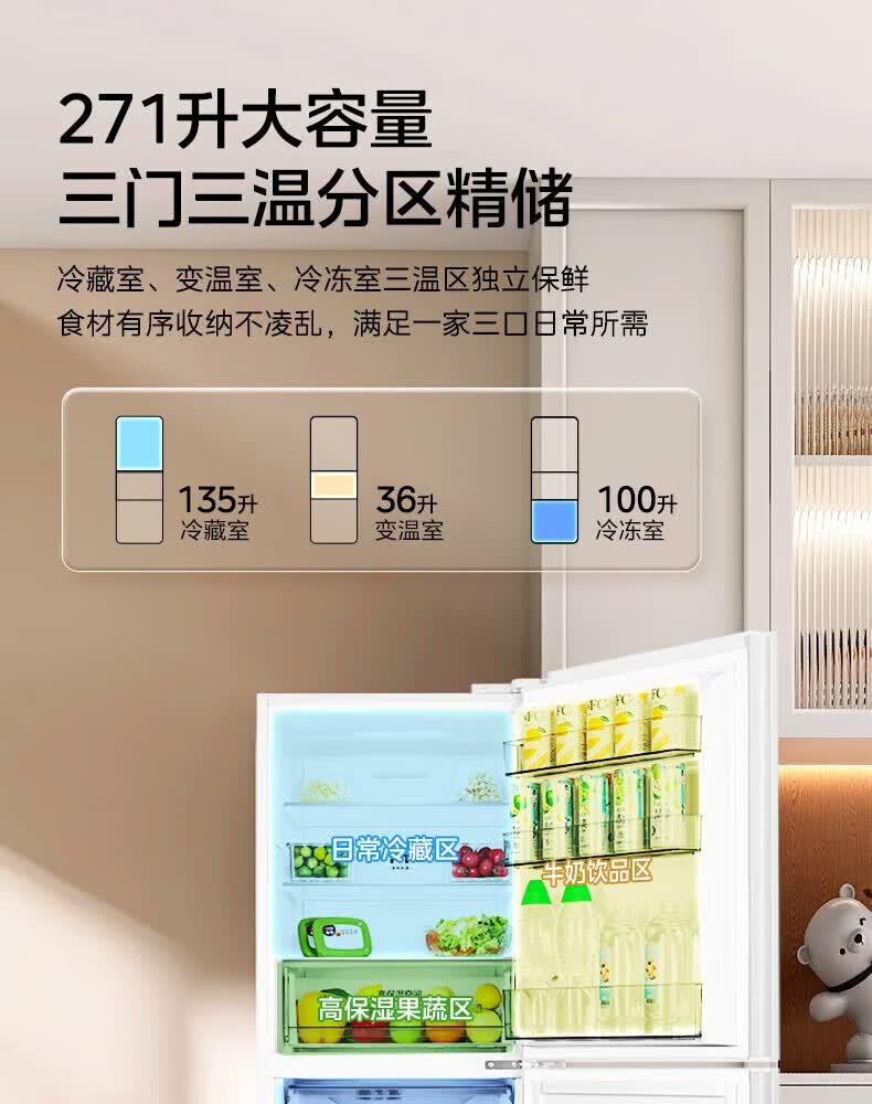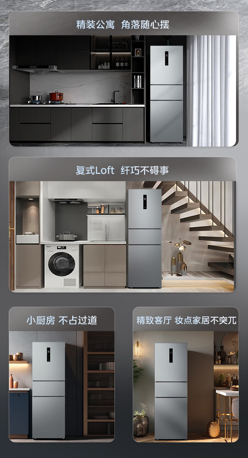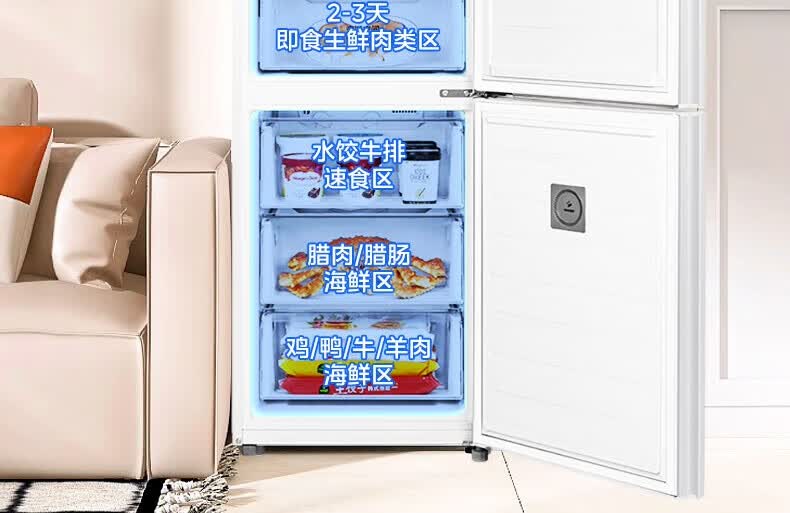 美的冰箱220三门三温家用客厅宿舍小型冰箱中门软冷冻节能省电低音低噪出租房电冰箱BCD-220TM