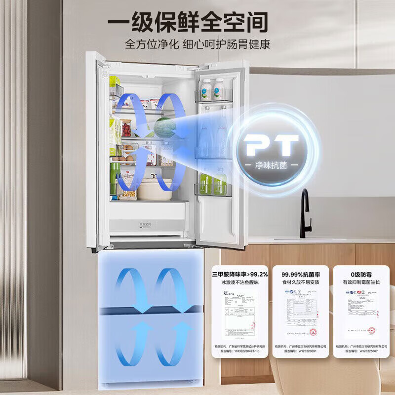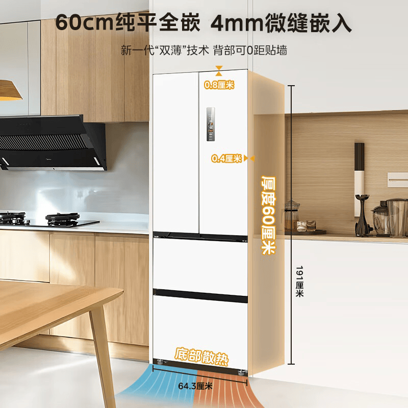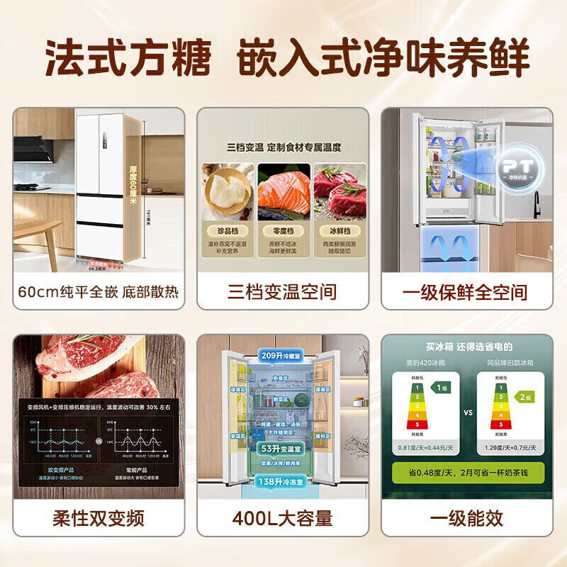 美的冰箱法式四开门多门60cm超薄全嵌双变频一级能效大容量风冷无霜国家补贴小户型冰箱MR-420WUFPZE 【400L薄大容量】一级能效 净味养鲜