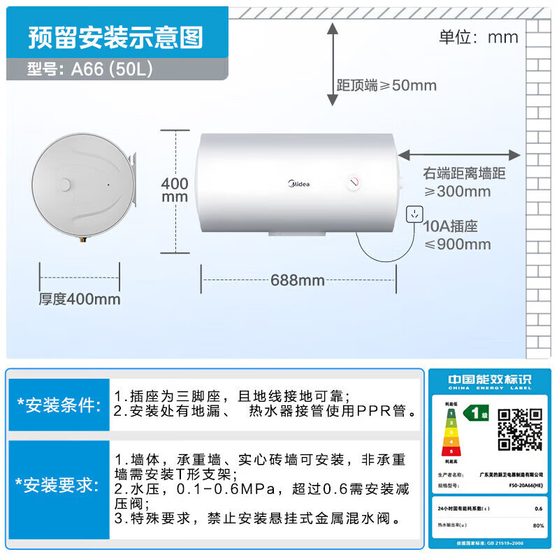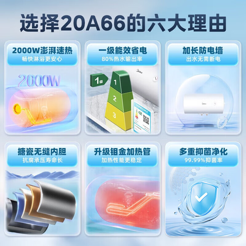 美的(Midea)【国家补贴】储水式电热水器家用40/50/60/80升可选2000W/2500w速热一级能效节能省电 加长防电墙