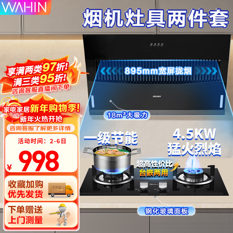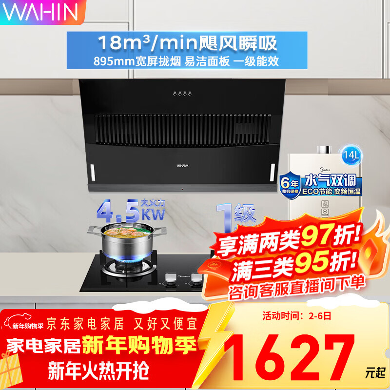 美的(Midea)出品WAHIN吸油烟机侧吸式家用出租厨房脱排抽烟机18立方吸力烟机燃气灶具两件套热水器三件套装
