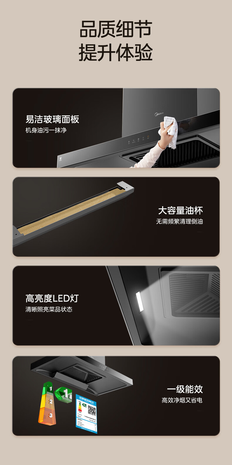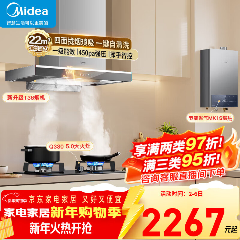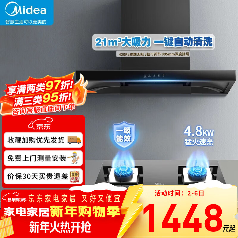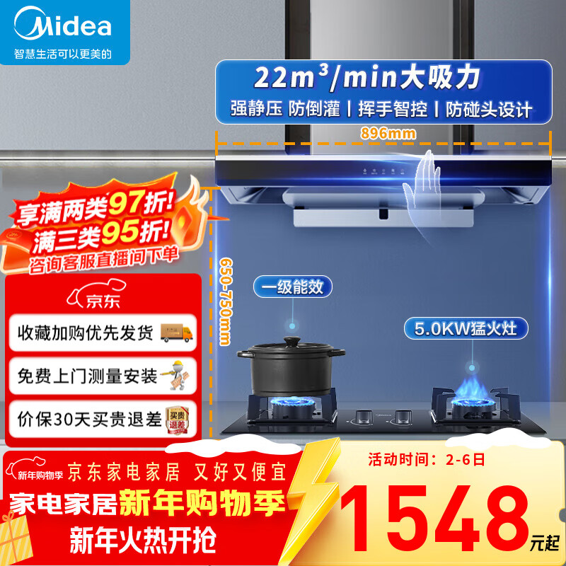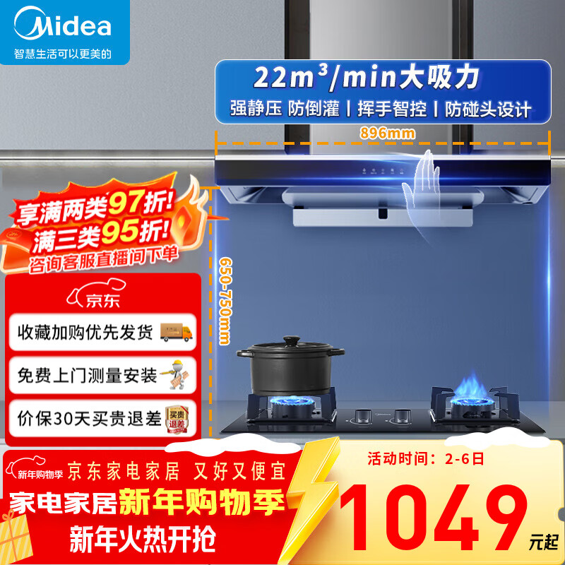 美的(Midea)抽油烟机一级能效家用自动清洗欧式22m³大吸力顶吸挥手控制脱排油烟机灶具两件套烟灶热三件套装