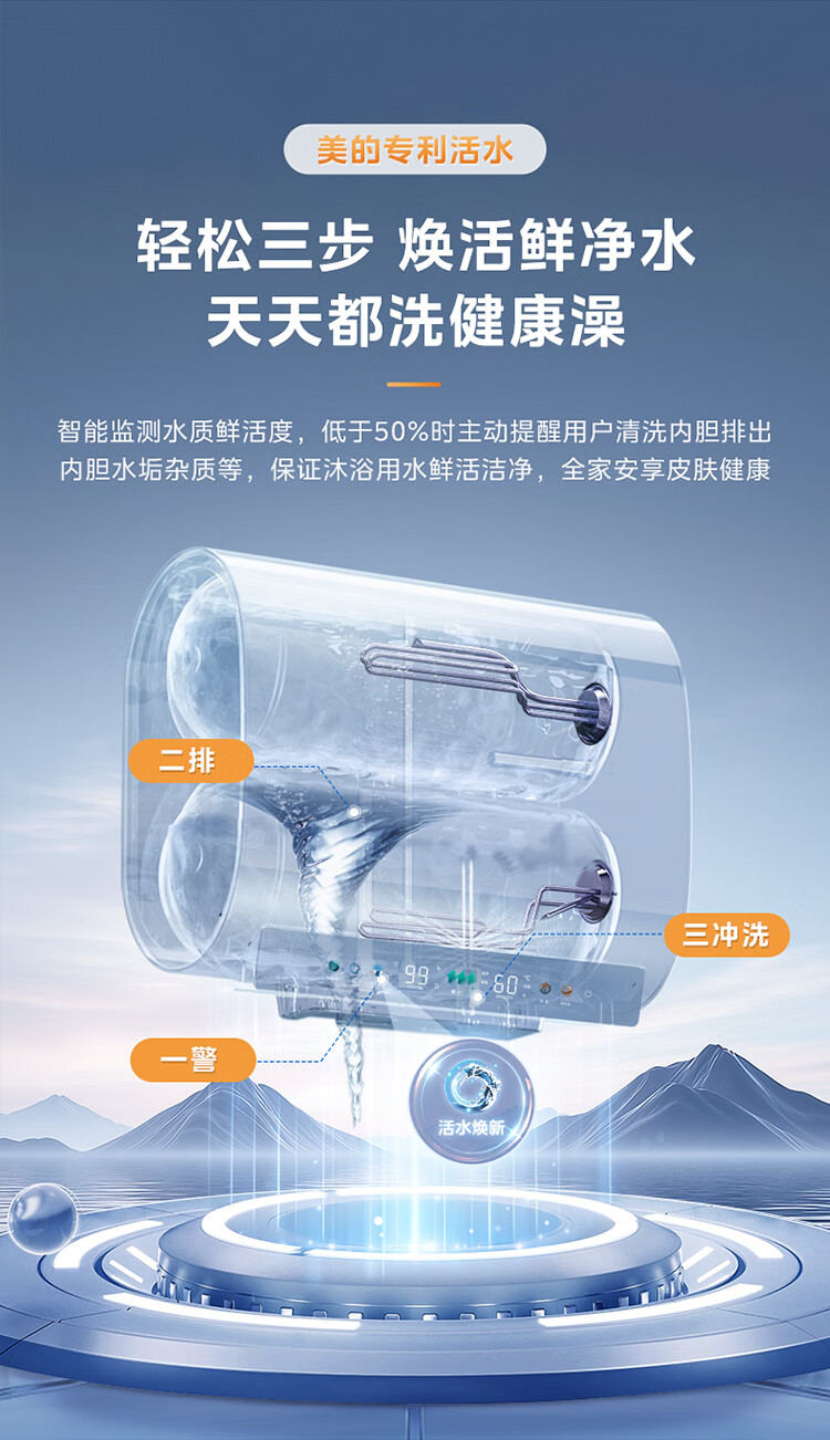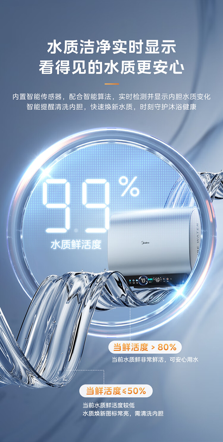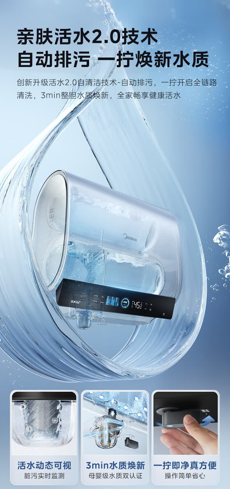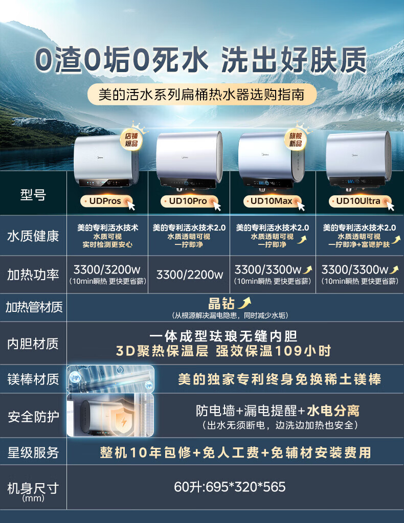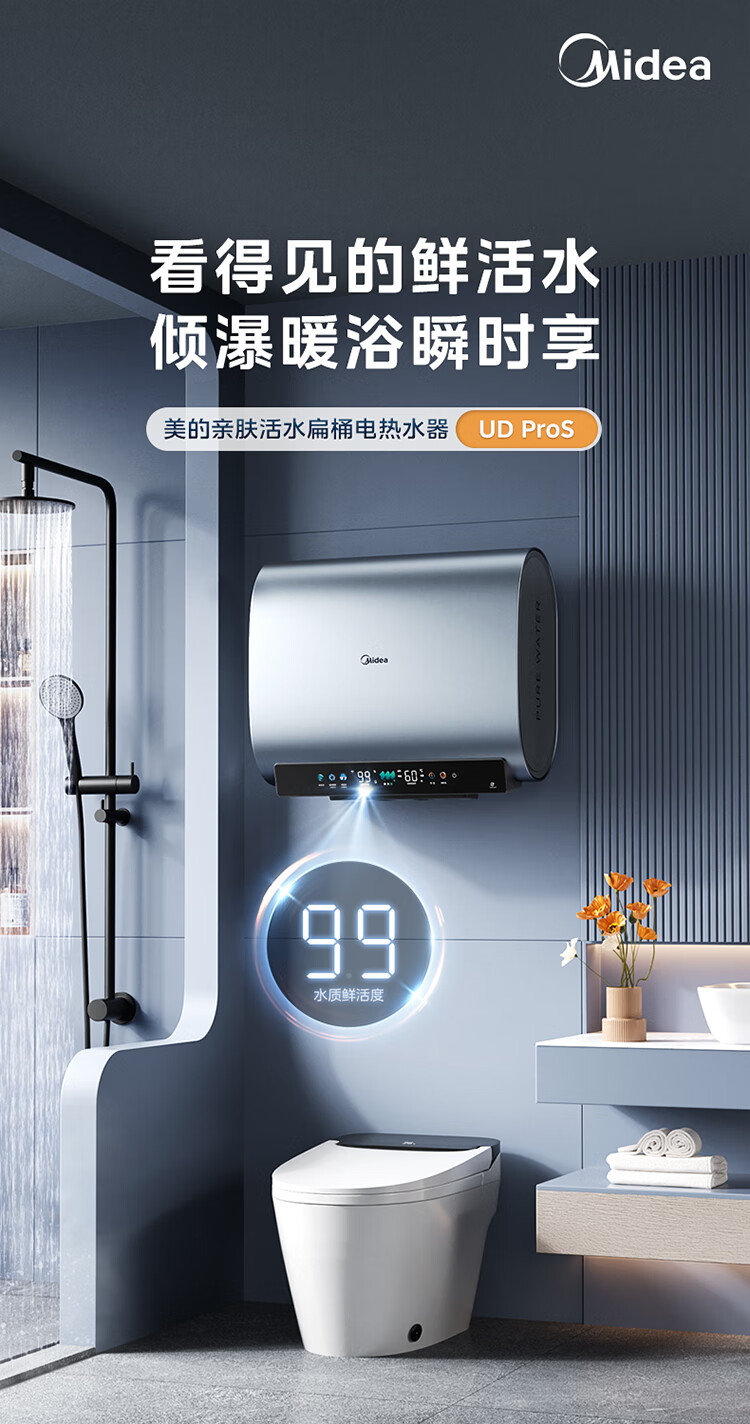 美的(Midea)【活水系列UDProS/UD10Max】电热水器水质可视自动排污60L双胆扁桶电热水器3300W水电分离一级能效