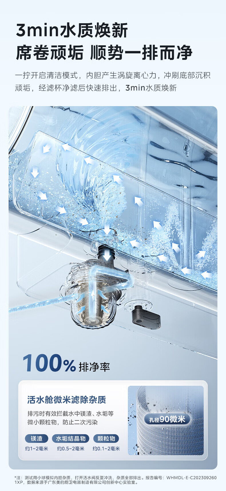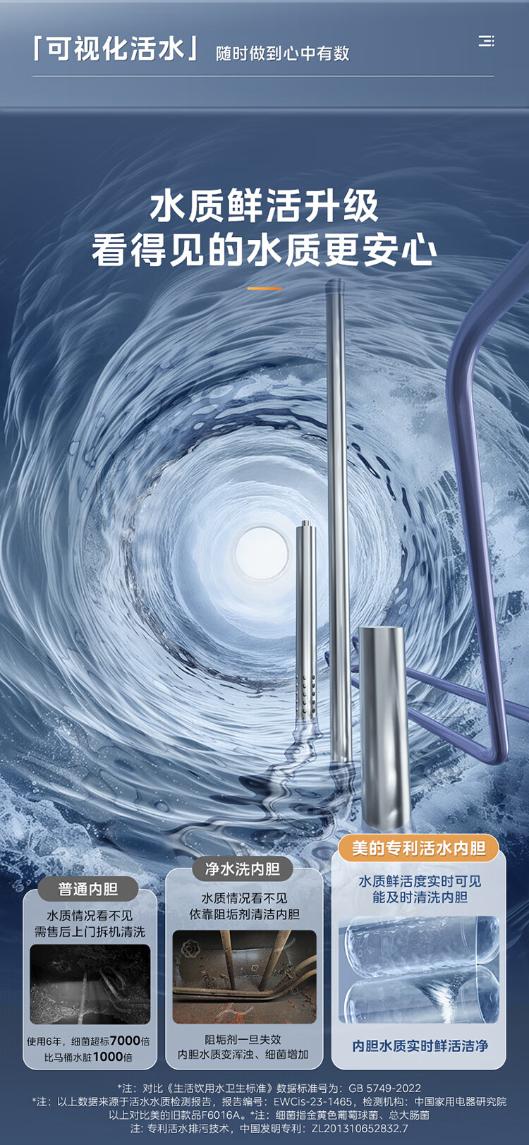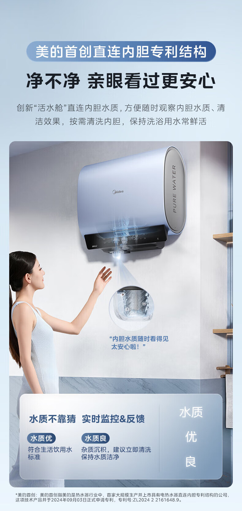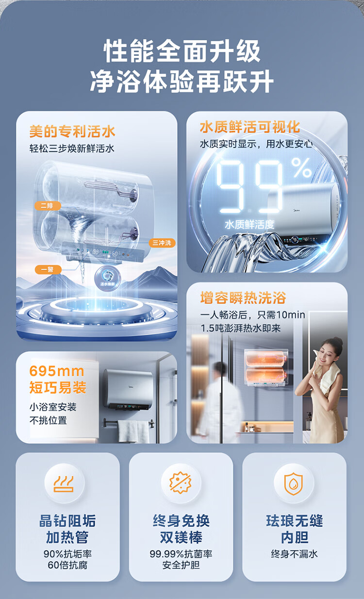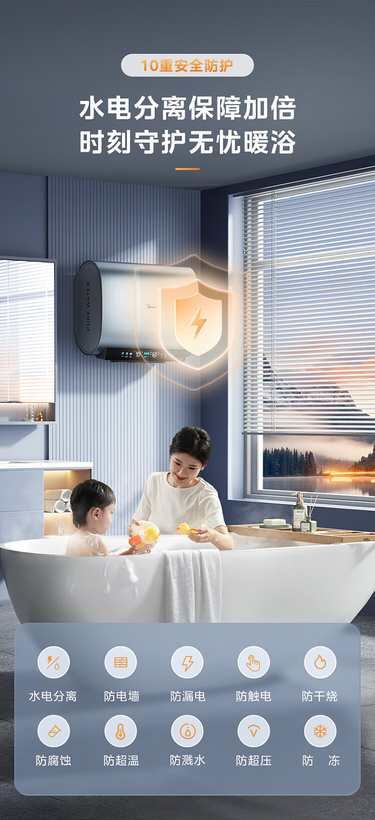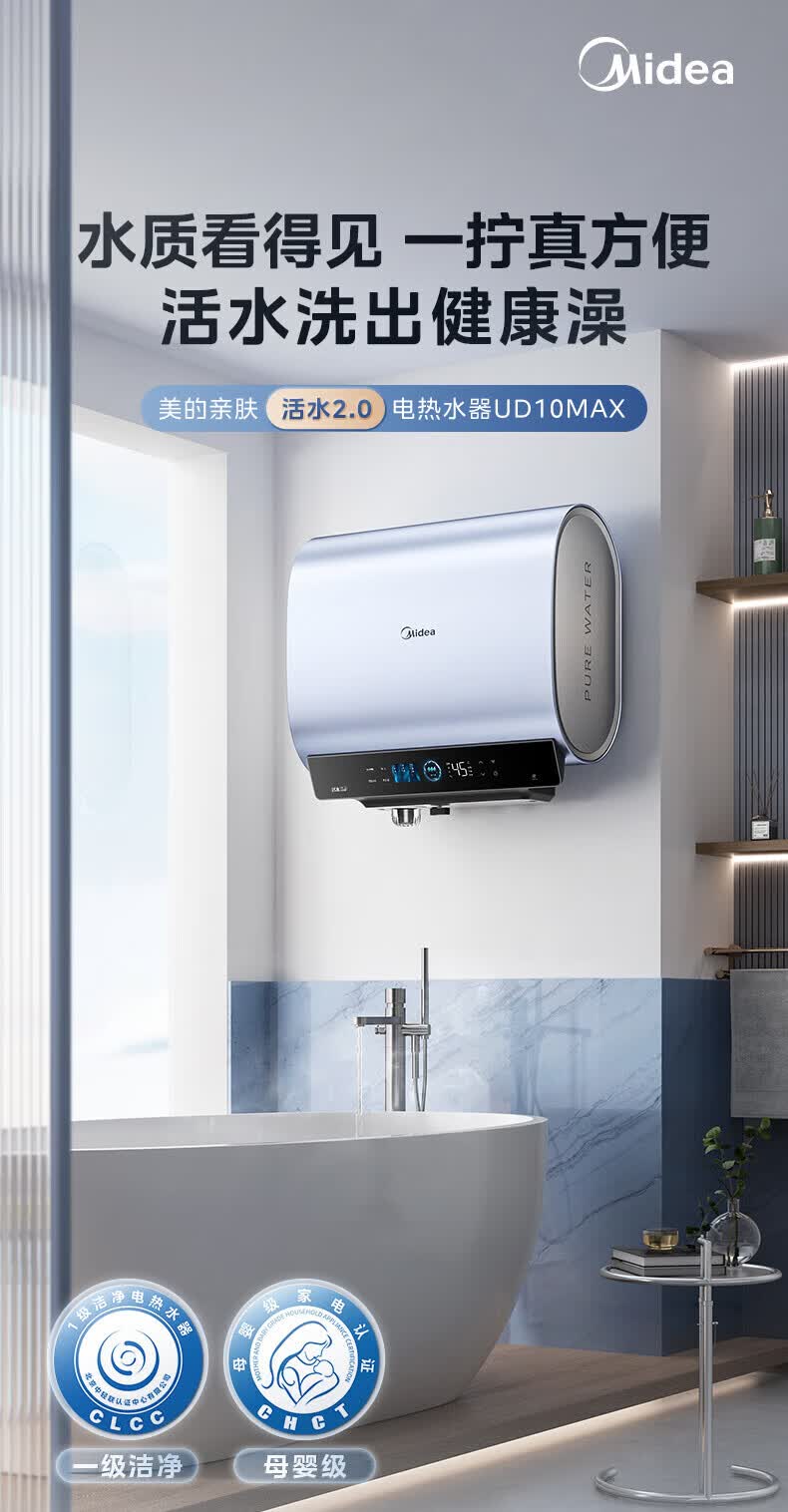 美的(Midea)【活水系列UDProS/UD10Max】电热水器水质可视自动排污60L双胆扁桶电热水器3300W水电分离一级能效