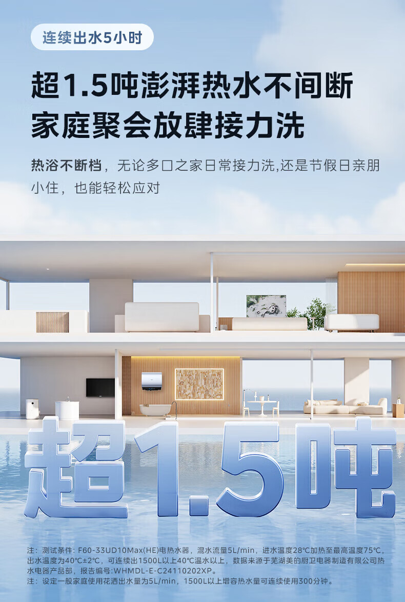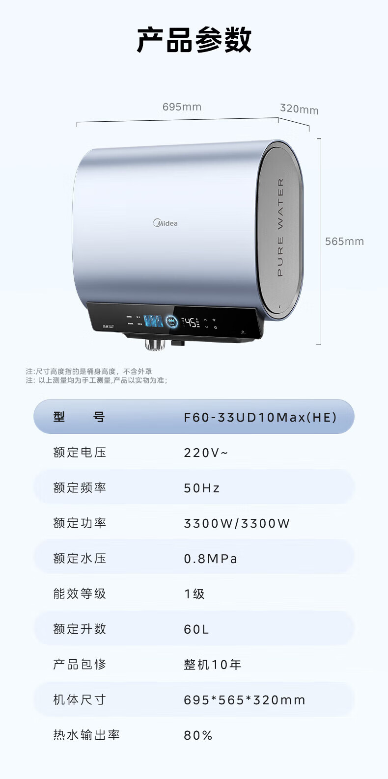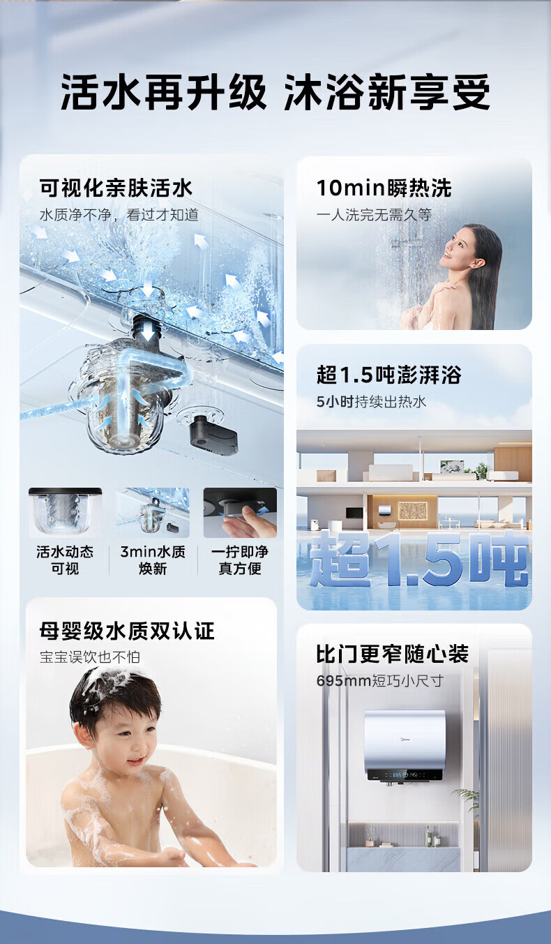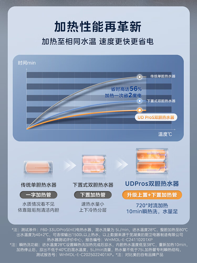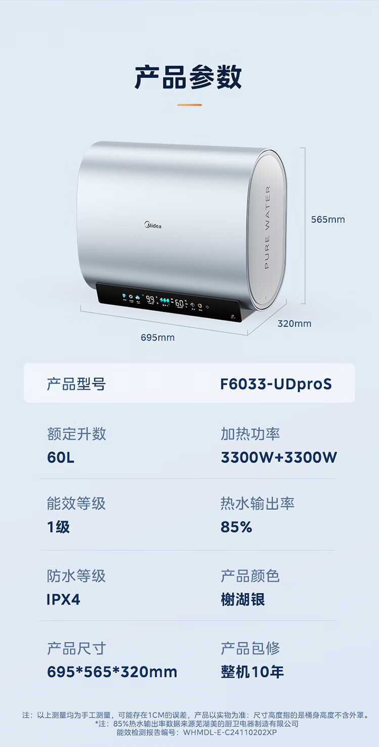 美的(Midea)【活水系列UDProS/UD10Max】电热水器水质可视自动排污60L双胆扁桶电热水器3300W水电分离一级能效