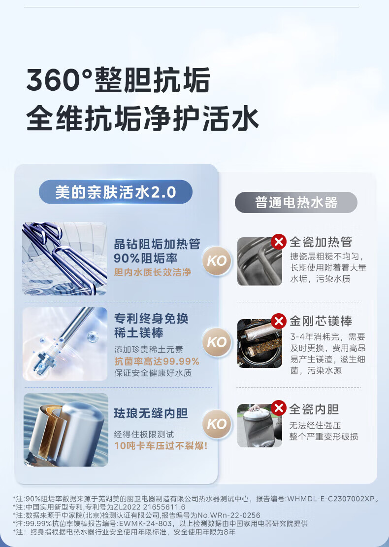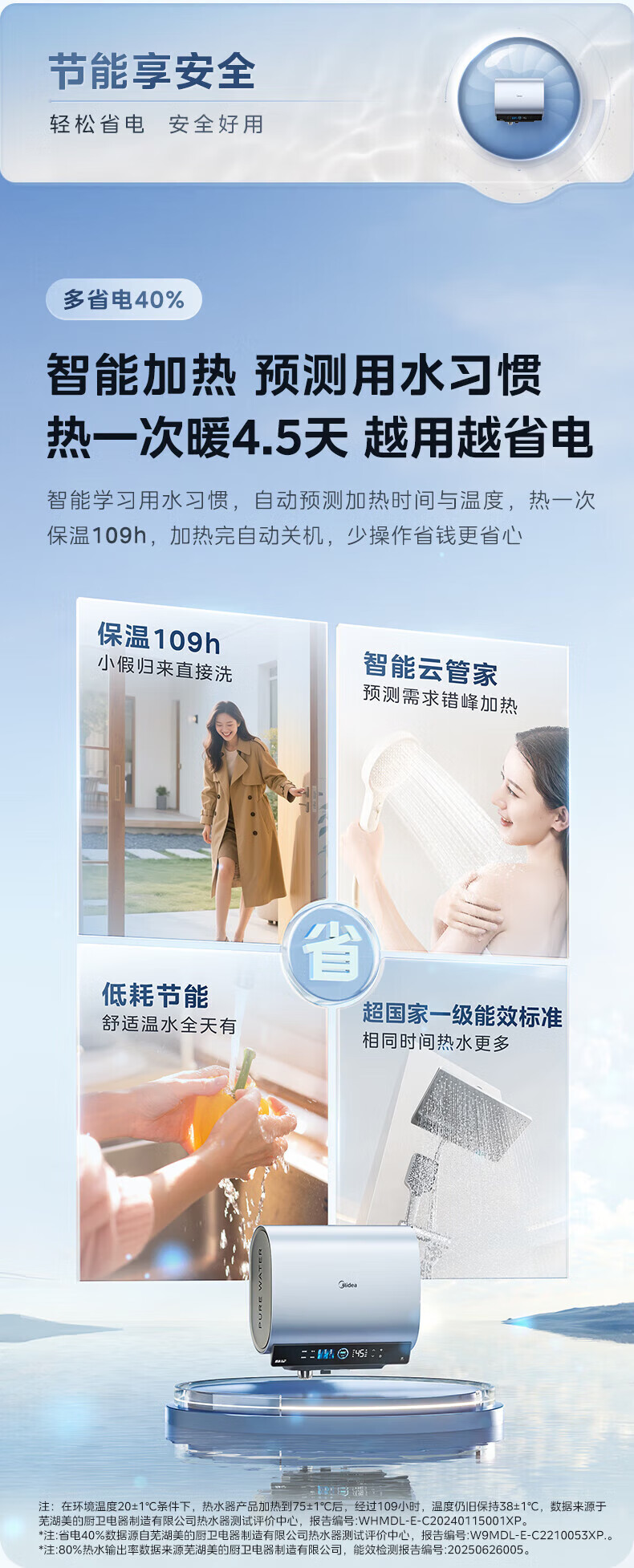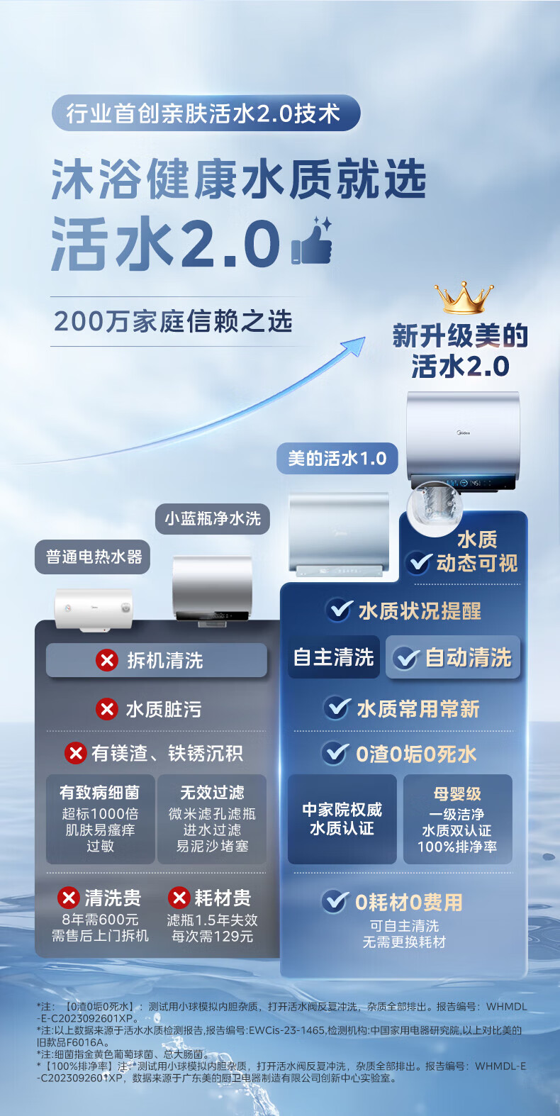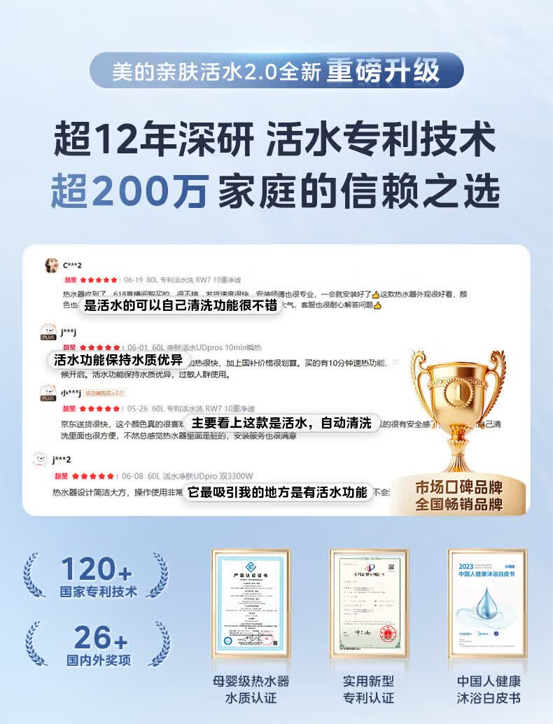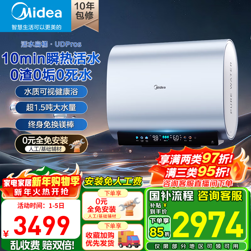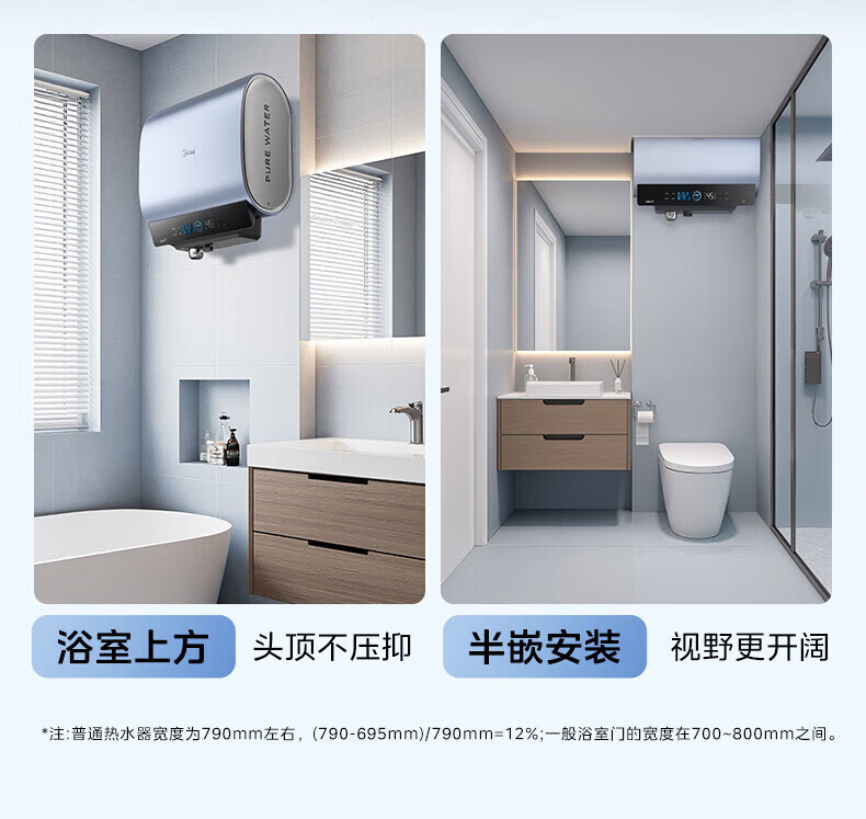 美的(Midea)【活水系列UDProS/UD10Max】电热水器水质可视自动排污60L双胆扁桶电热水器3300W水电分离一级能效