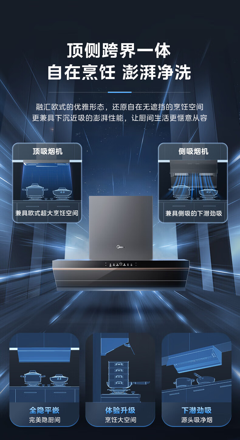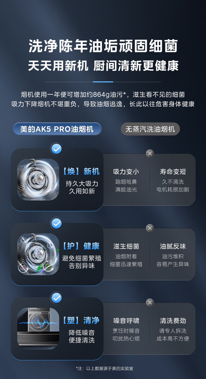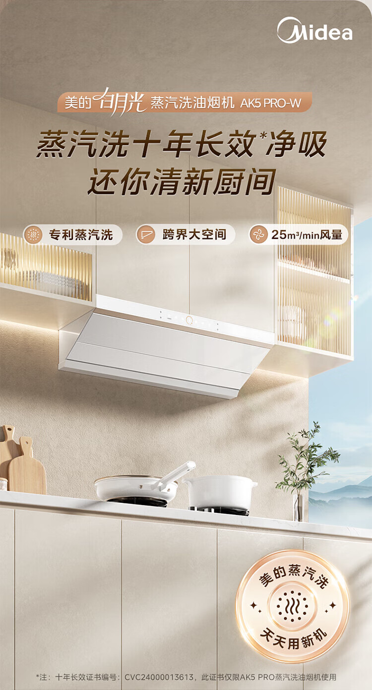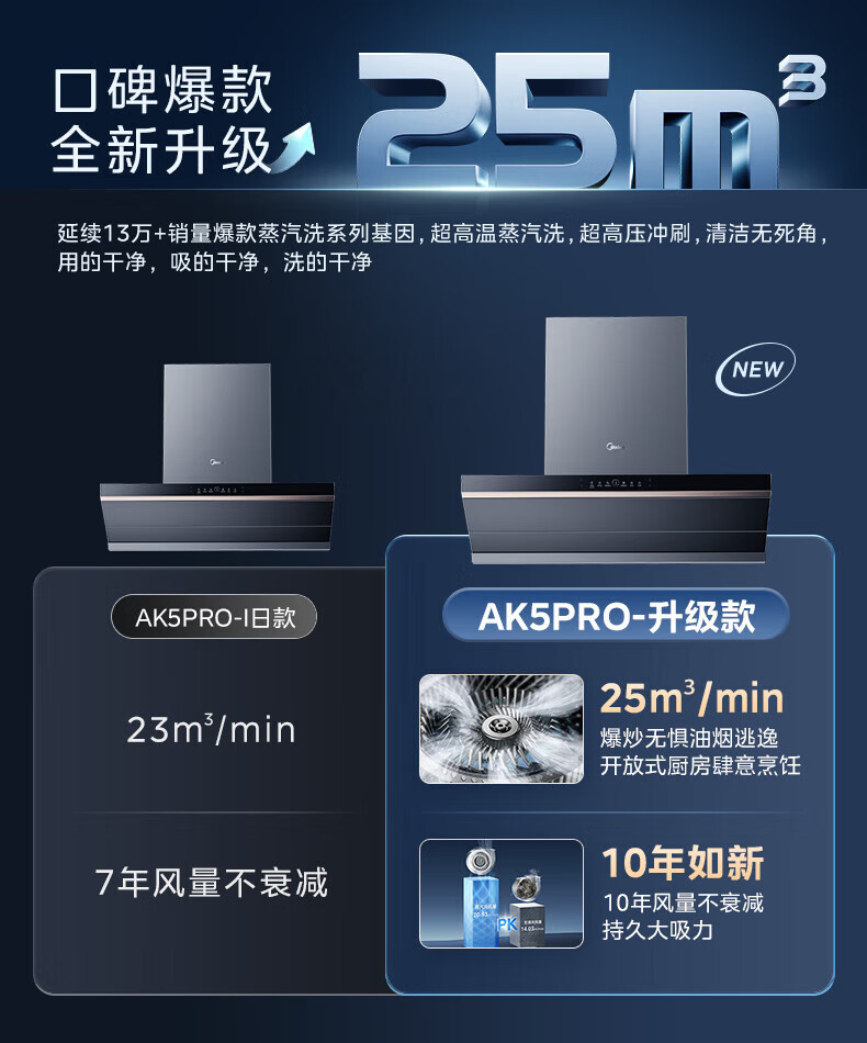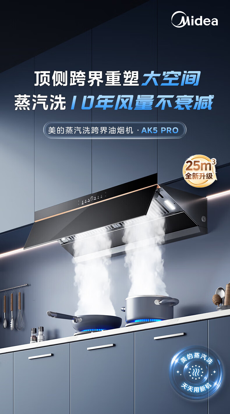 美的(Midea)【AK5pro升级款25风量】抽吸油烟机25顶侧一体欧式自清洁高温蒸汽洗变频巡航1000Pa静压