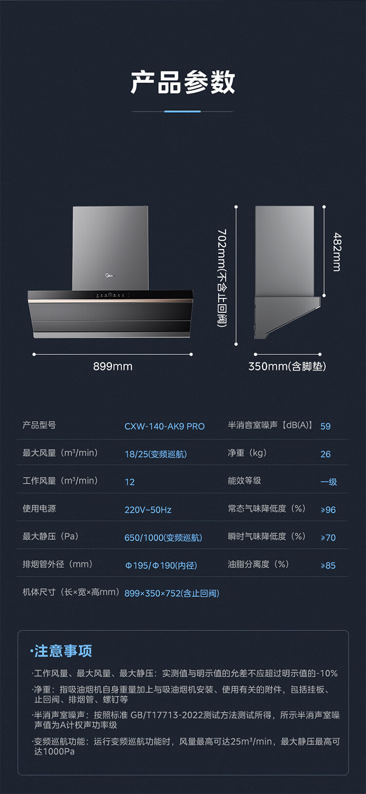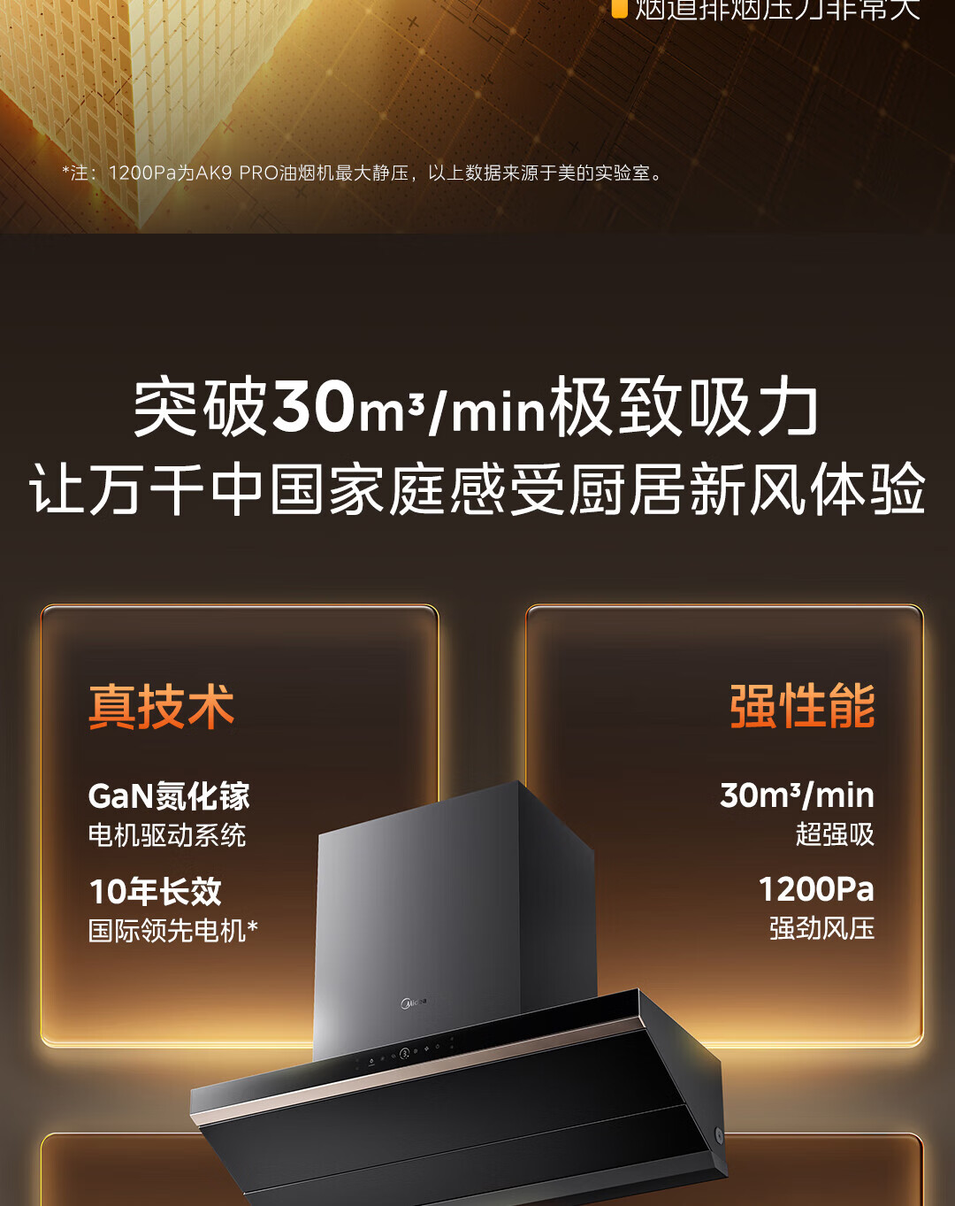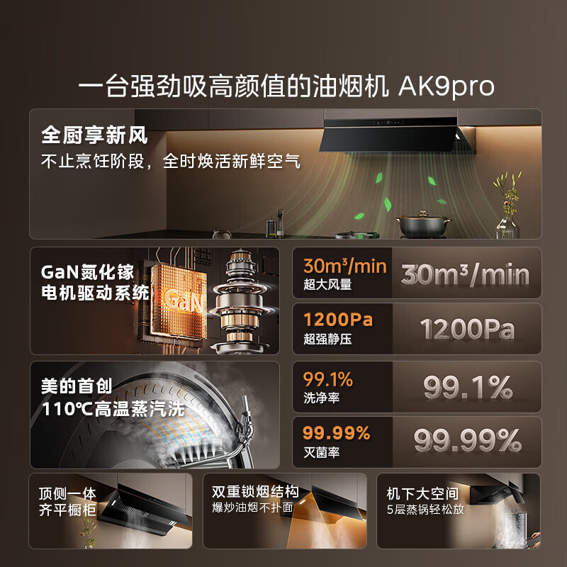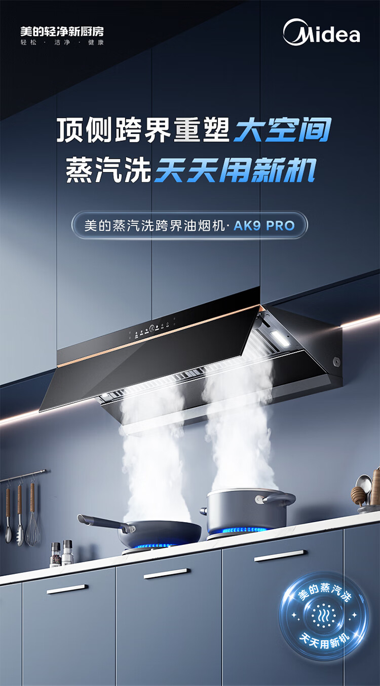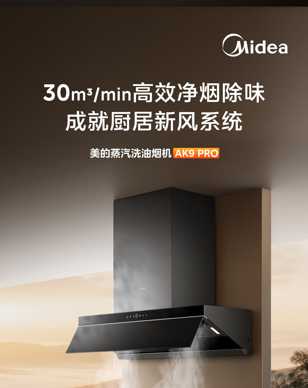 美的(Midea)【顶配新品AK9PR0】高温蒸汽洗抽油烟机 30风量 1200Pa静压 顶侧一体欧式变频烟灶联动吸油烟机 【顶配新品】30风量蒸汽洗AK9pro