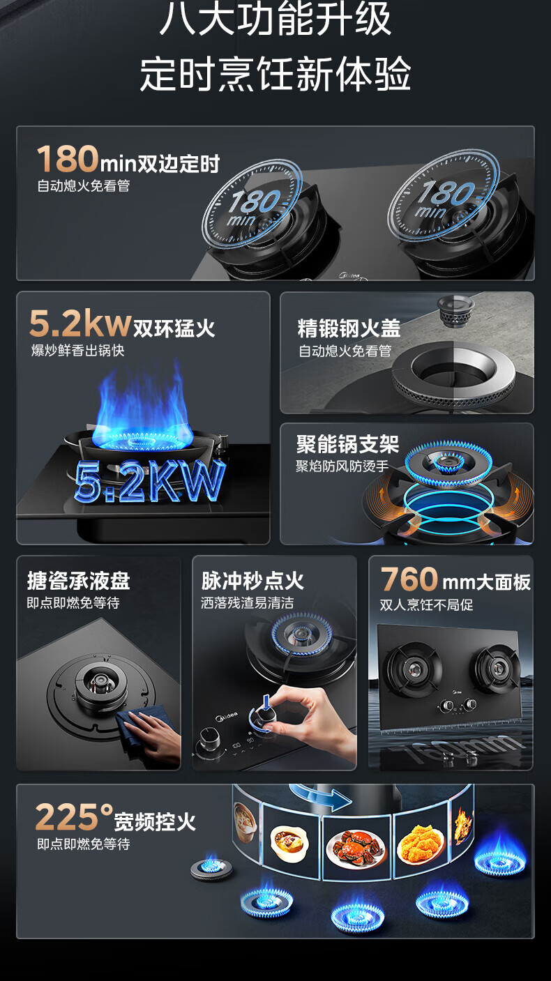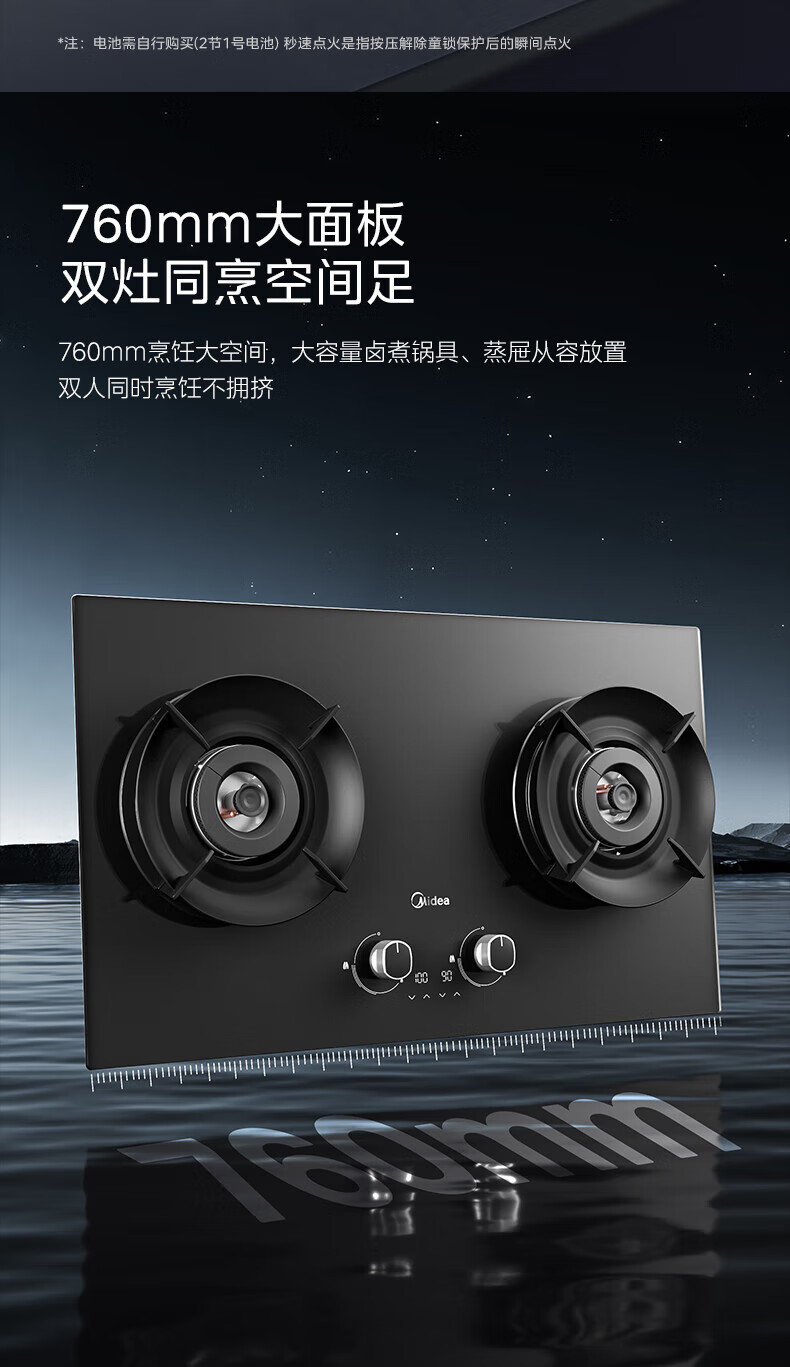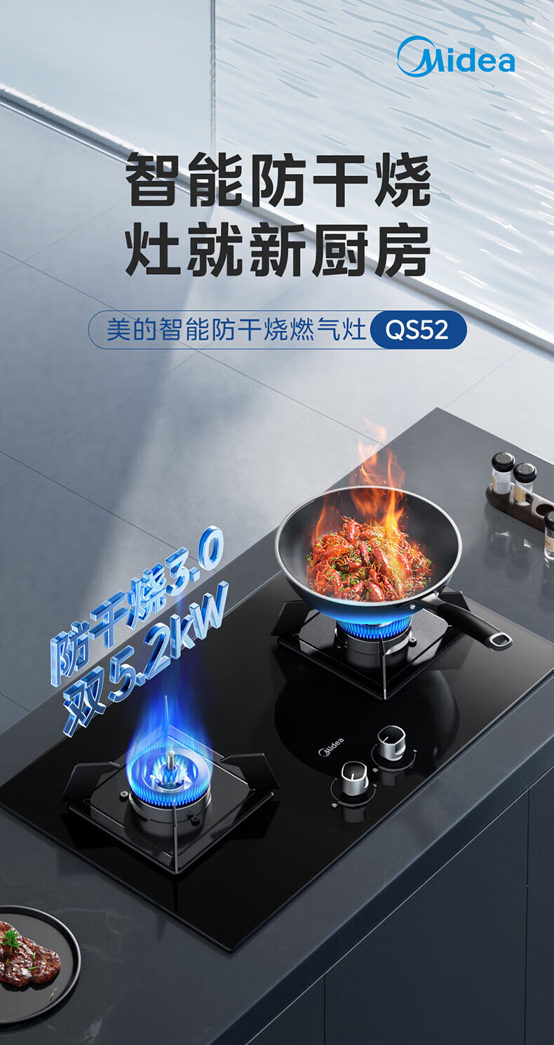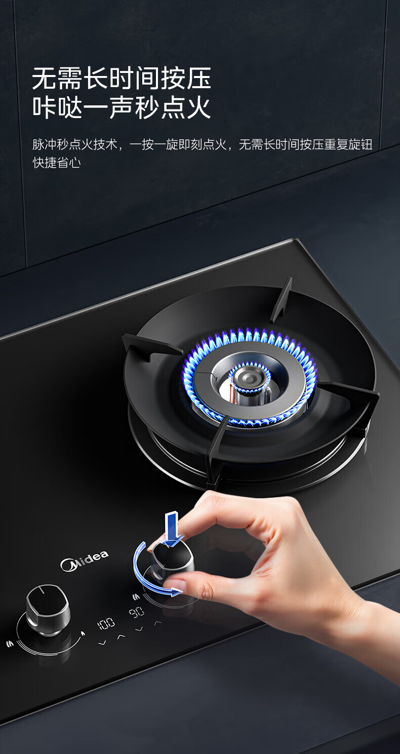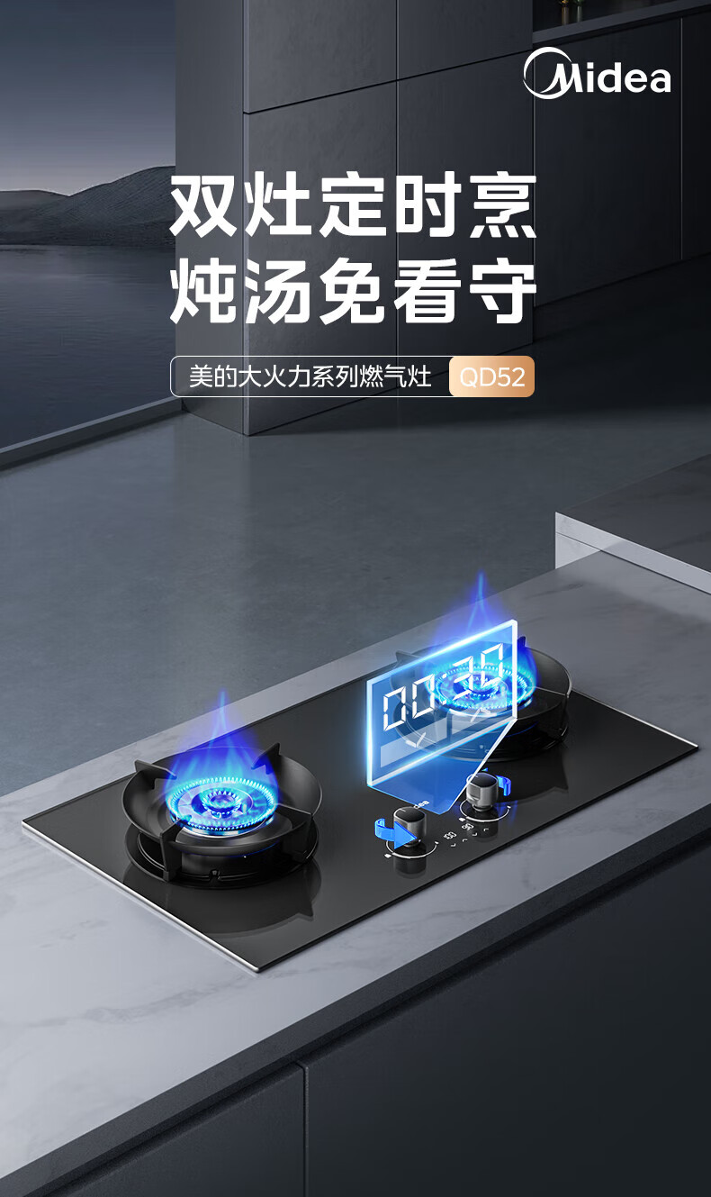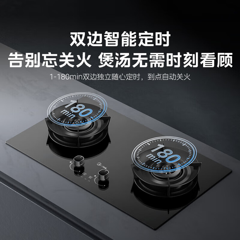美的(Midea)燃气灶家用5.2KW大火力 双边定时灶/防干烧灶可选 烟灶联动精铸铜火盖 台嵌两用双灶天然气灶