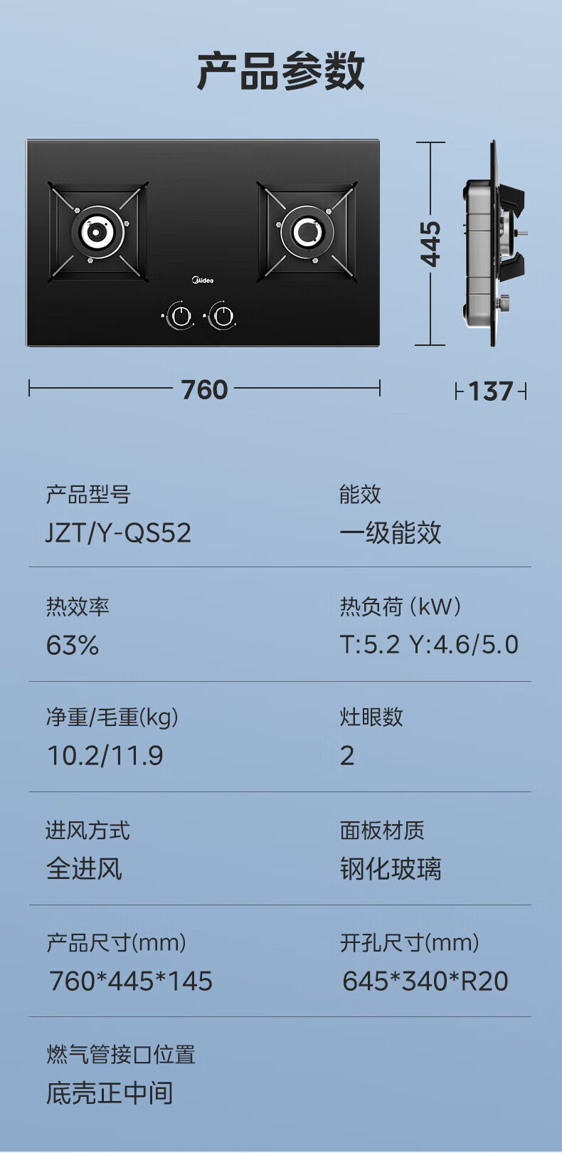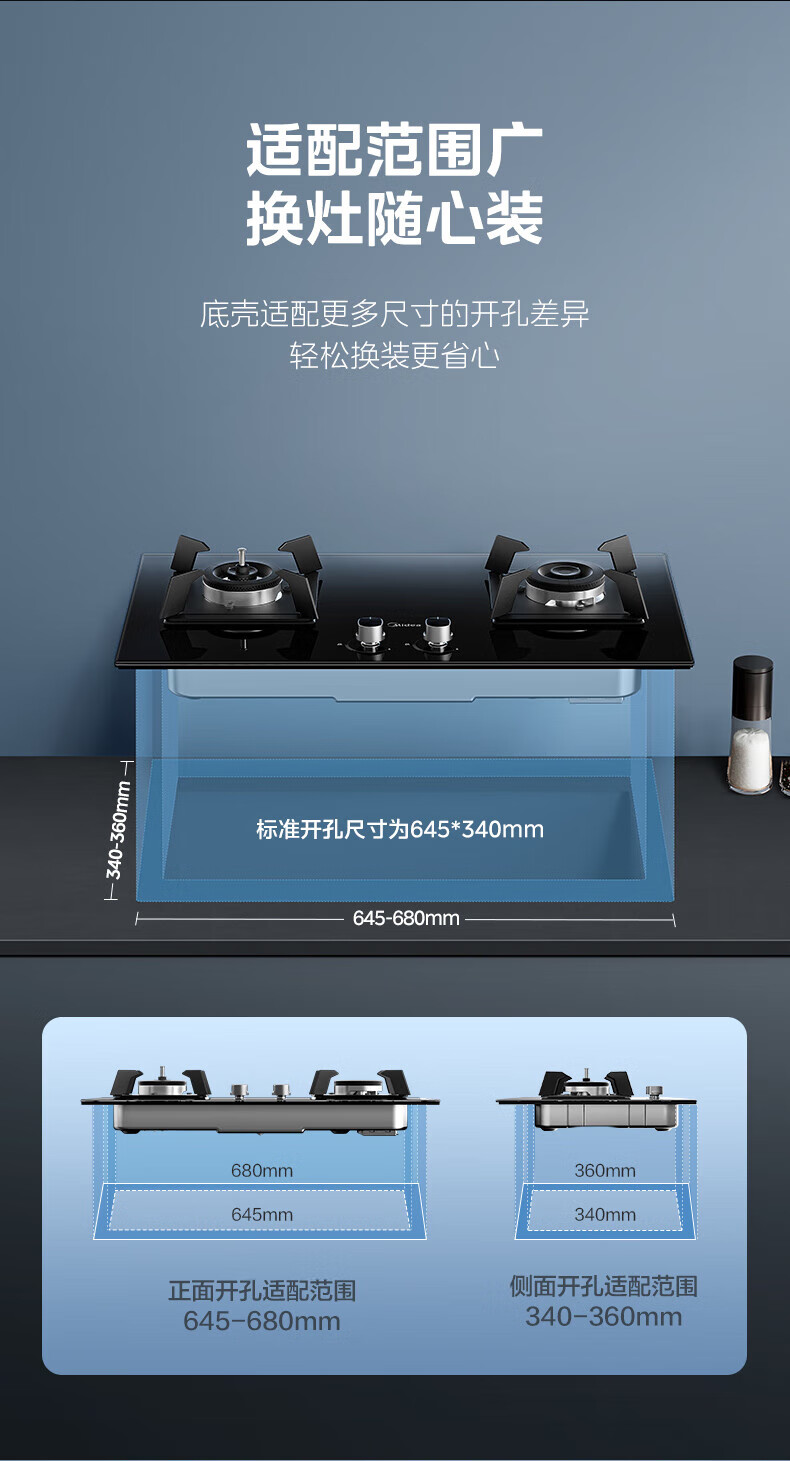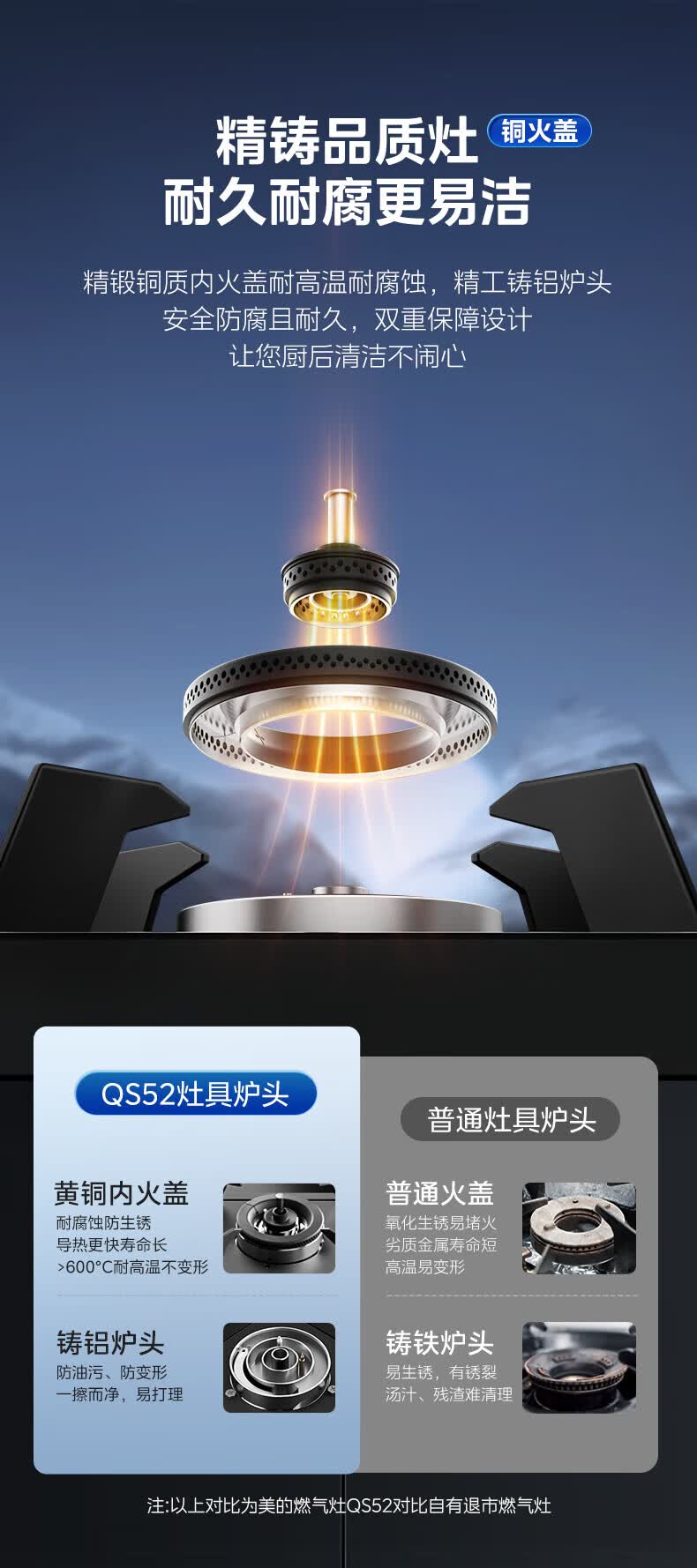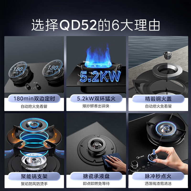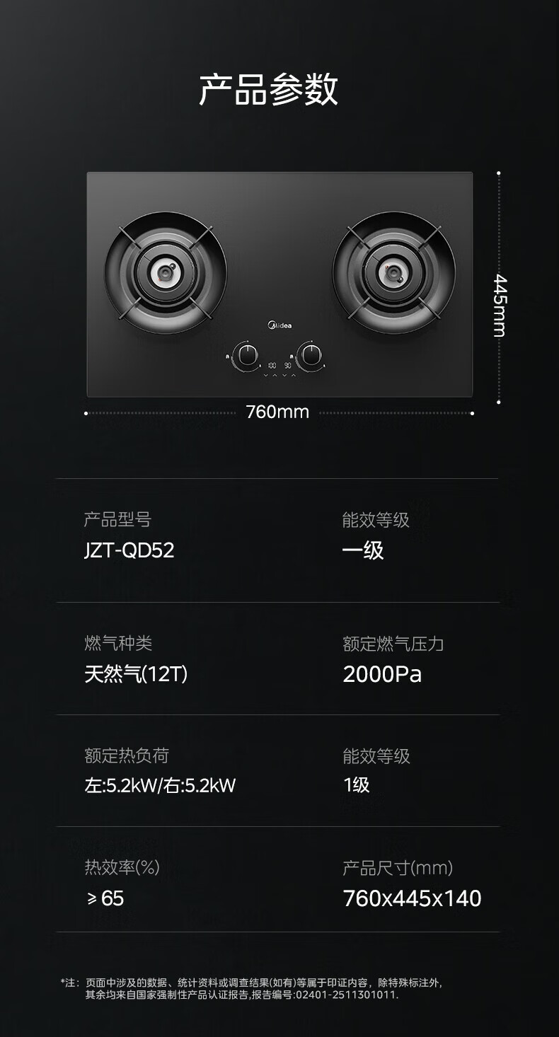 美的(Midea)燃气灶家用5.2KW大火力 双边定时灶/防干烧灶可选 烟灶联动精铸铜火盖 台嵌两用双灶天然气灶