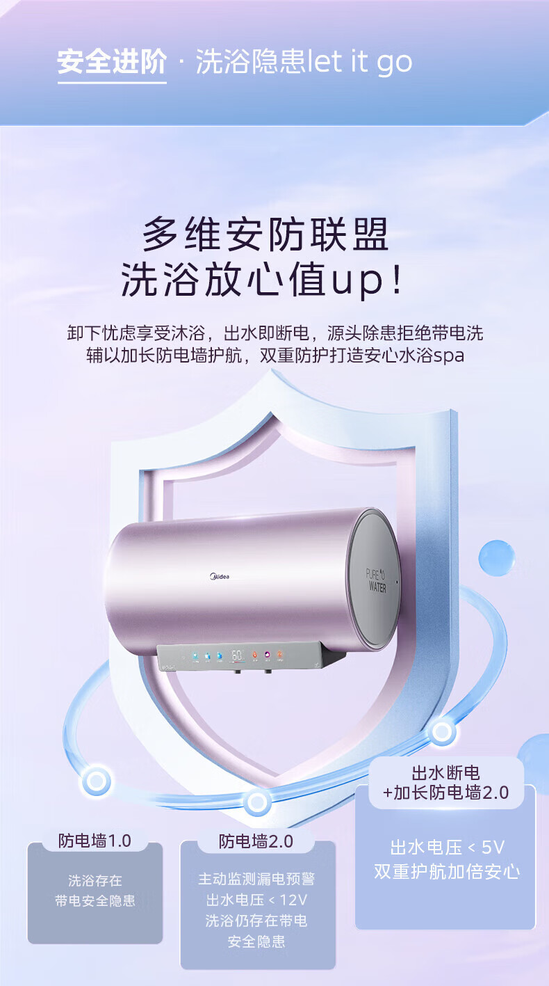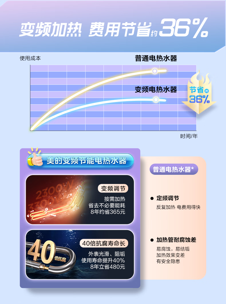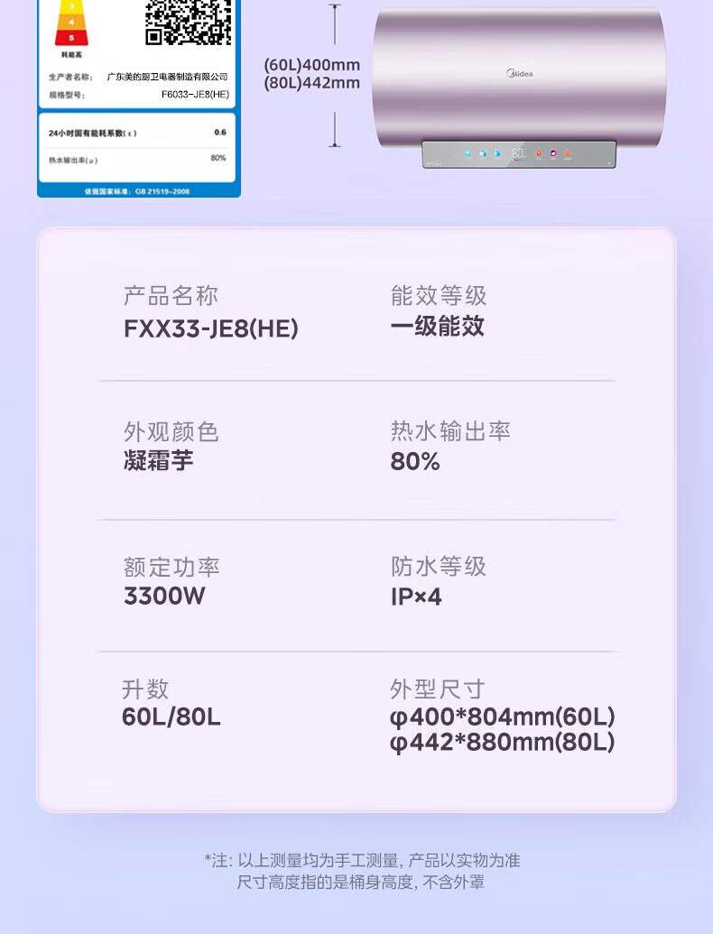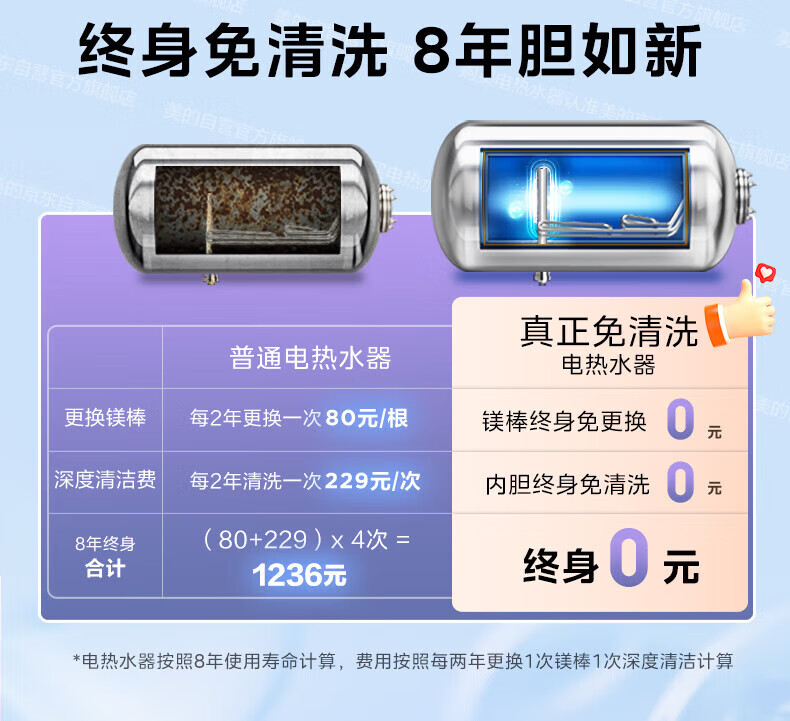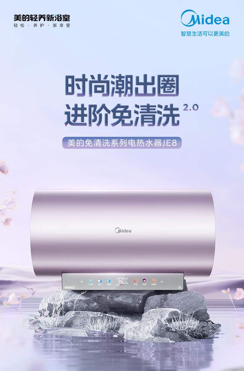 美的(Midea)【终身免清洗2.0】电热水器家用60/80升3300W变频速热出水断电镁棒免更换一级能效补贴立减20%JE8