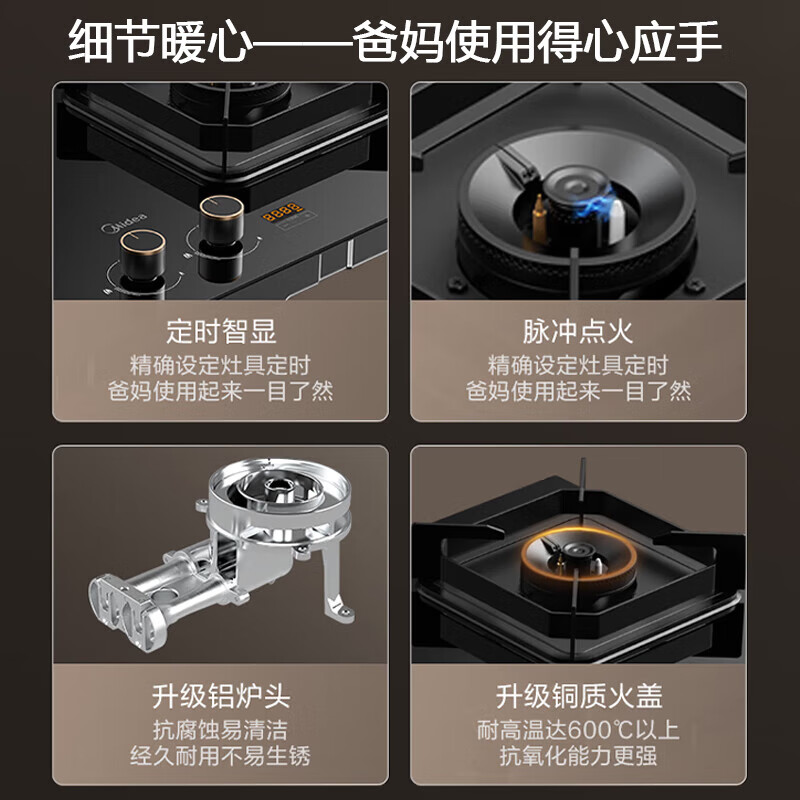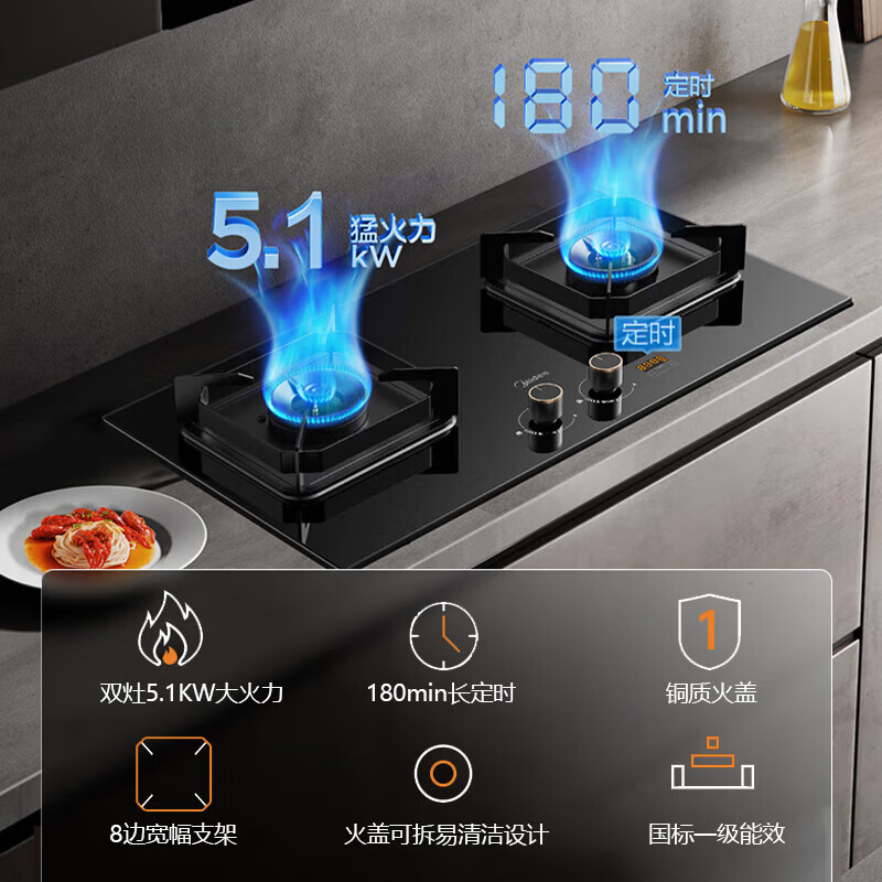 美的(Midea)【国家补贴20%】燃气灶双灶家用 180分钟定时加大搪瓷乘液盘天然气液化气罐装煤气灶 天然气【升级款Q518P】铜火盖5.0猛火灶