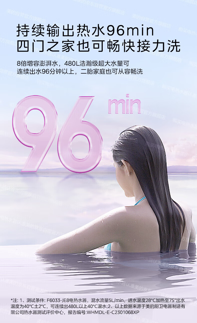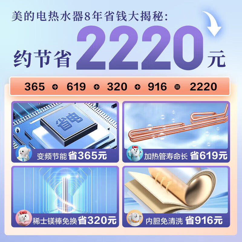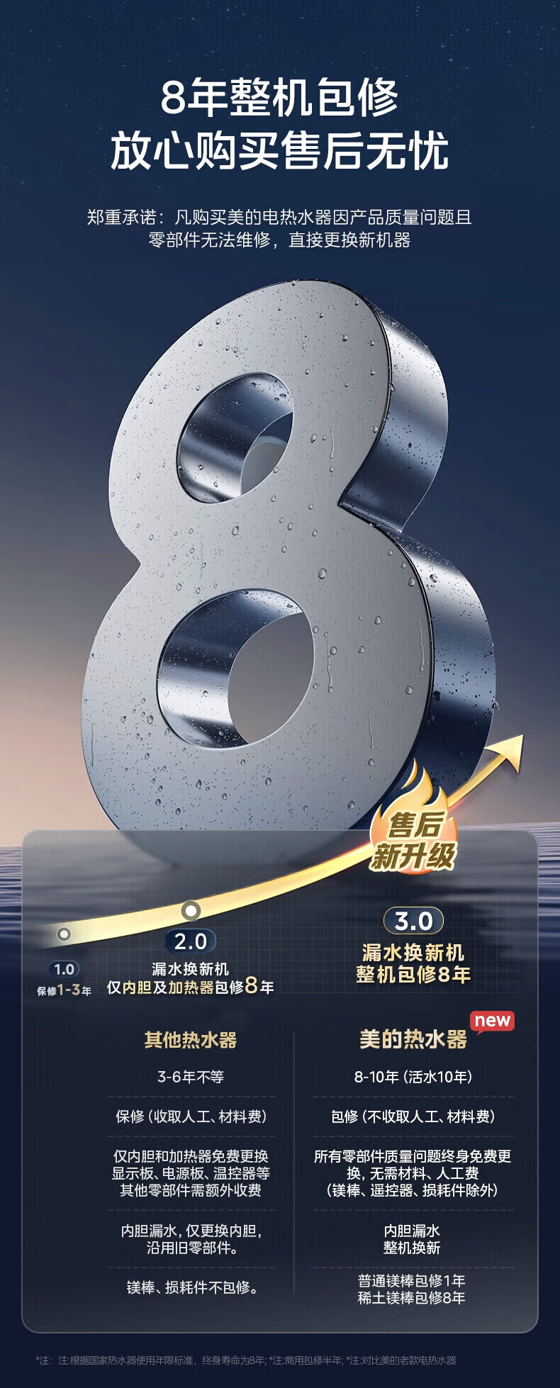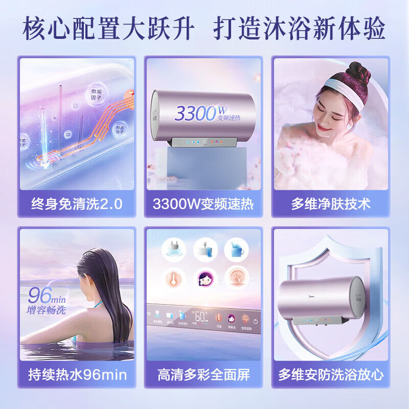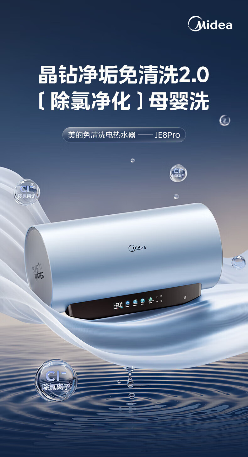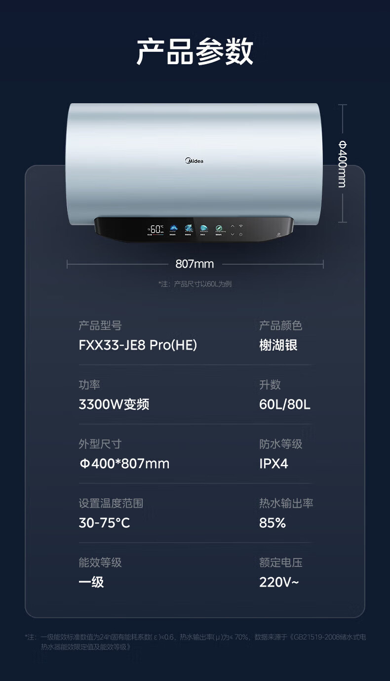 美的(Midea)【终身免清洗】电热水器家用稀土免换镁棒60/80升3300W变频速热出水断电阻垢一级能效JE8/JE8pro