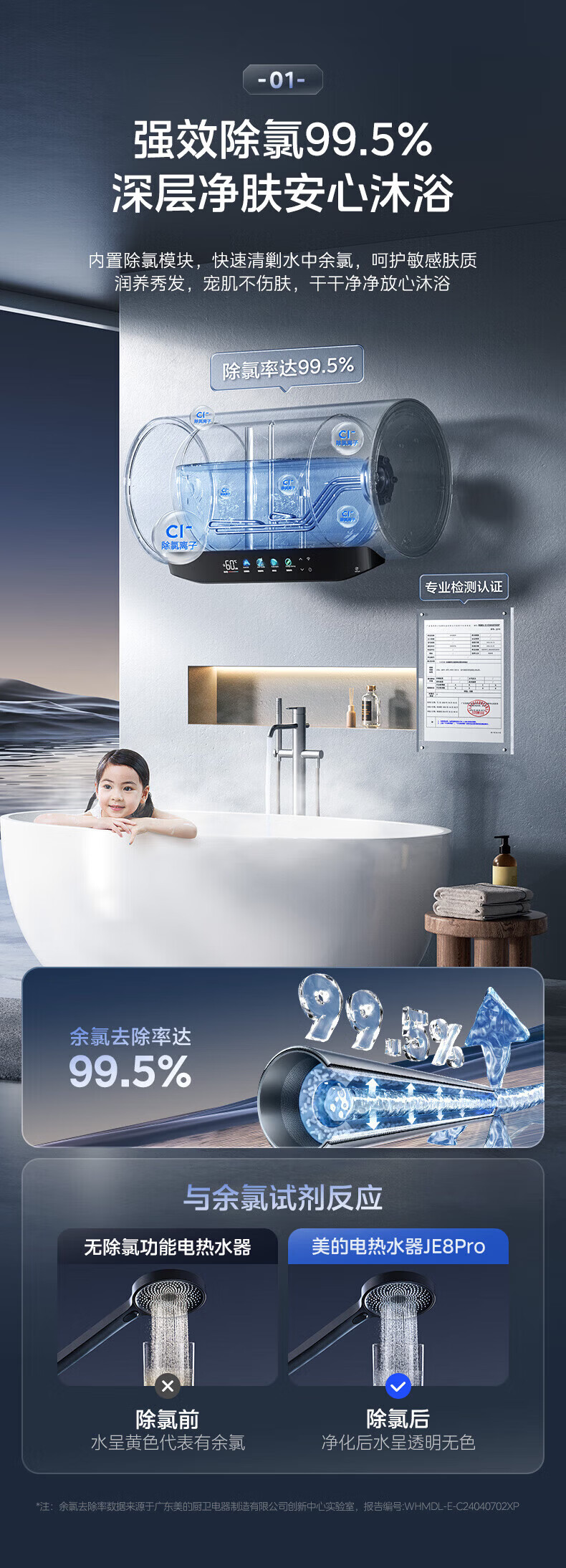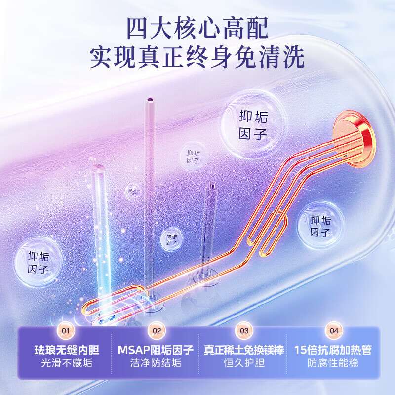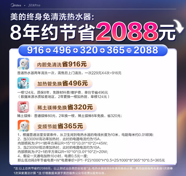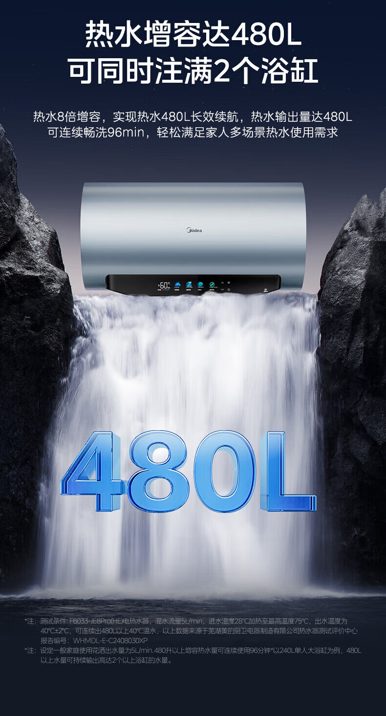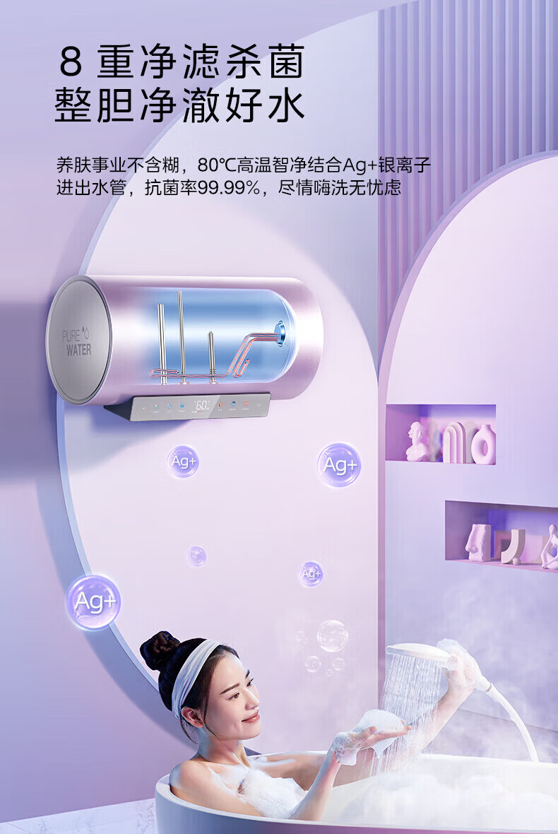 美的(Midea)【终身免清洗】电热水器家用稀土免换镁棒60/80升3300W变频速热出水断电阻垢一级能效JE8/JE8pro