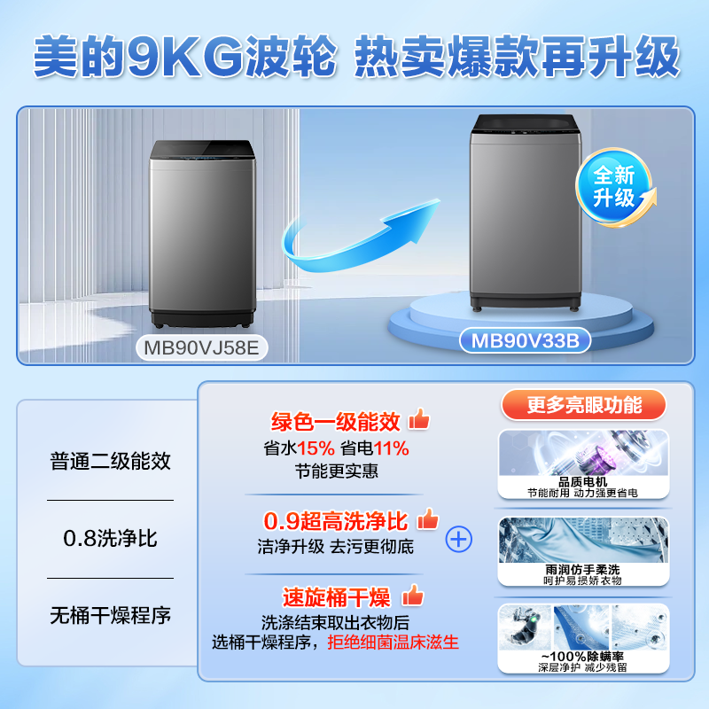 美的(Midea)波轮洗衣机全自动家用9公斤大容量100%健康除螨一级能效宿舍租房神器以旧换新 MB90V33B