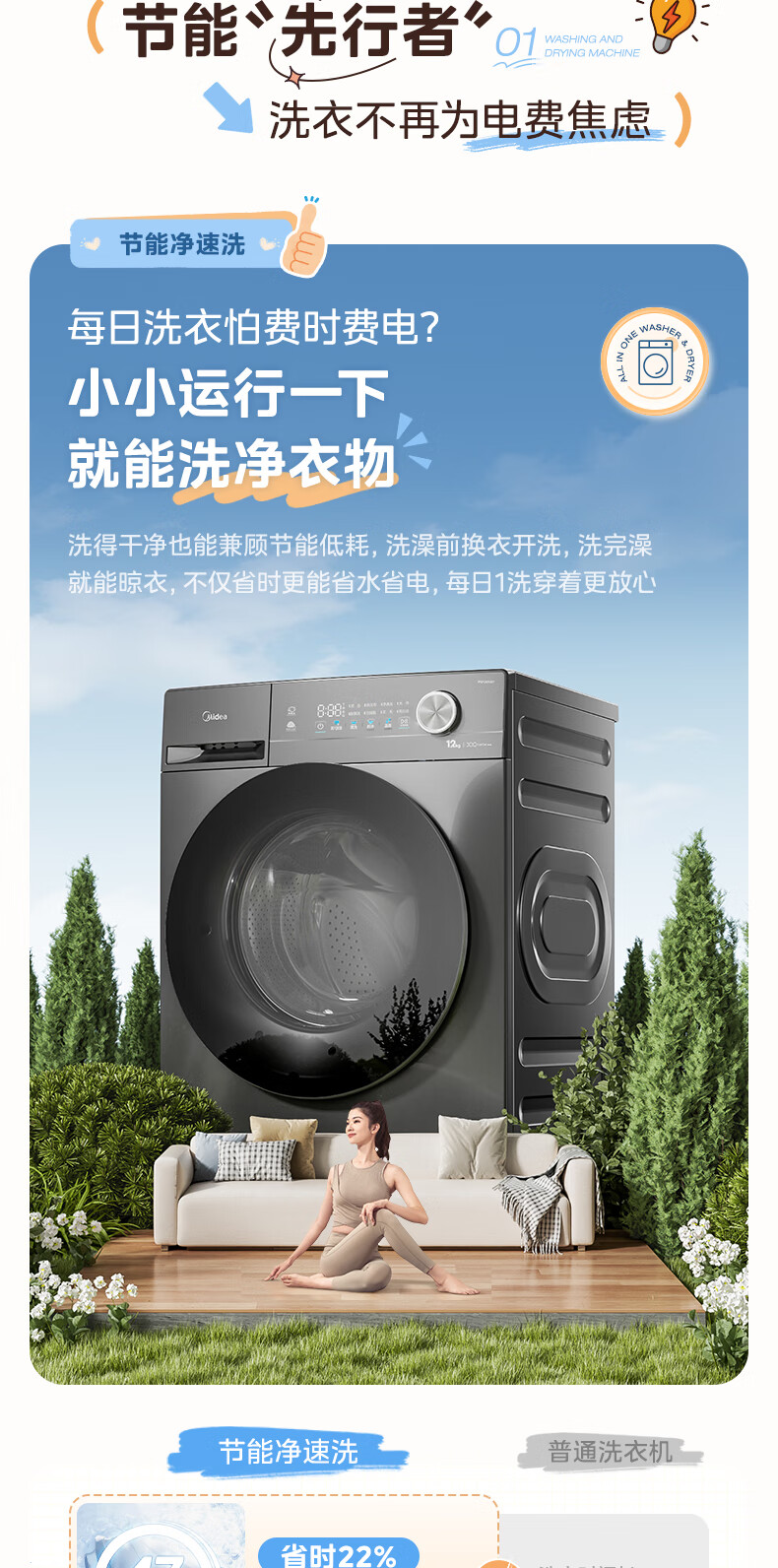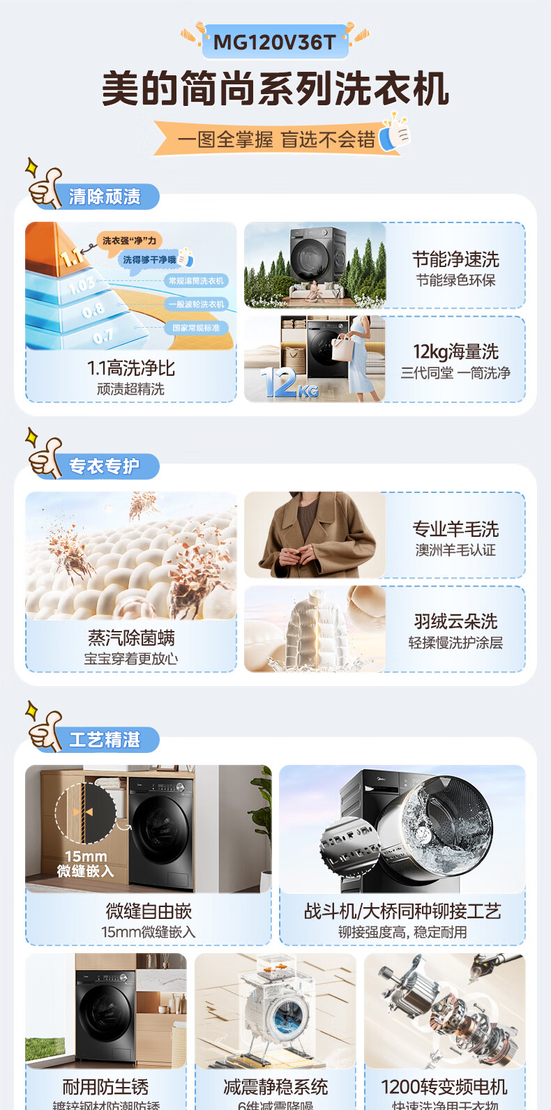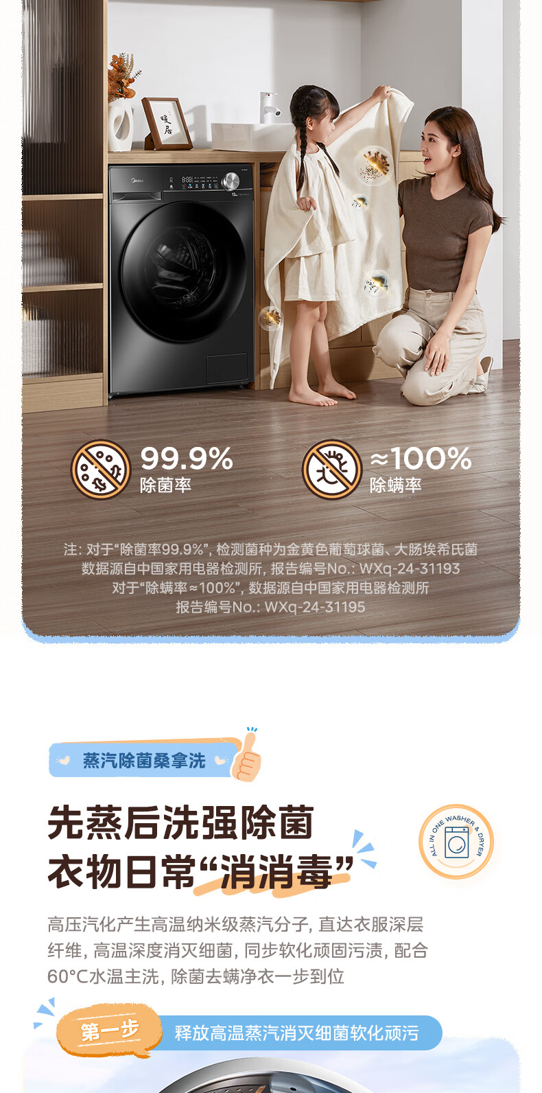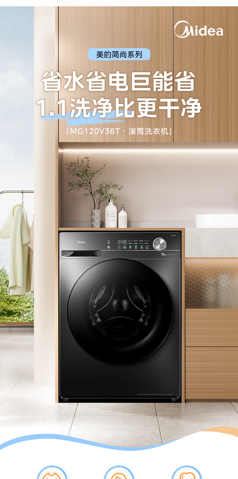 美的(Midea)滚筒洗衣机全自动家电一级能效以旧换新12公斤1.1高洗净比变频电机高温筒自洁蒸汽除菌 MG120V36T