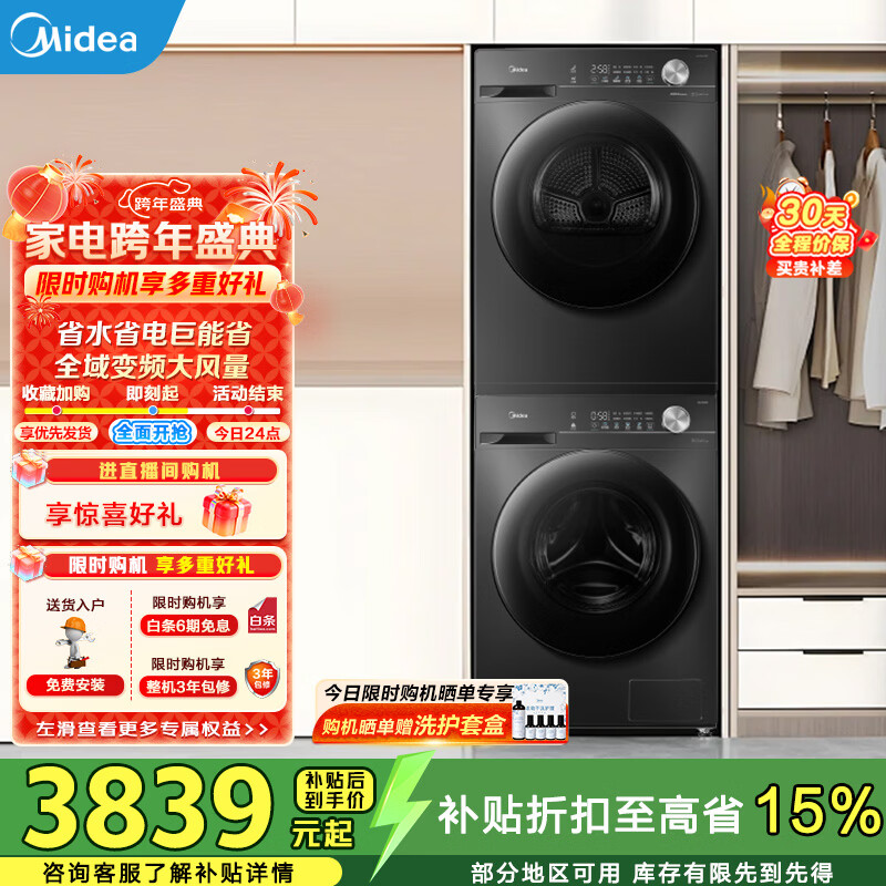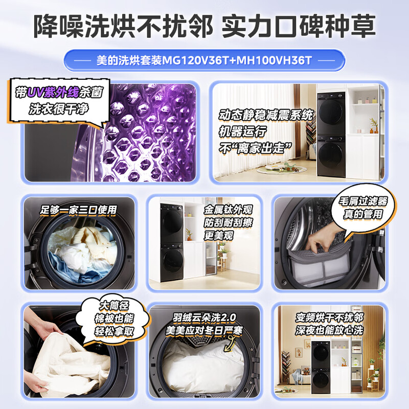美的(Midea)洗烘套装12kg滚筒洗衣机+10kg变频热泵烘干机1.1高洗净比AI正反转双变频 MG120V36T+MH100VH36T