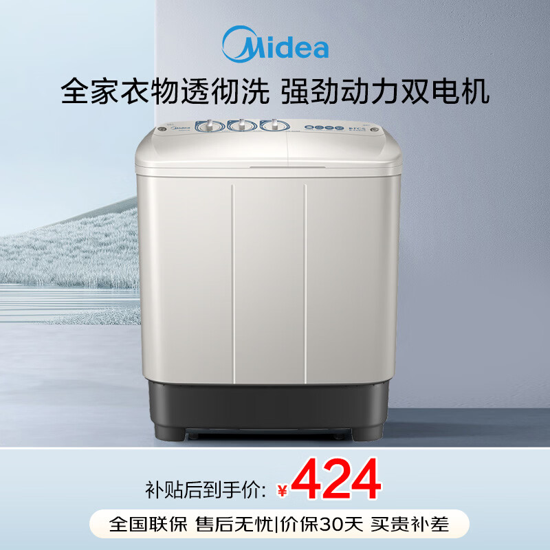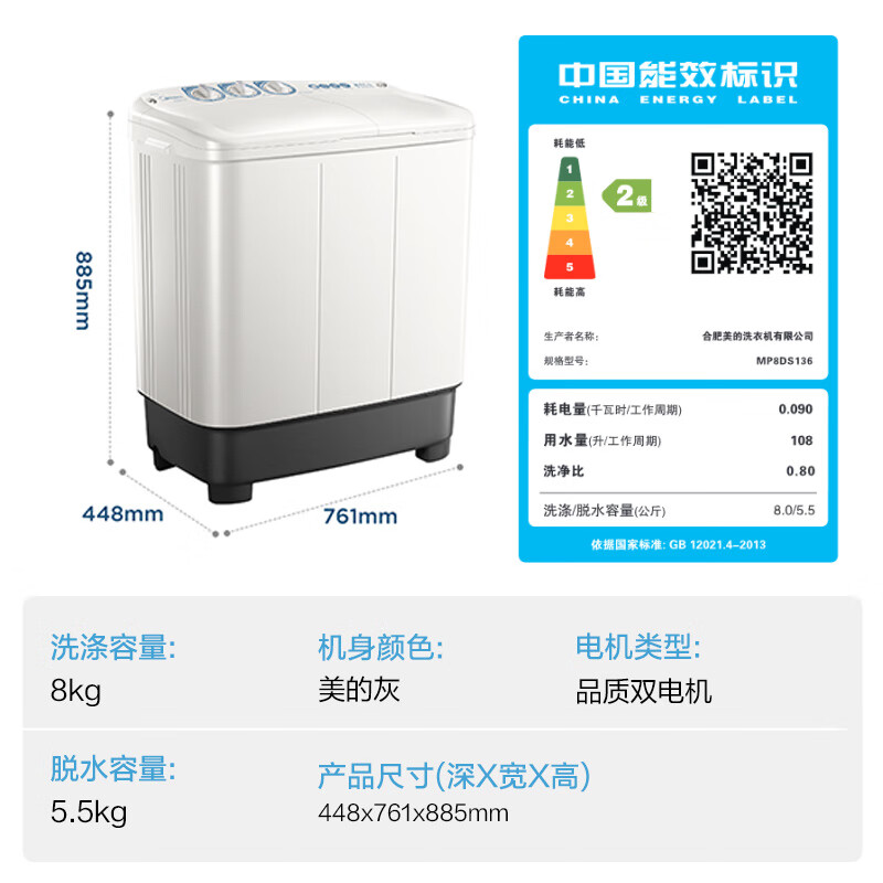 美的(Midea)双桶洗衣机8kg大容量家用品质双电机净洗科技同洗同脱二级能效 MP8DS136