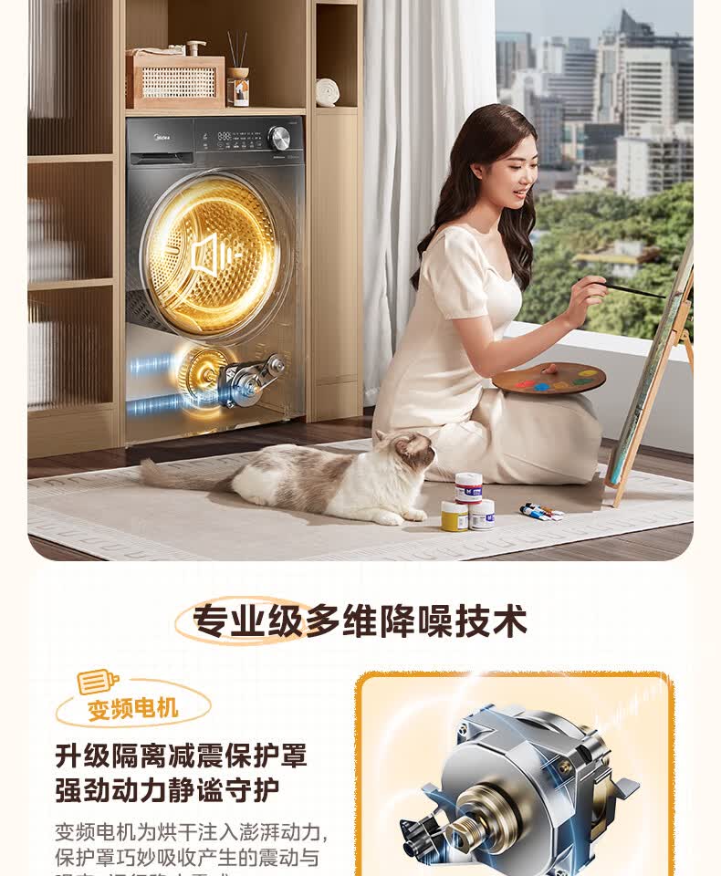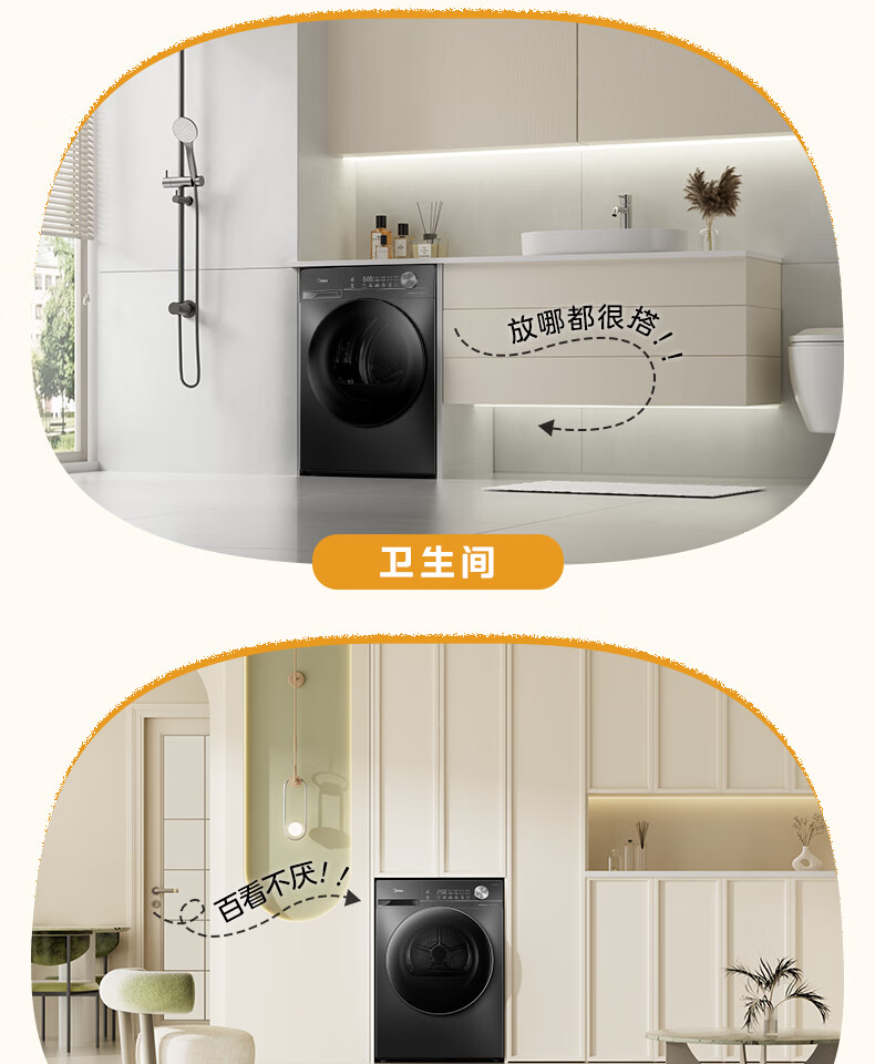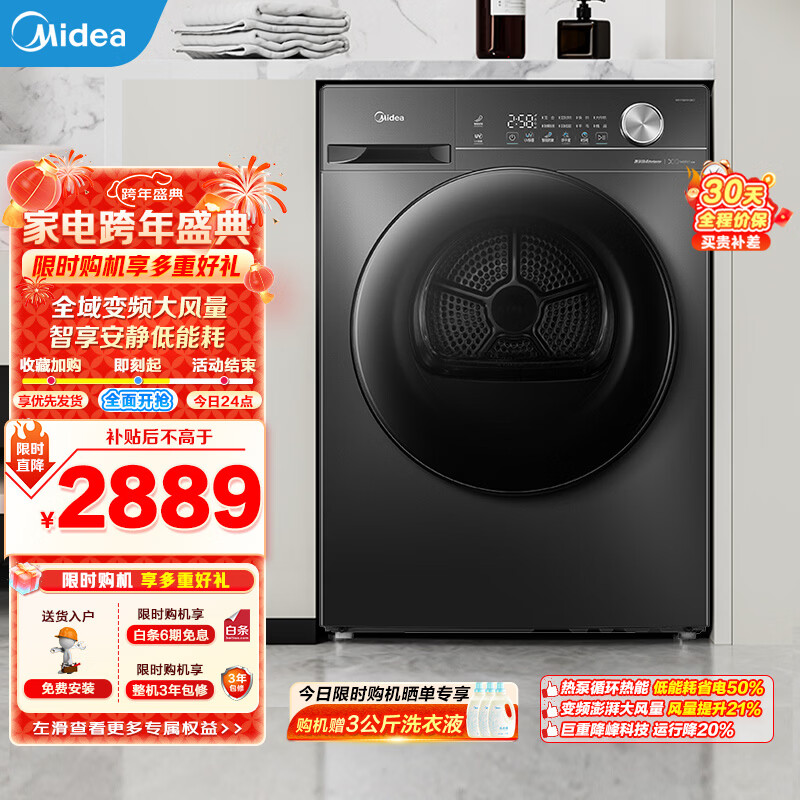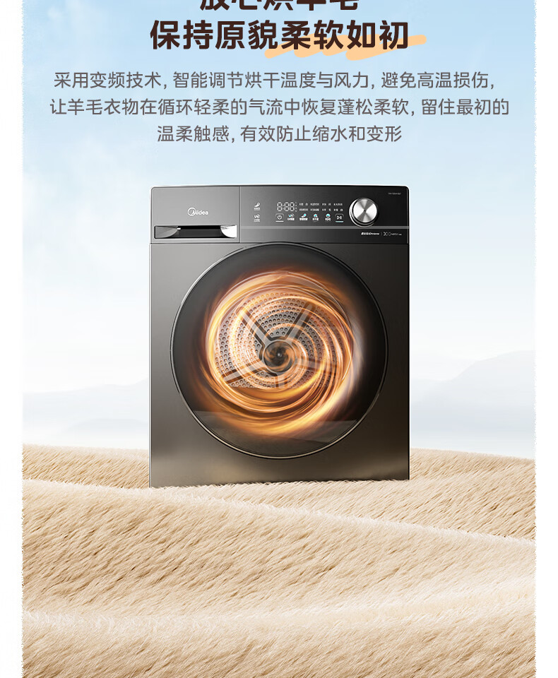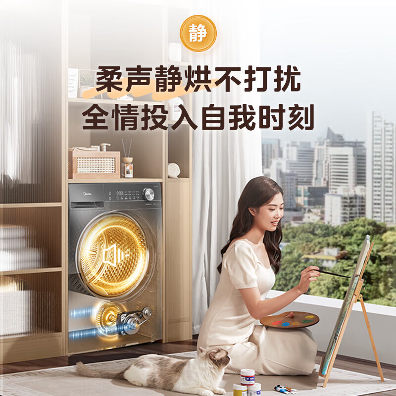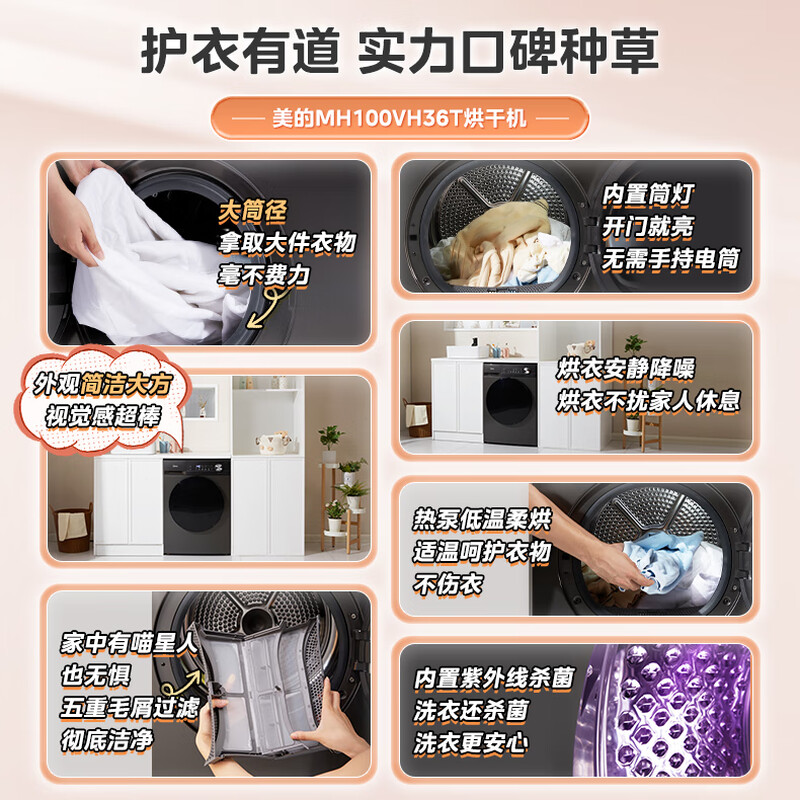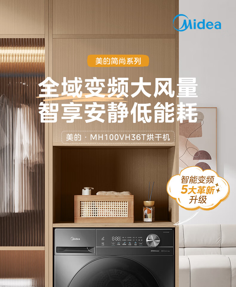 美的(Midea)热泵烘干机全自动10kg家用滚筒式干衣机变频回南天柔声静烘580mm大筒径低温柔烘以旧换新 MH100VH36T
