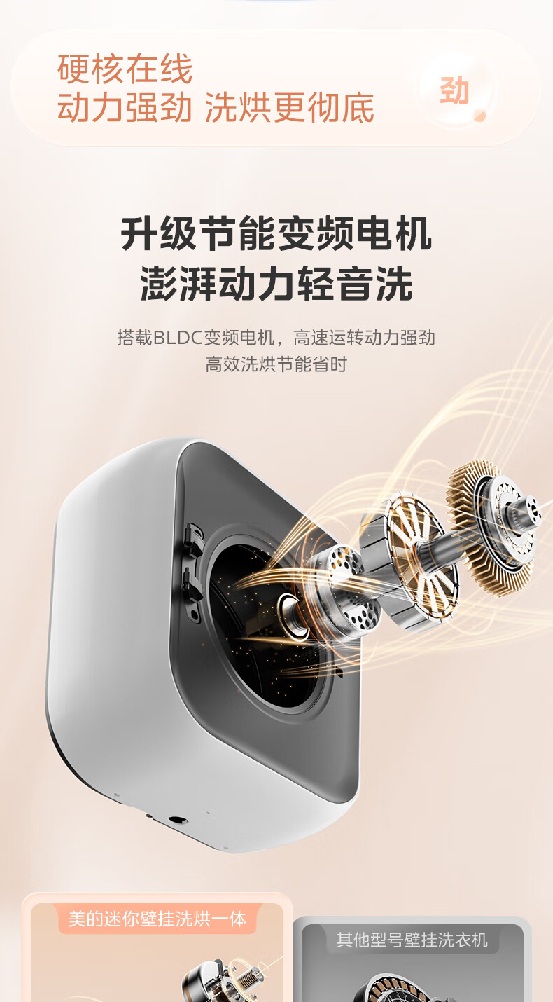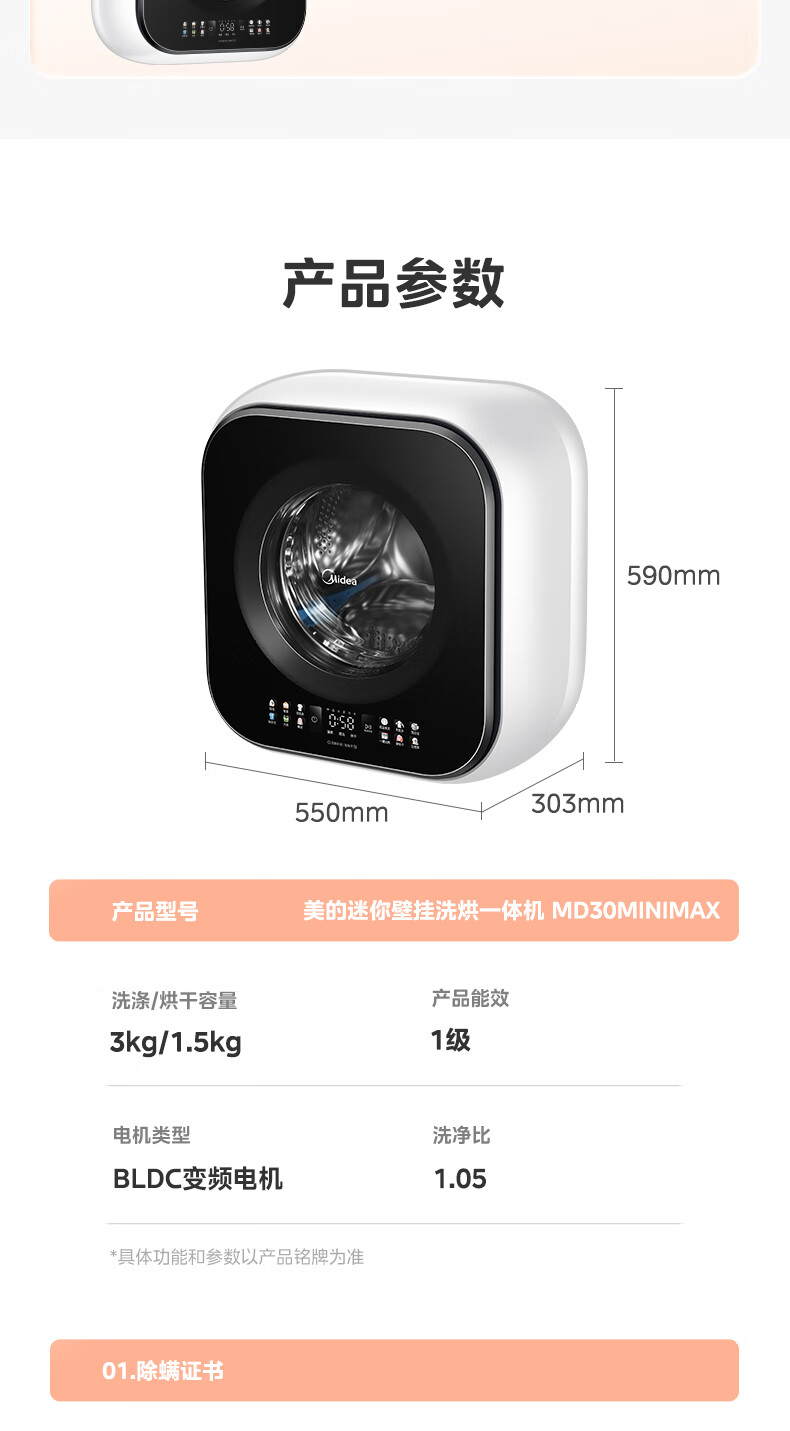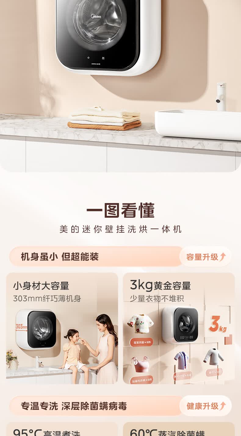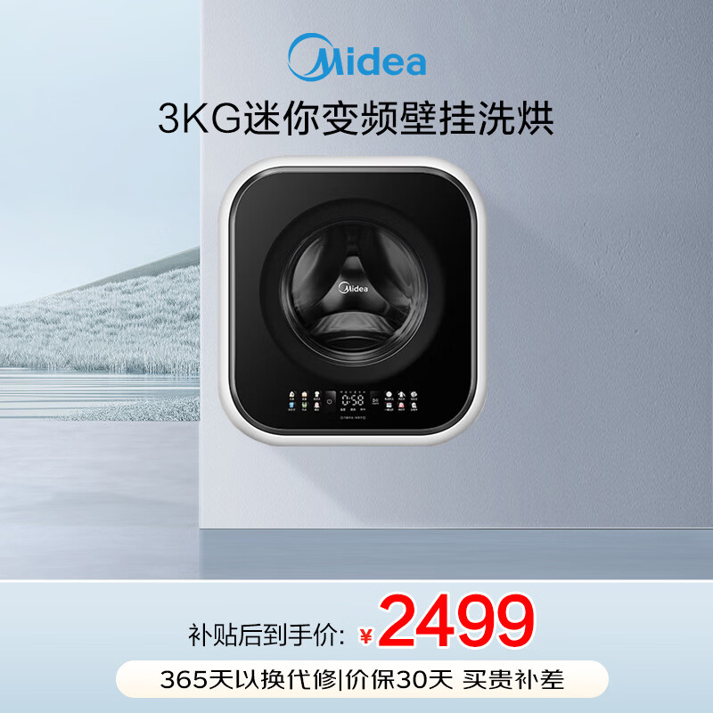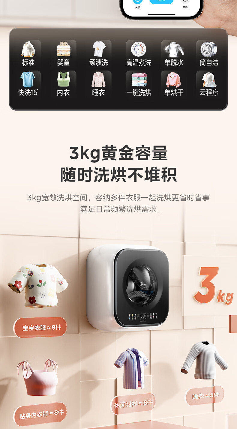 美的(Midea)壁挂滚筒洗衣机全自动3公斤带烘干洗烘一体机快速洗烘银离子除菌家电一级能效以旧换新 MD30MINIMAX