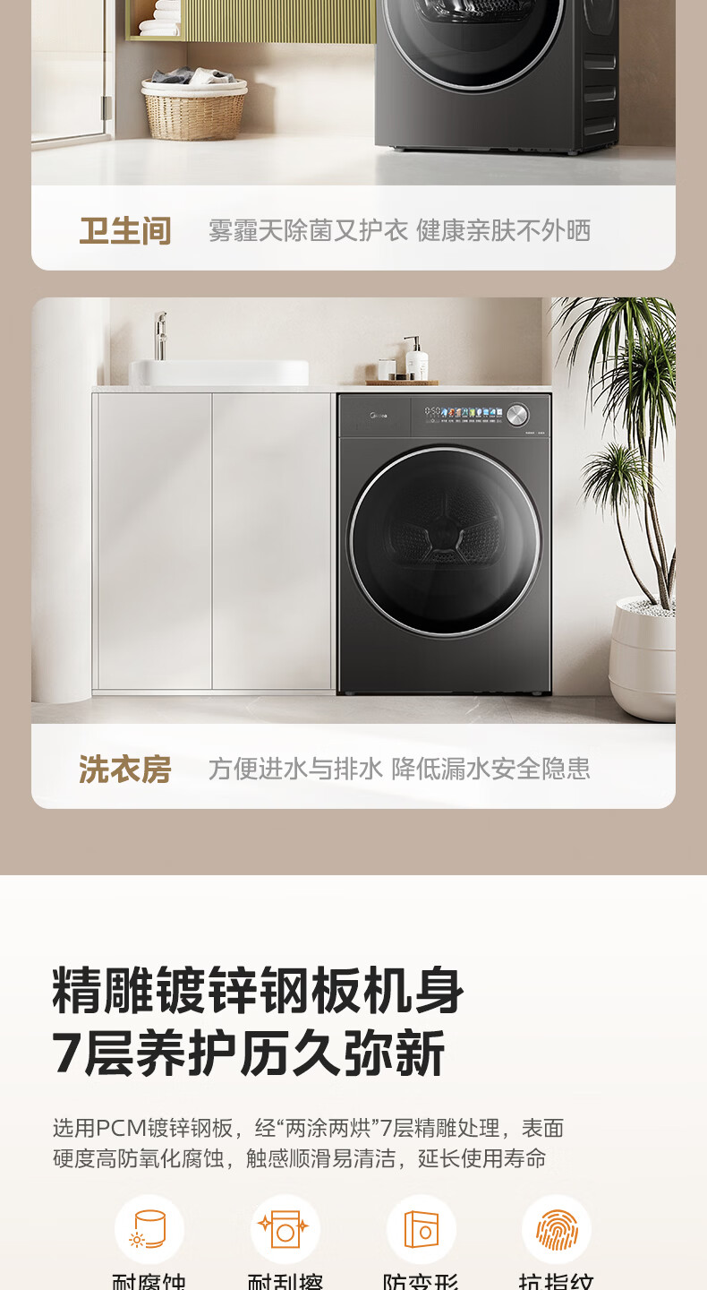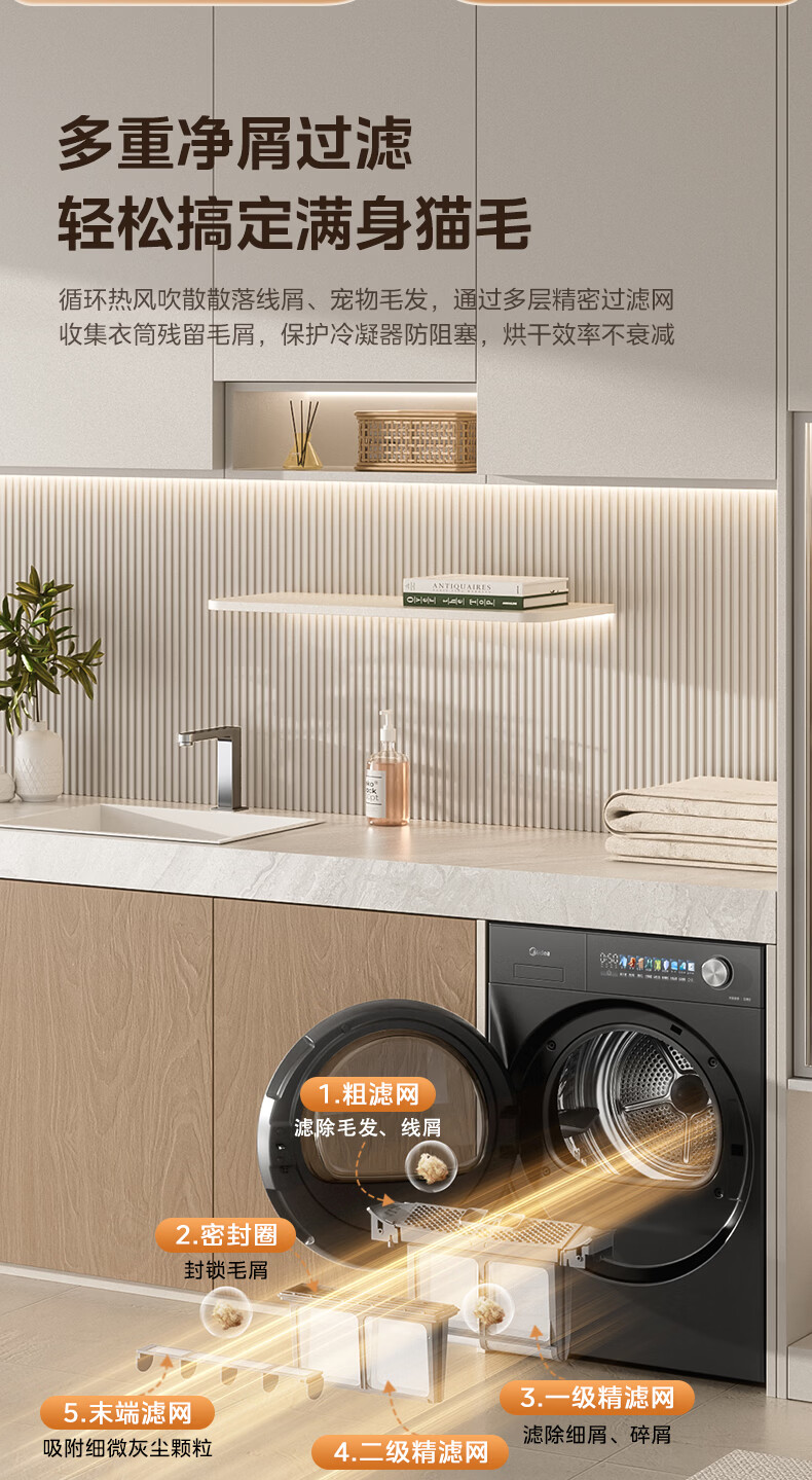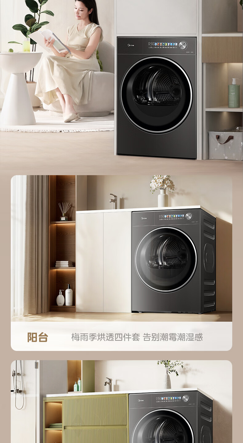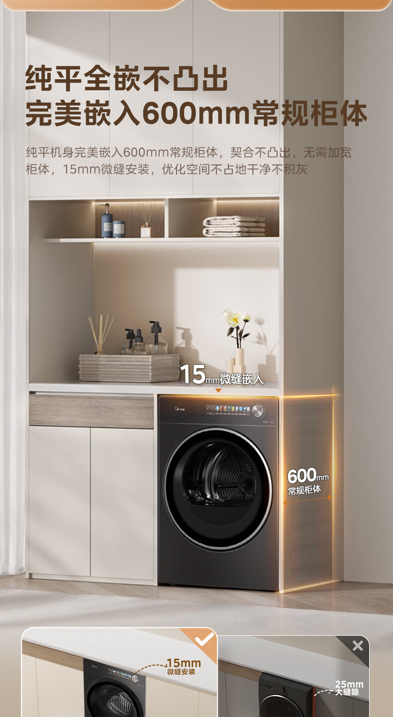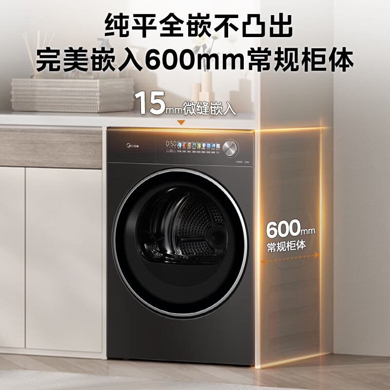 美的(Midea)10公斤热泵烘干机七维降噪智能判干AI正反转UV紫外线除螨变频电机纯平全嵌回南天 MH10HS50PRO