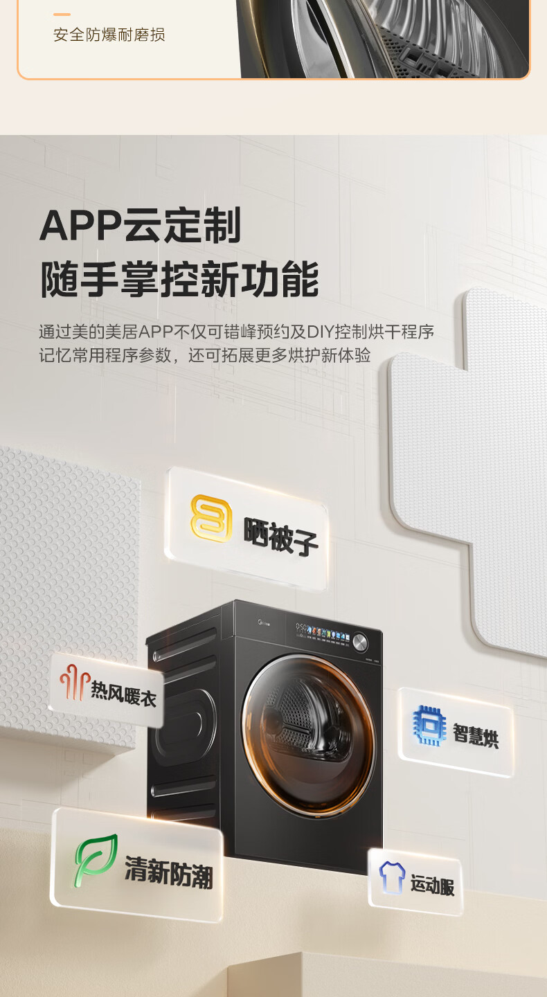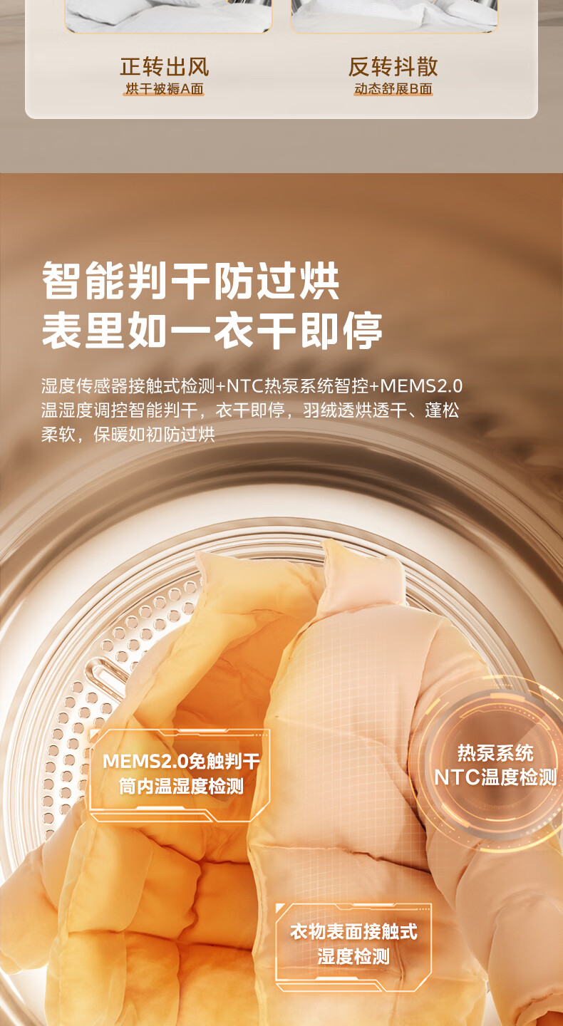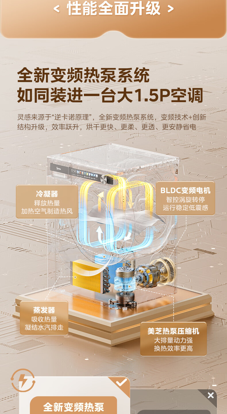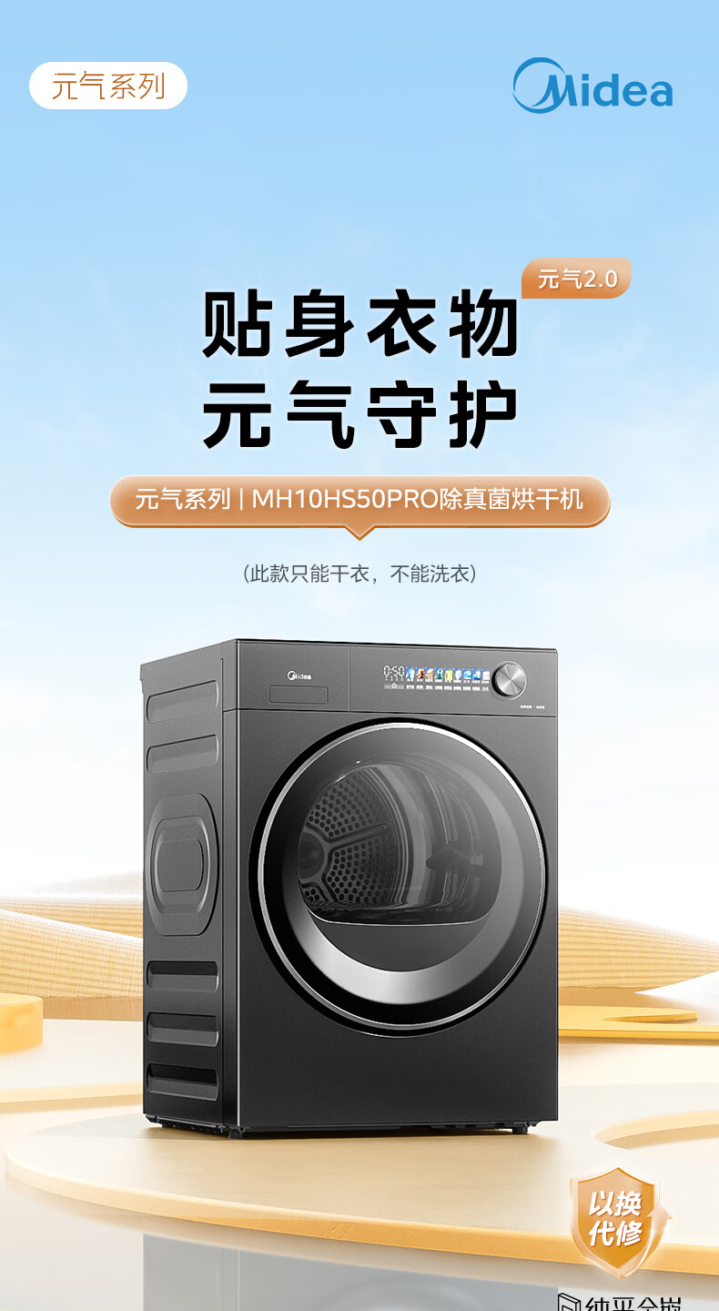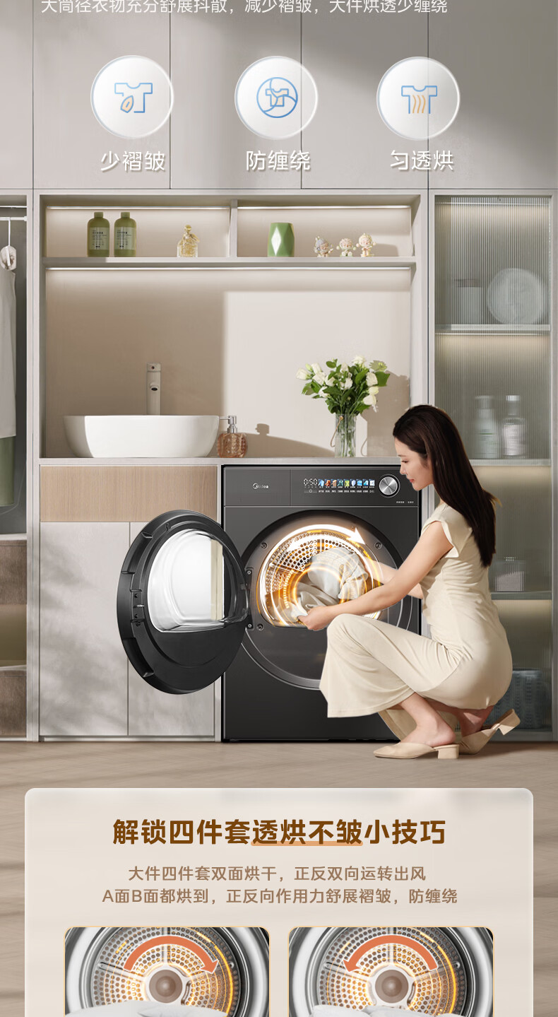 美的(Midea)10公斤热泵烘干机七维降噪智能判干AI正反转UV紫外线除螨变频电机纯平全嵌回南天 MH10HS50PRO