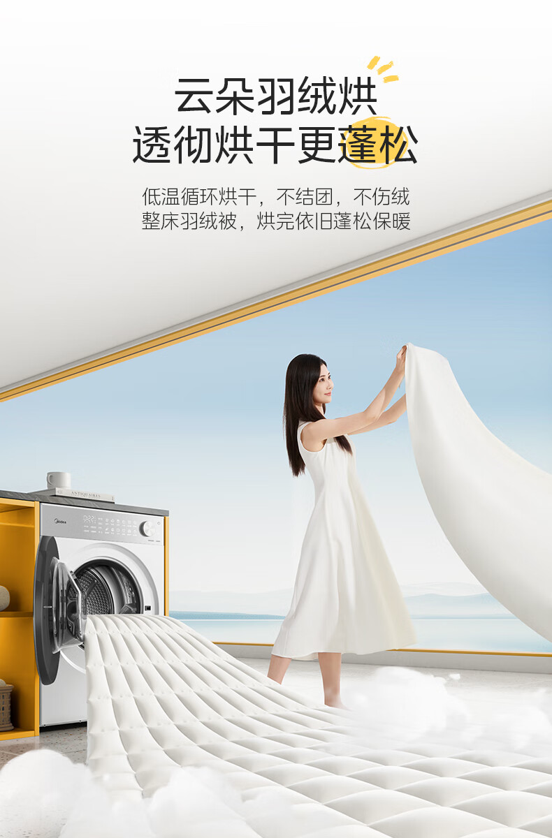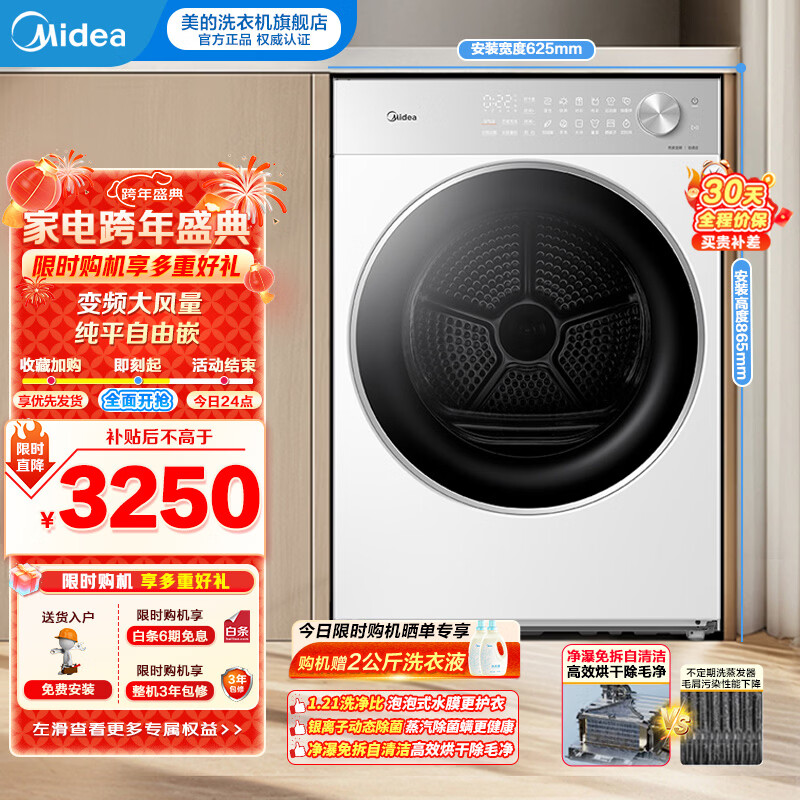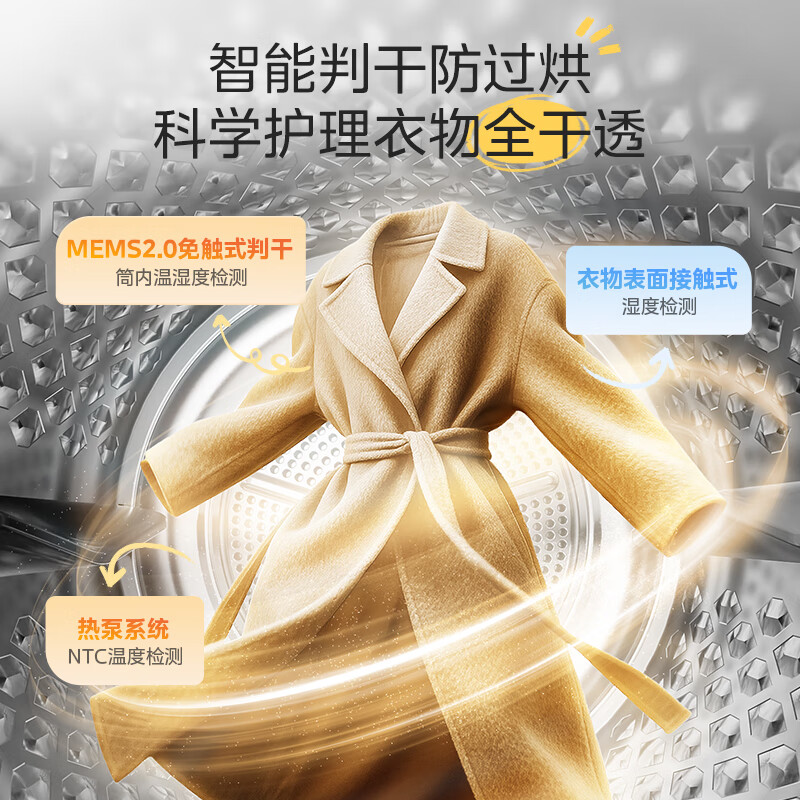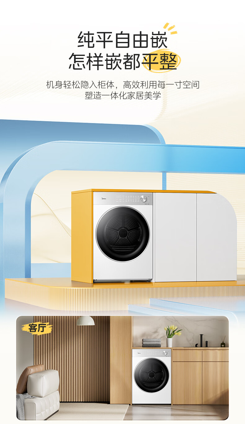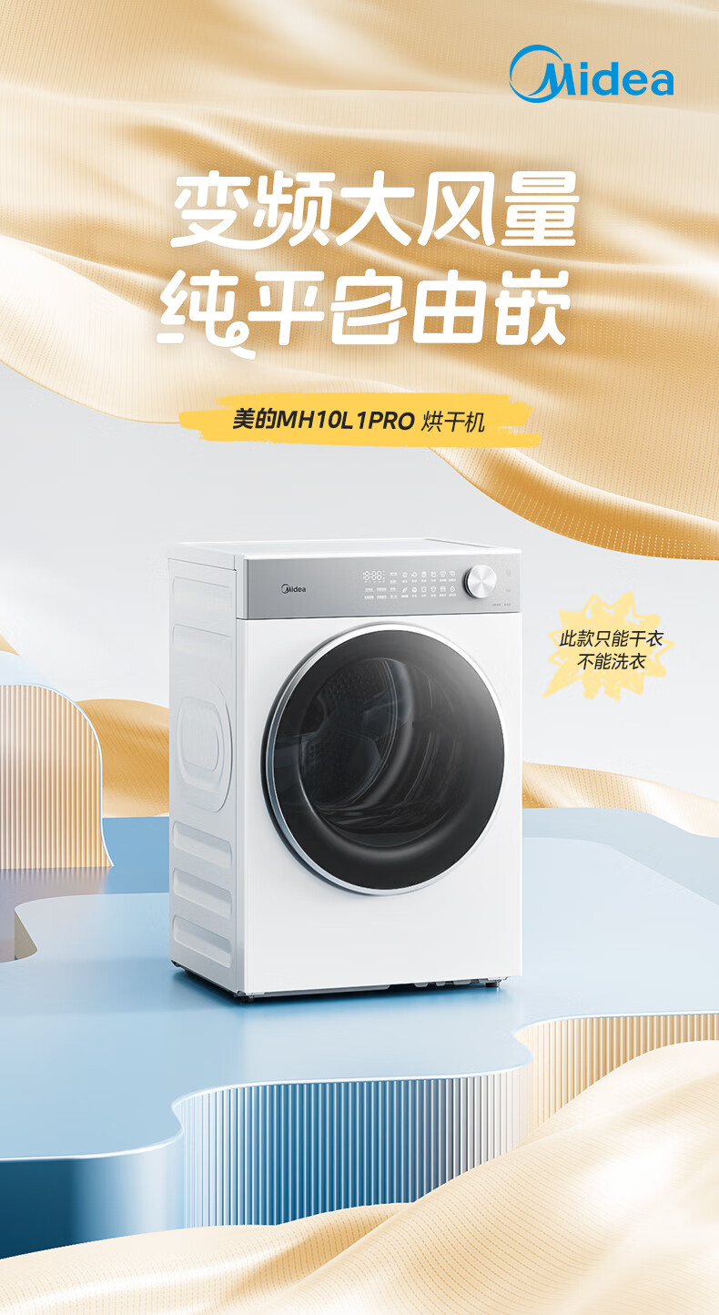 美的(Midea)10公斤热泵烘干机干衣机家用变频大风量纯平自由嵌羊毛蓝标智能判干 MH10L1PRO