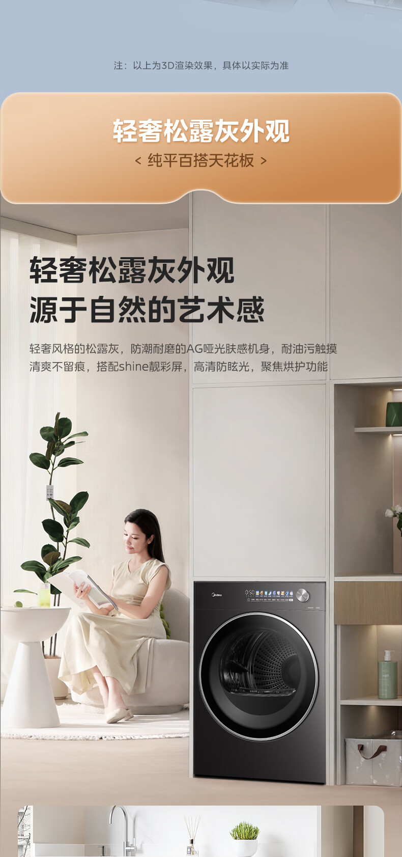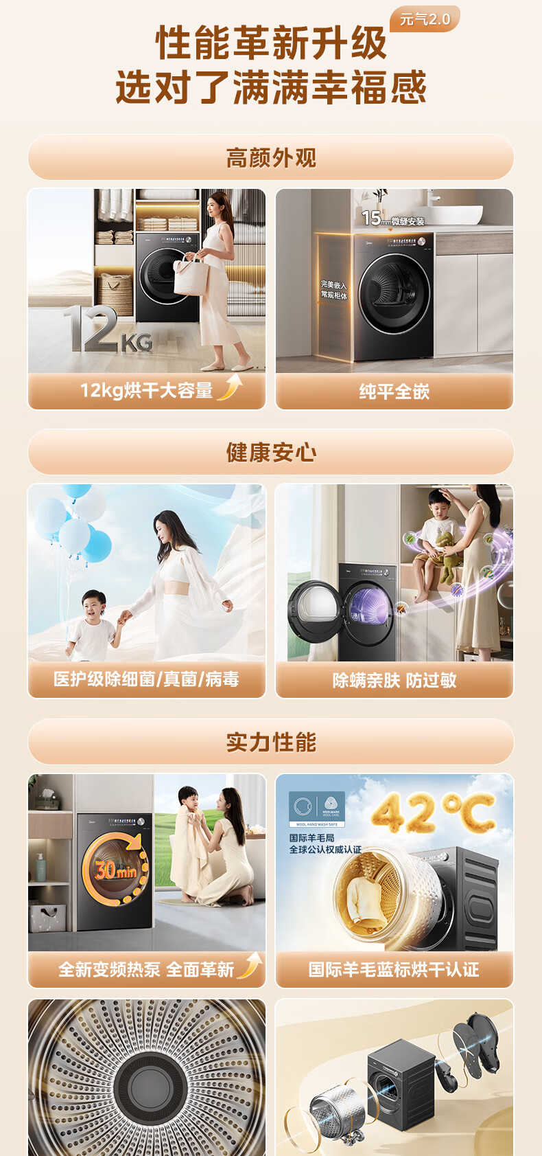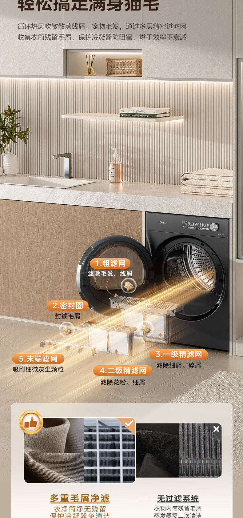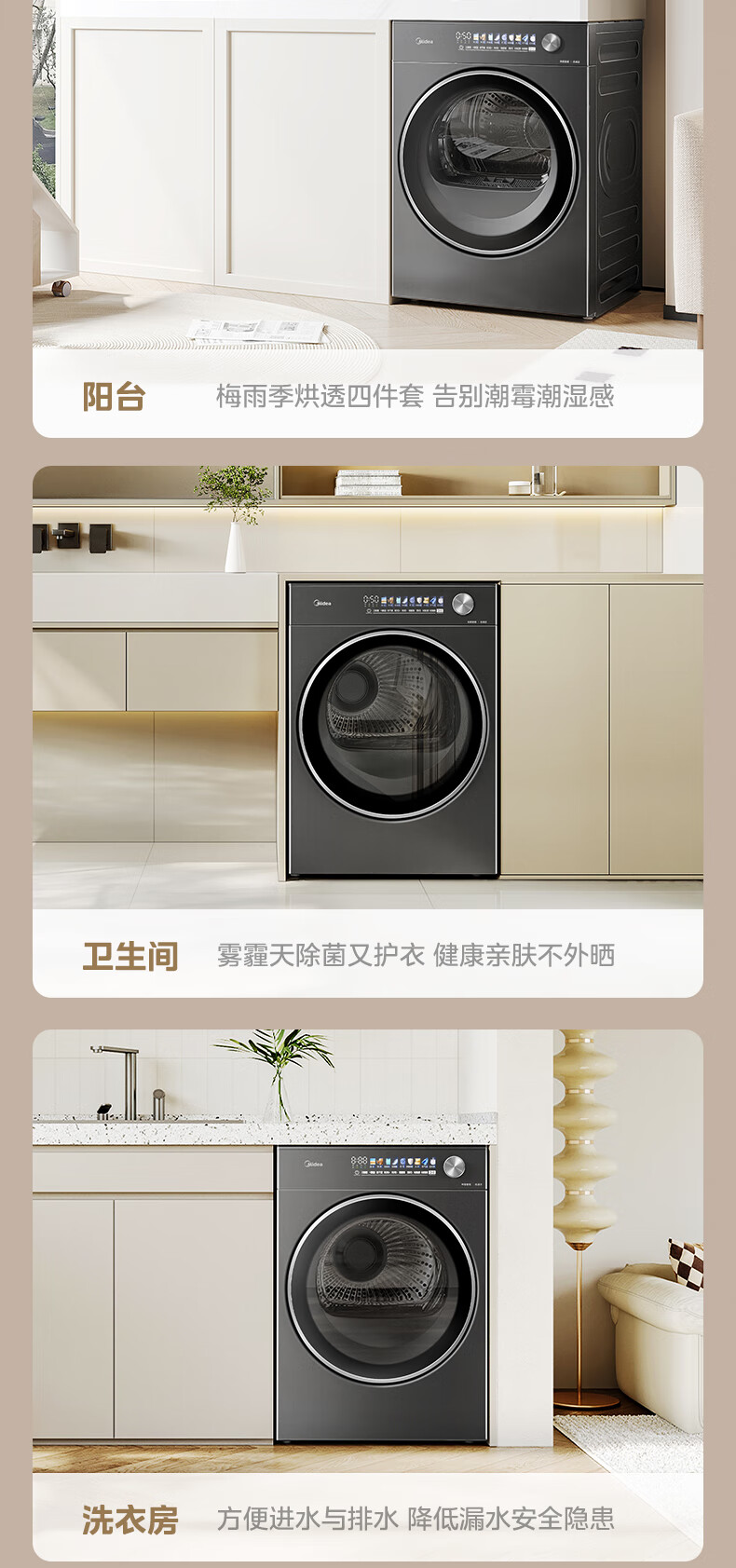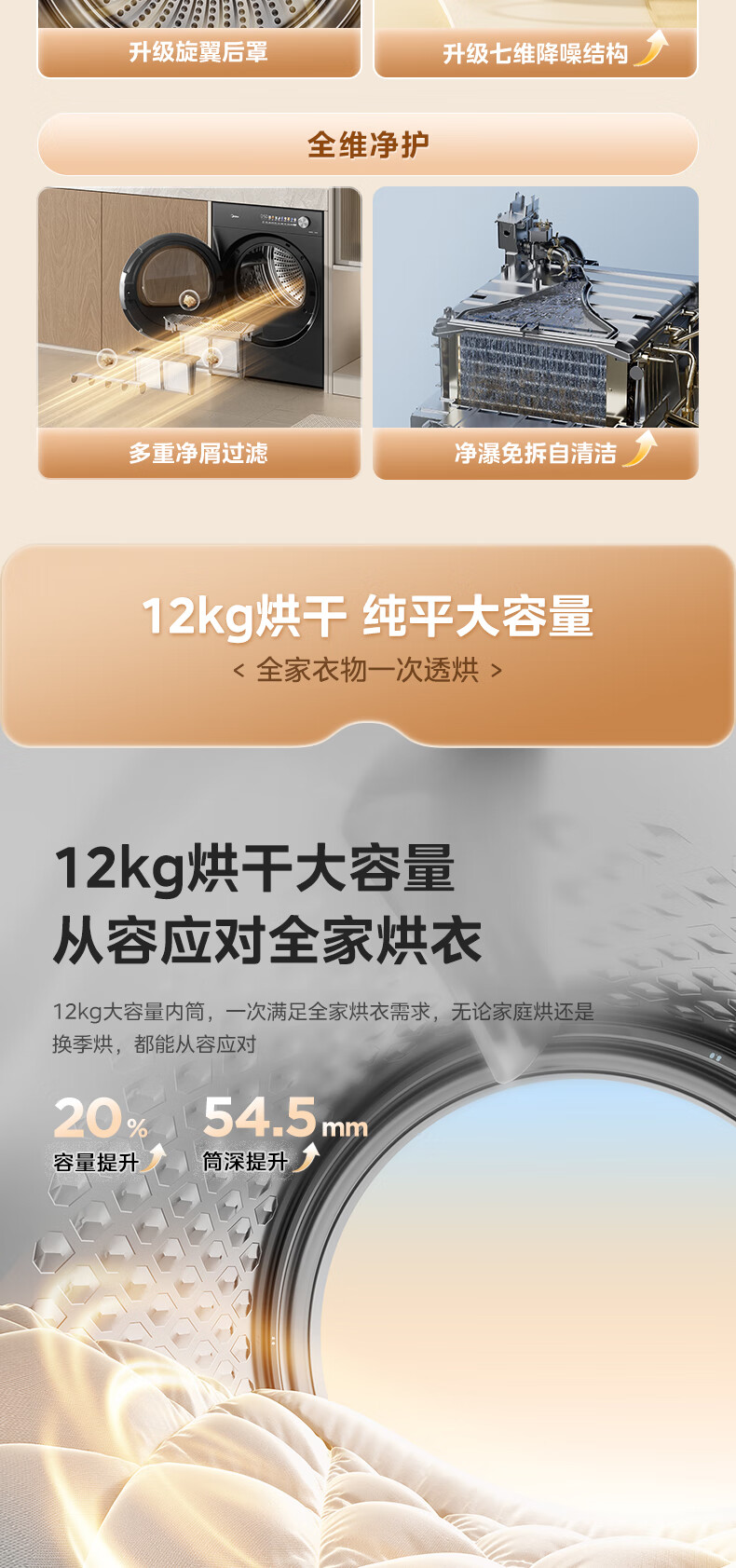 美的(Midea)12kg热泵烘干机家用大容量变频医护级除菌纯平全嵌七维降噪AI正反转 MH12L5PROMAX
