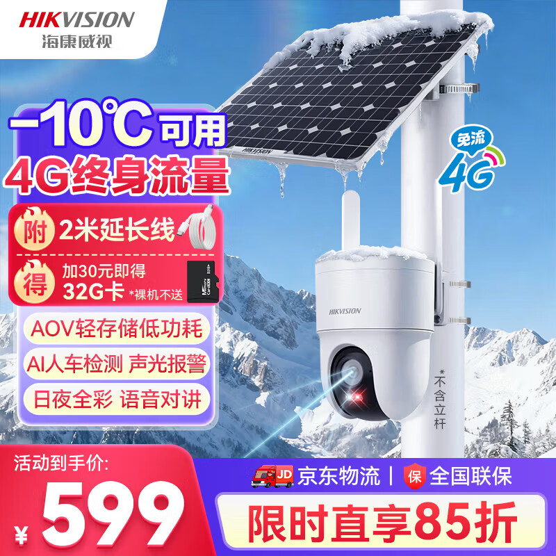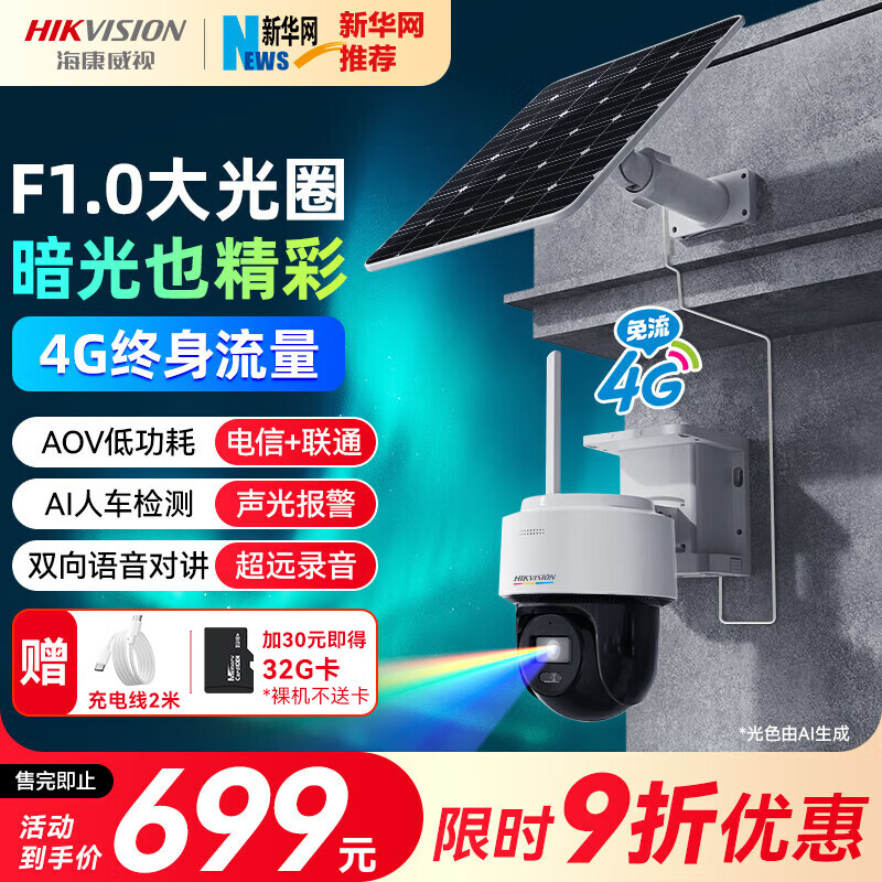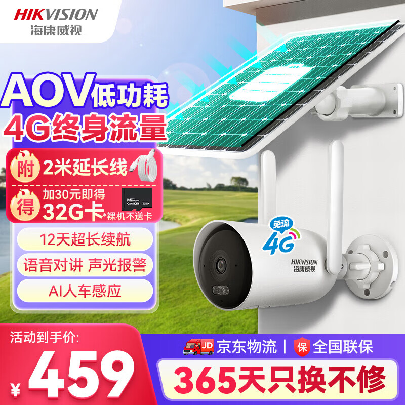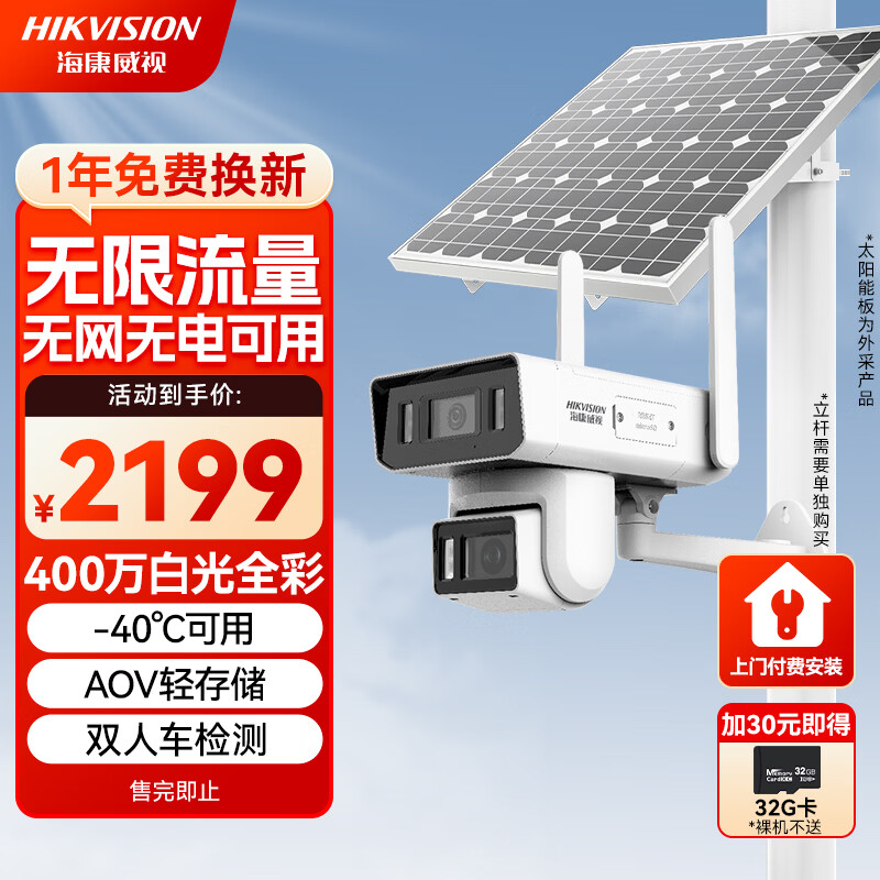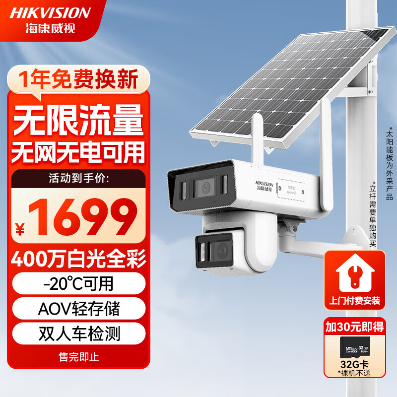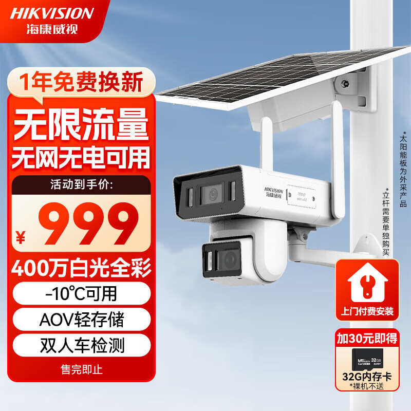 HIKVISION海康威视太阳能摄像头免插电800万双摄家用室外4G终身免流量360度无死角AOV户外监控器手机远程T4