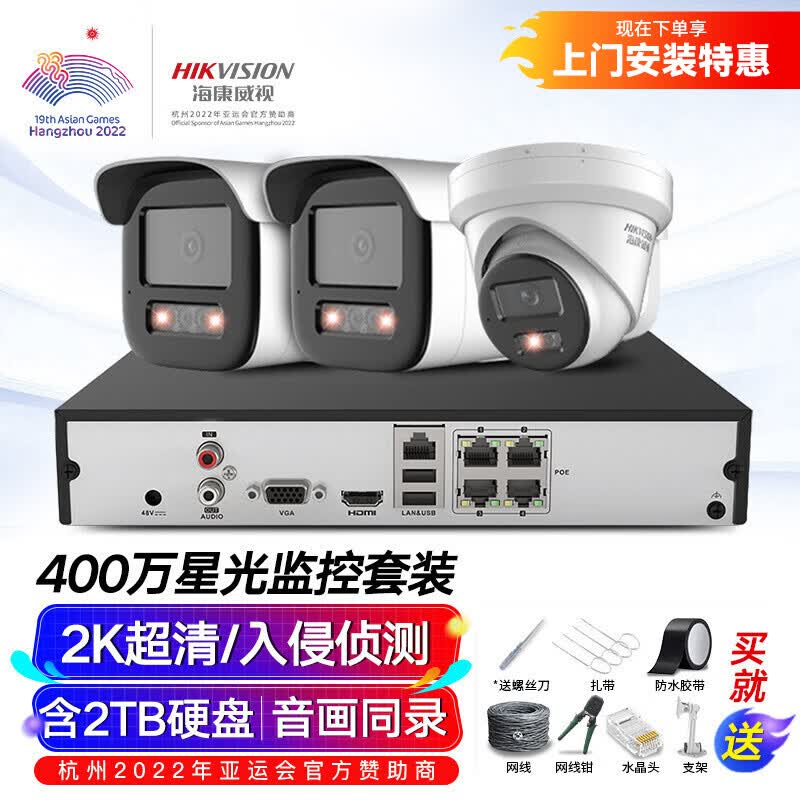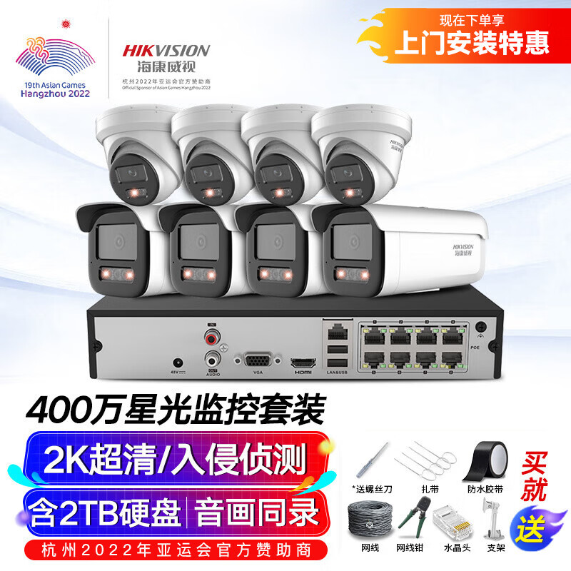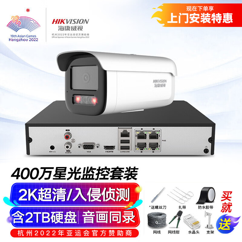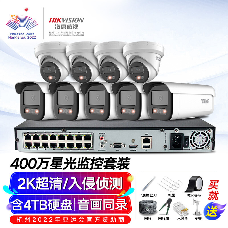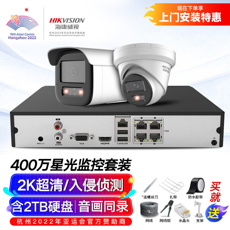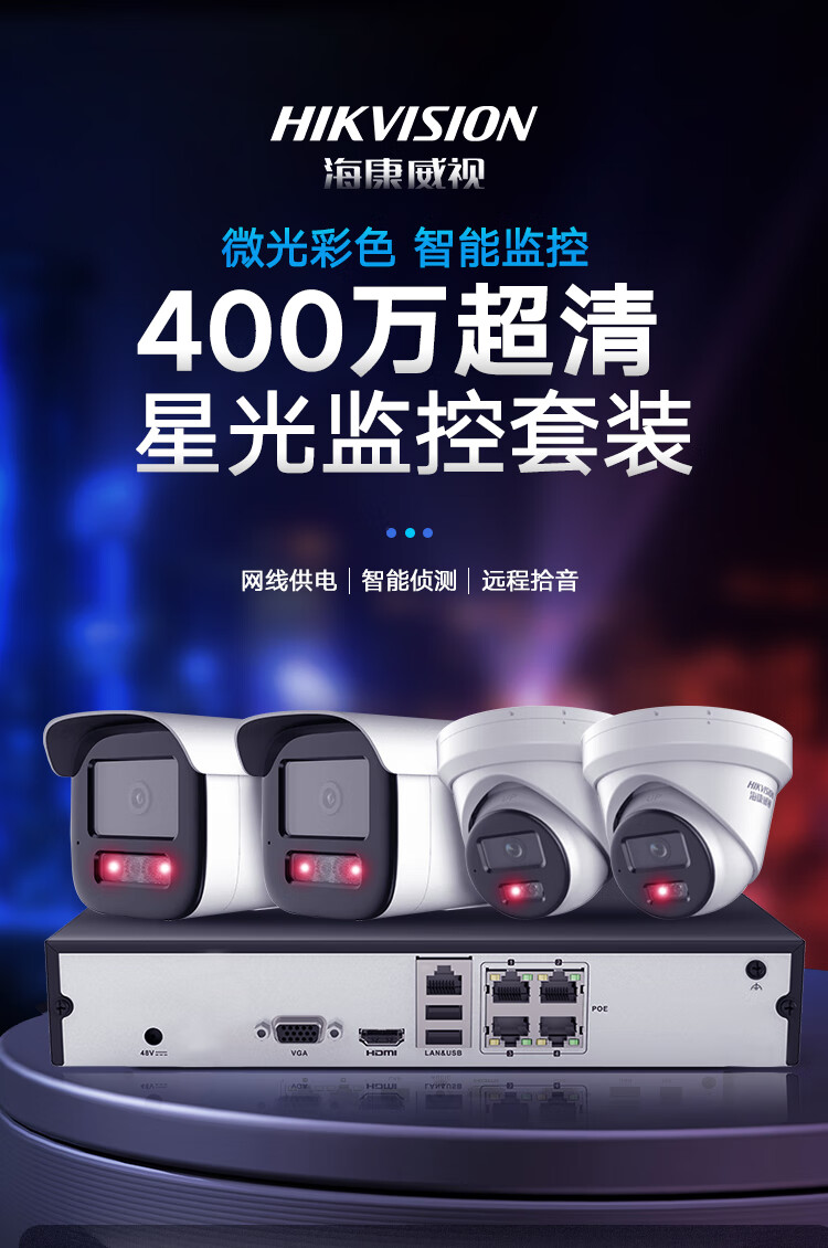 HIKVISION海康威视监控套装摄像头解决方案400万星光夜视2K高清拾音室外防尘防水poe网线供电4路2T硬盘3T46